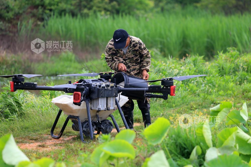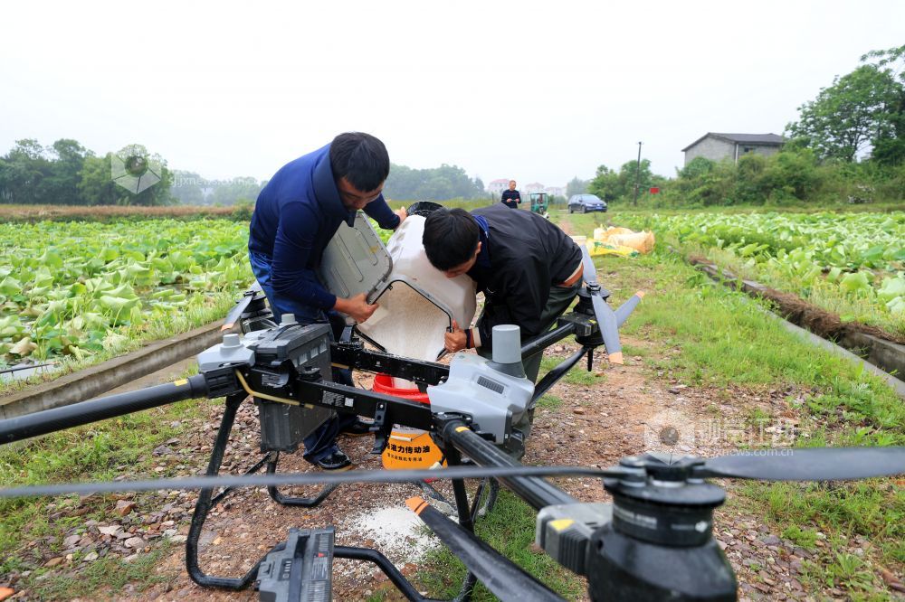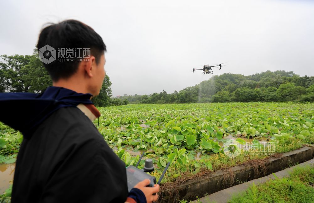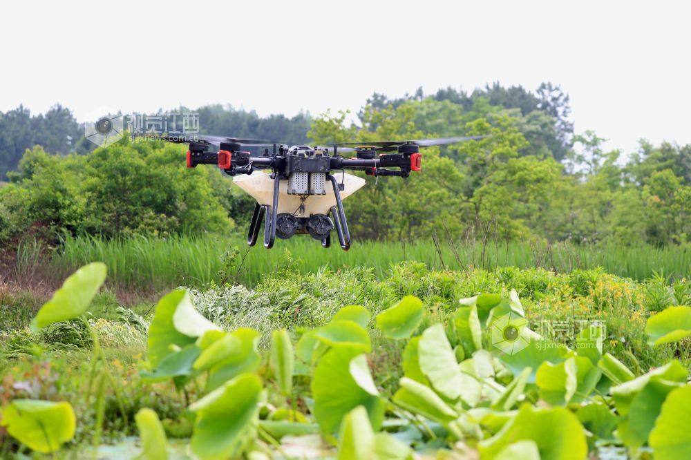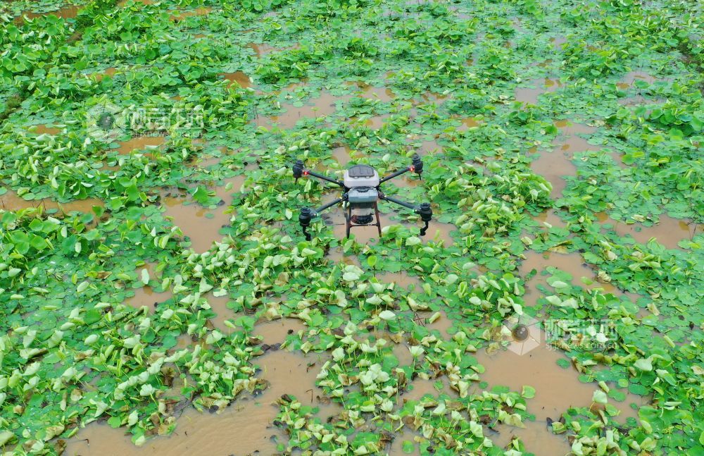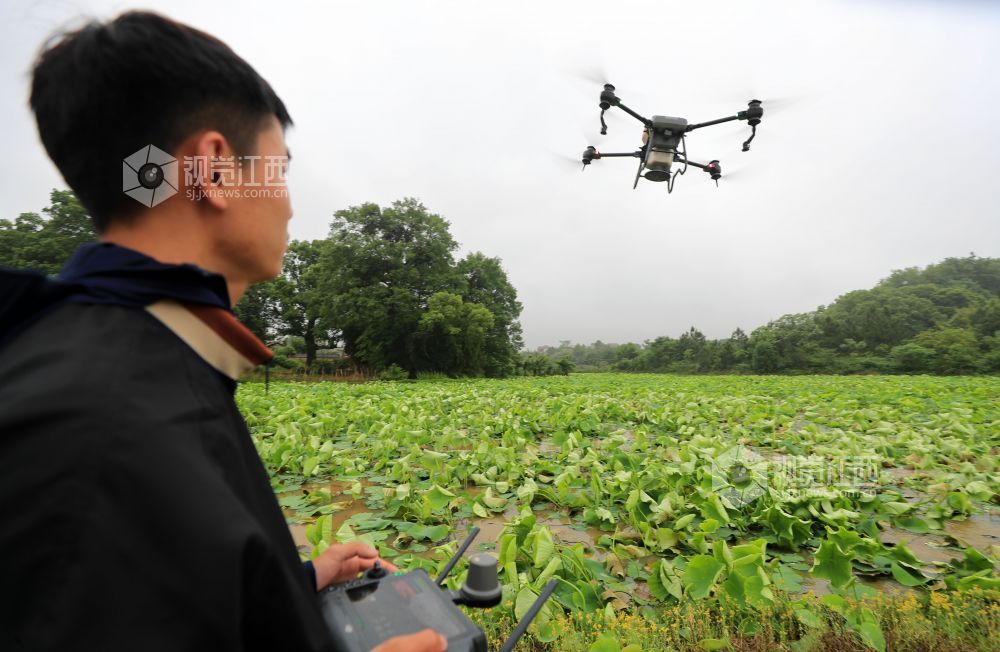 4月23日,在江西省吉安市泰和县荷瑞生态农业莲藕种植基地,无人机正在给莲藕施肥,助力春季田间管理。