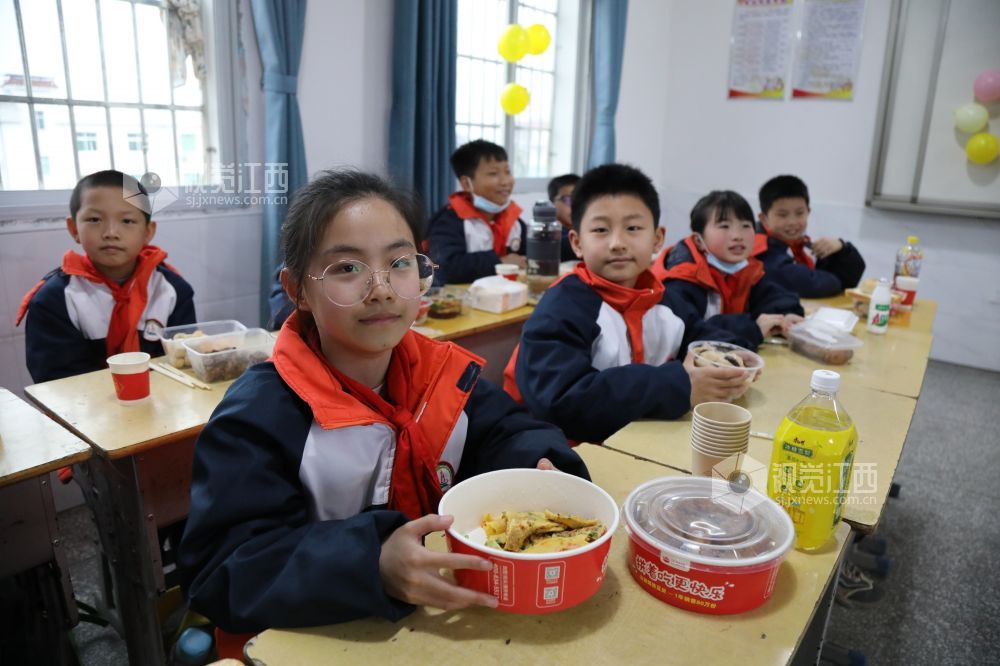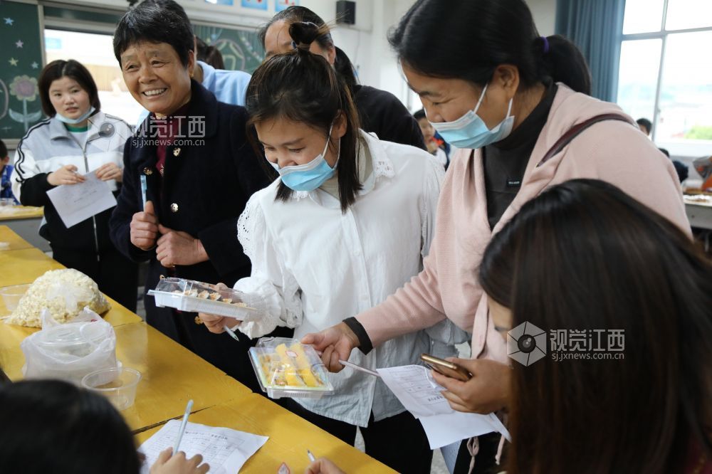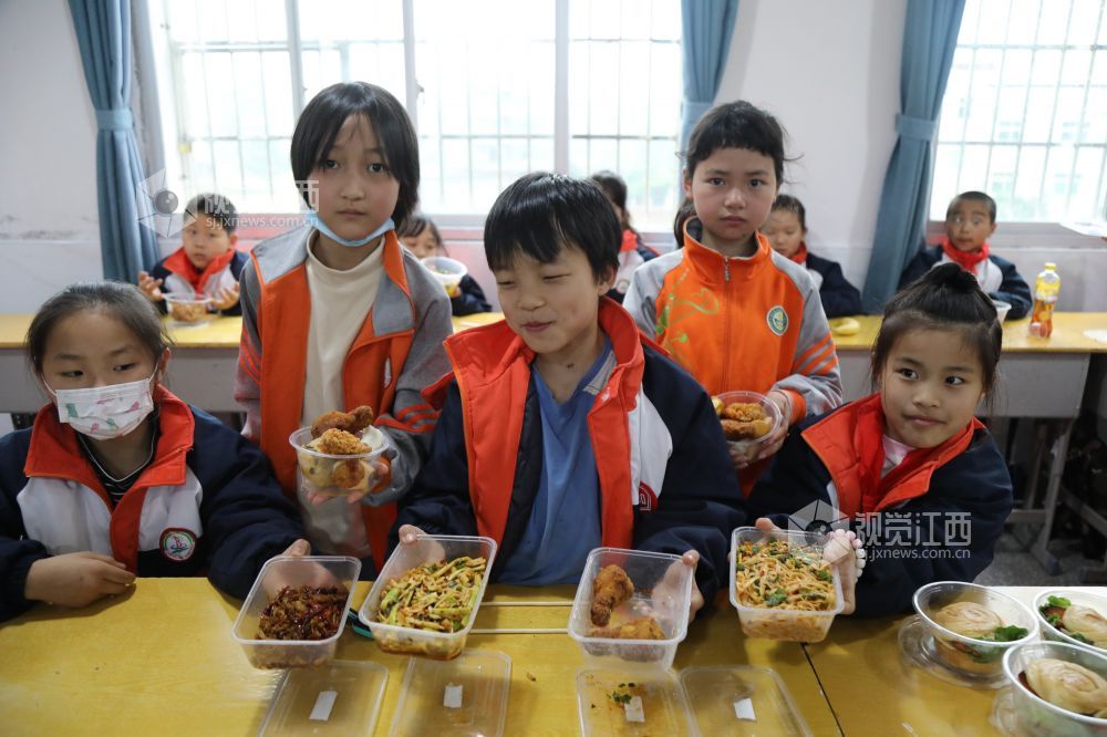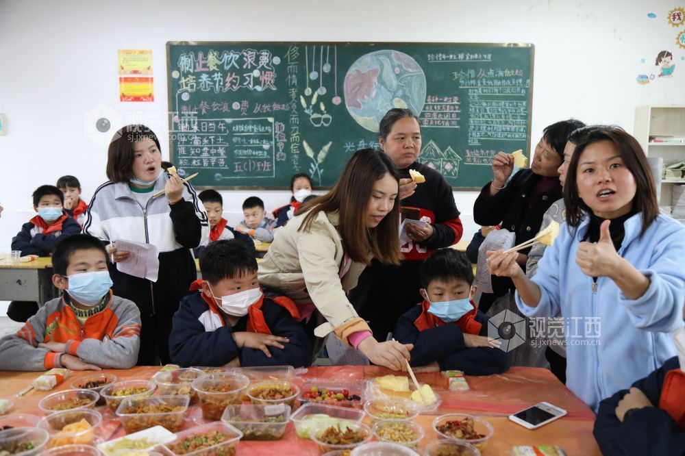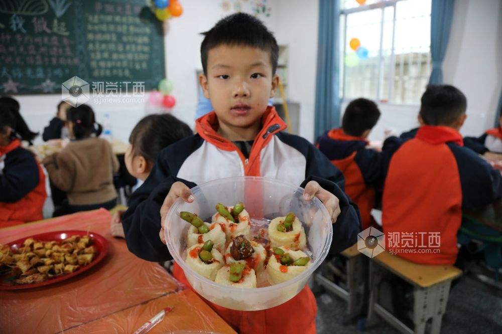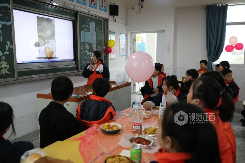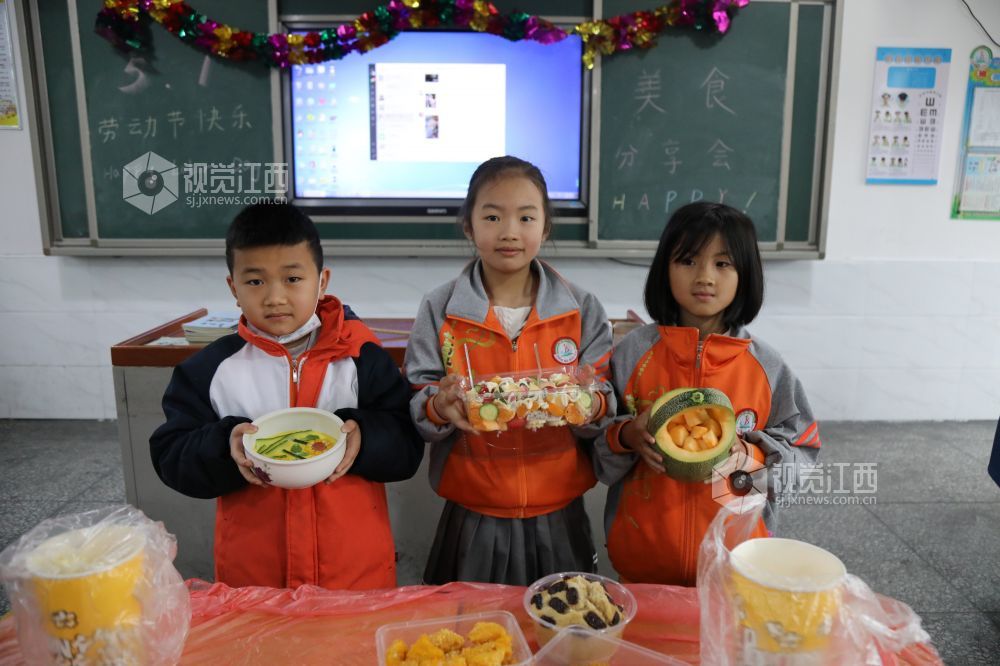 4月28日,江西省莲花县城北小学教室内,同学们展示、分享自己在家长的指导下制作的美食。当天,值五一劳动节到来之际,为培养学生从小爱劳动的习惯,学会更多的劳动技能,城北小学开展“劳动光荣,分享美食”主题活动,学生在家长的指导下在家里完成制作特色美食,可以是菜肴、糕点、小吃,也可以是水果,取好名字,并拍视频记录制作过程。然后带到学校班级展示,学校聘请家长委员会成员与老师一起组成评委会,对学生制作的美食进行评比,最后评出10个最佳美食奖。