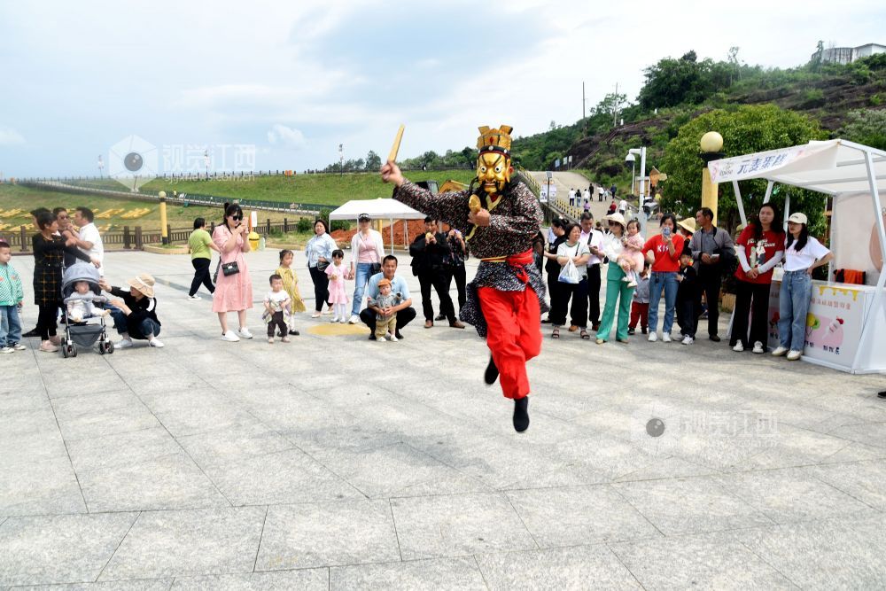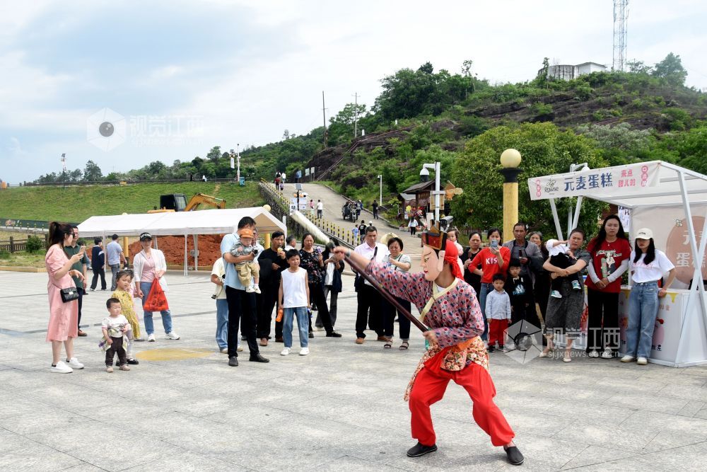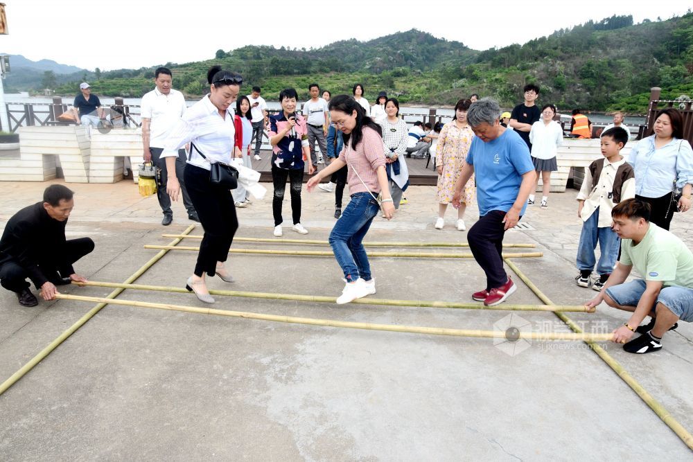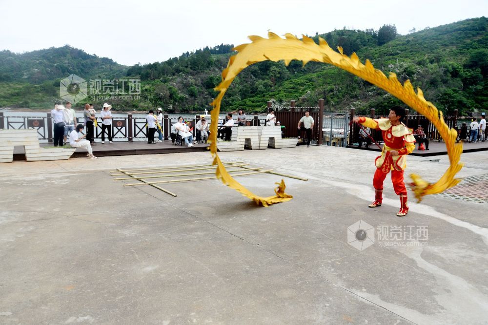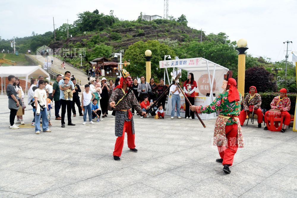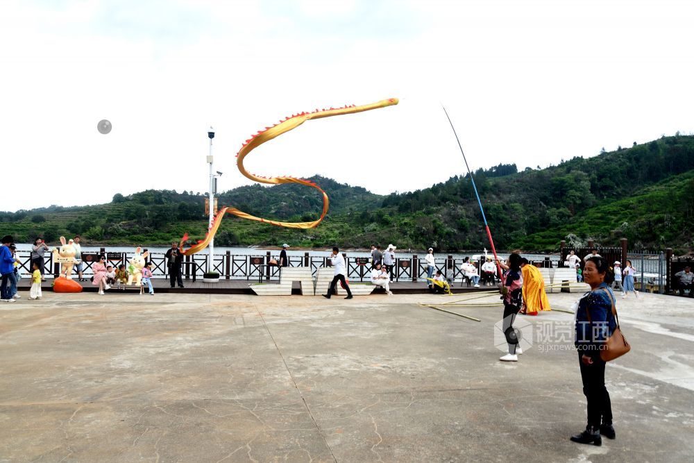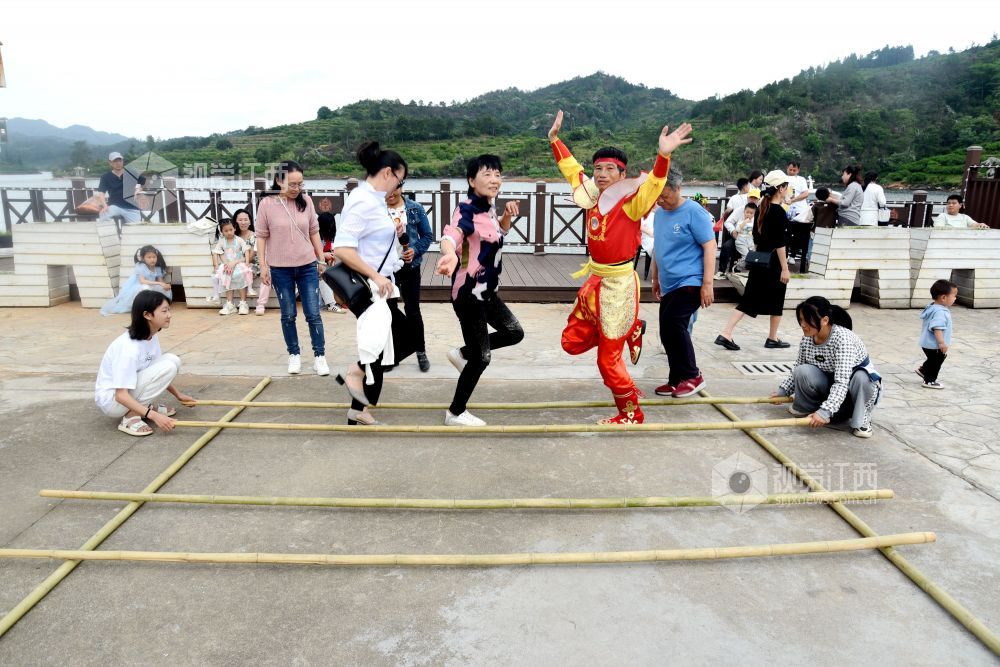 2023年5月3日,在江西省抚州市南丰县蜜桔湖景区,游客在观看南丰傩舞表演,跳起竹竿舞,丰富的文体节目,受到越来越多市民和游客的青睐。