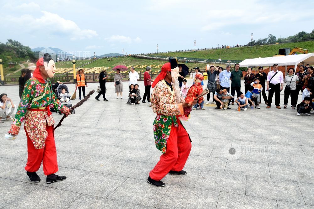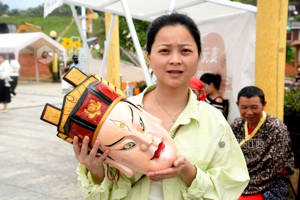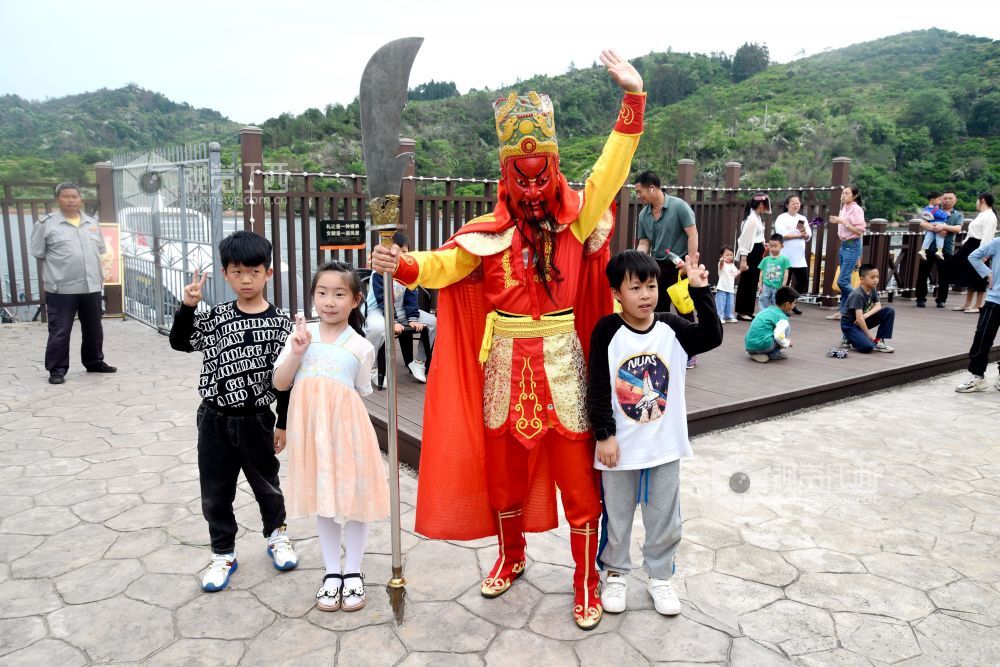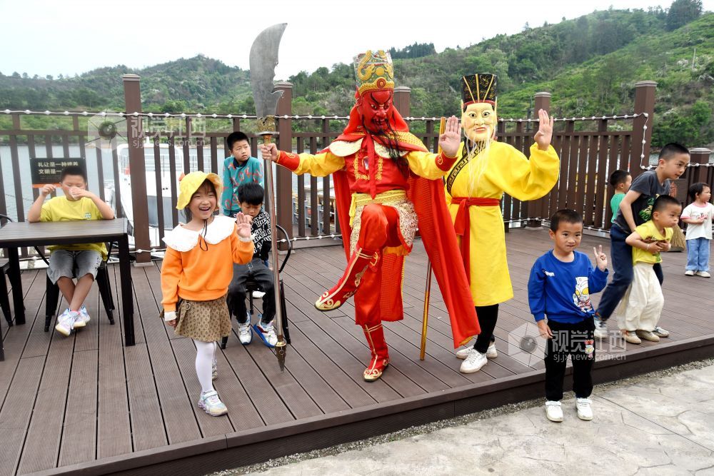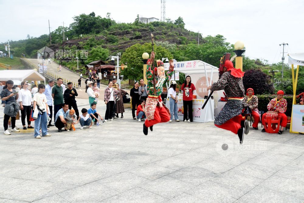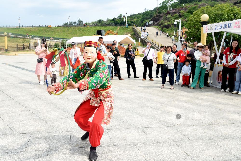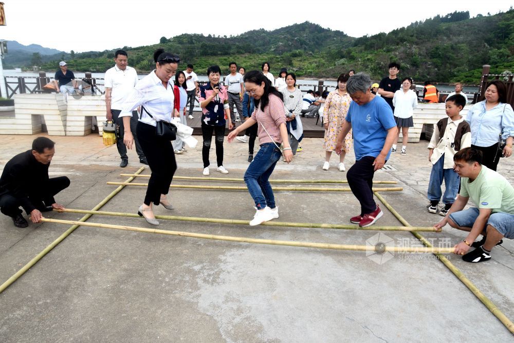 2023年5月3日,在江西省抚州市南丰县蜜桔湖景区,游客在观看南丰傩舞表演,跳起竹竿舞,丰富的文体节目,受到越来越多市民和游客的青睐。