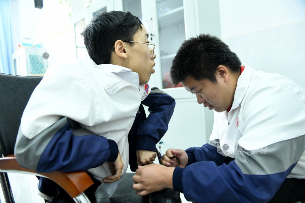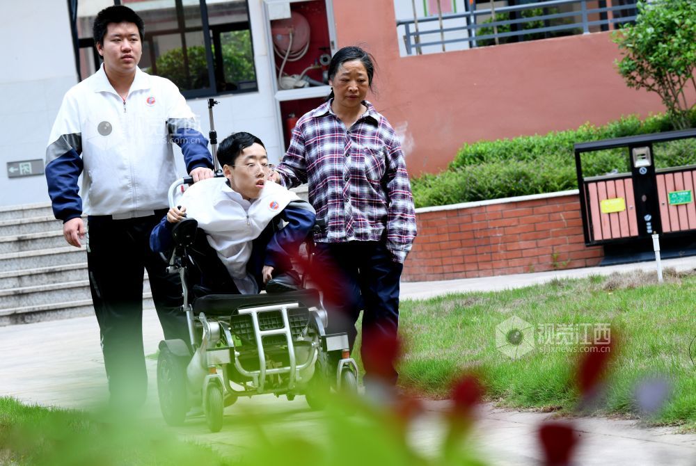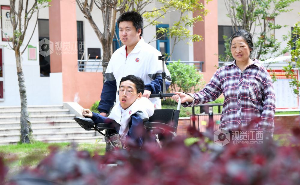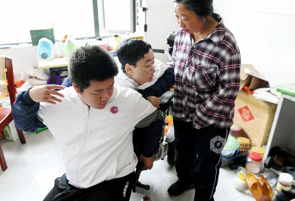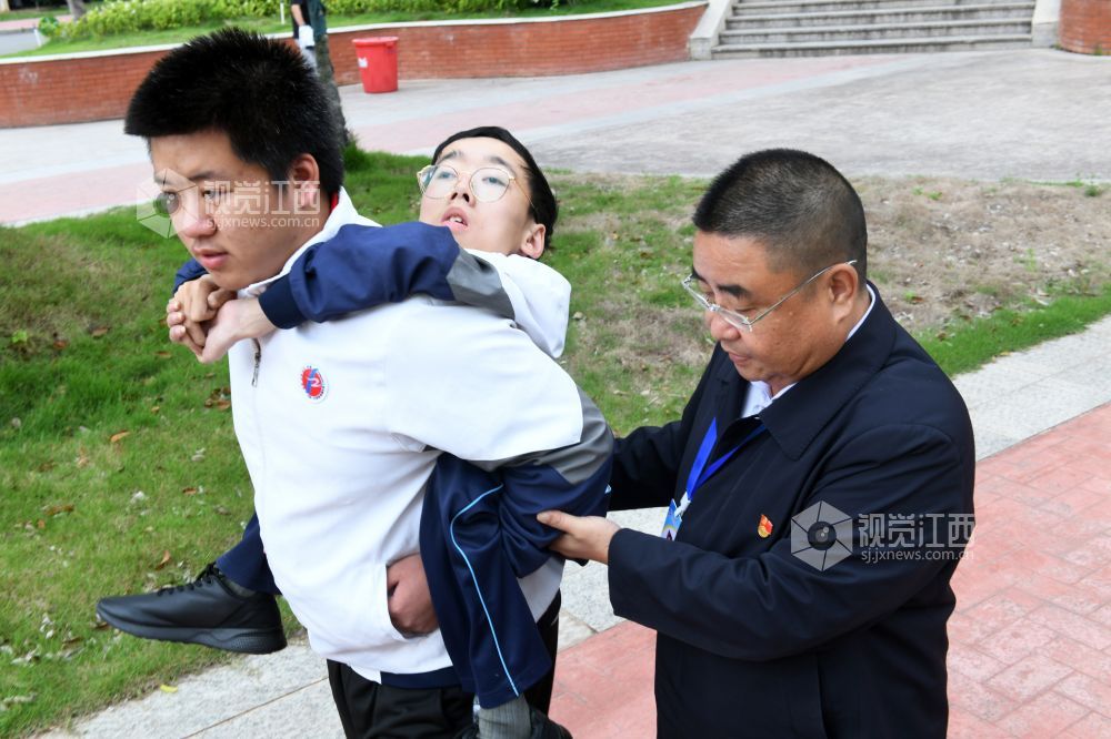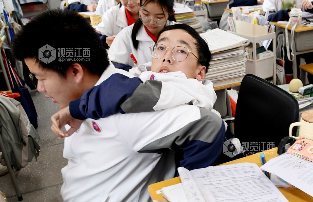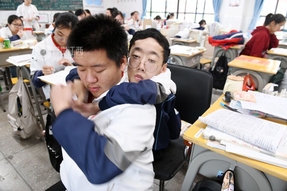 朱金祥和钟华强是江西省南康中学北校区高三年级的学生,也是来自江西省赣州市南康区麻双乡麻双村的老乡。从小学三年级至今,朱金祥已背了钟华强10年。进出教室、上卫生间、散步、购物……,他们几乎形影不离。而钟华强虽然身体不好,却非常幽默、坚强,学习成绩优异,这也让朱金祥感到钦佩。