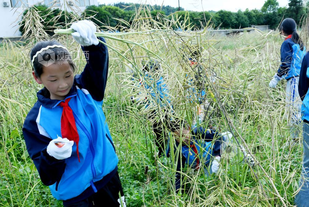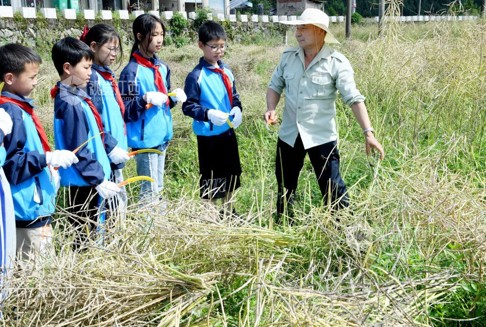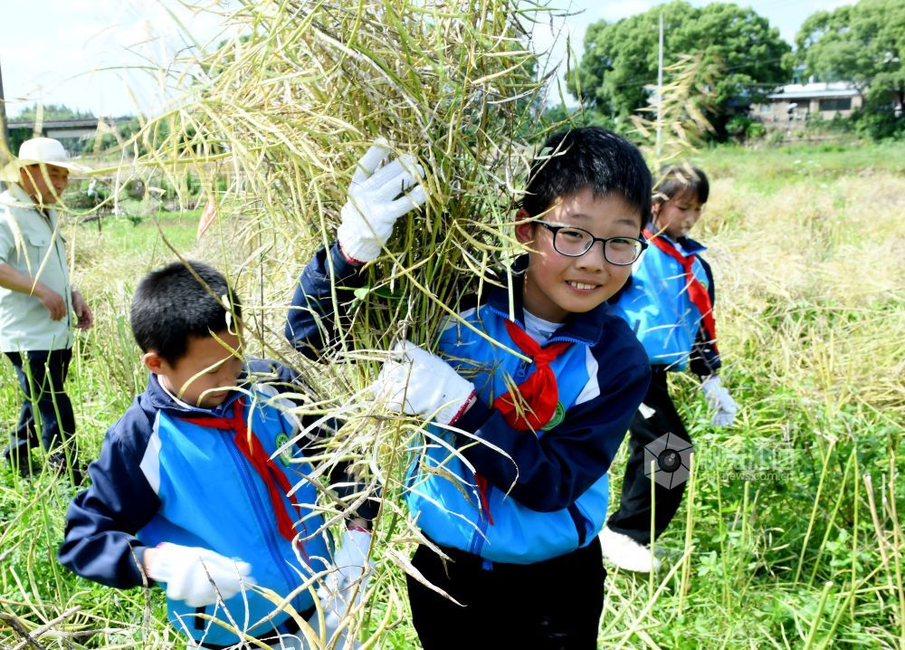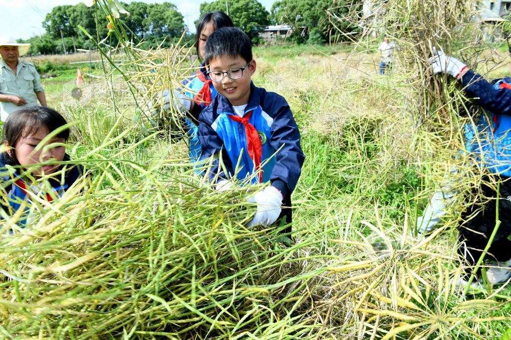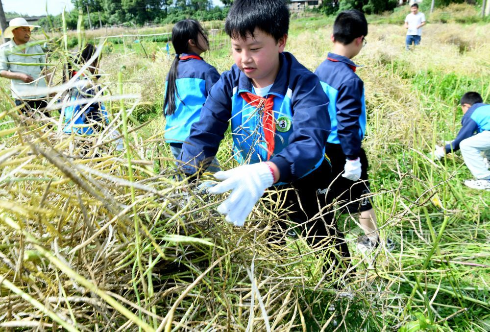 2023年5月8日,江西省婺源县的小学生们正在帮助该县太白镇农家收割油菜,体验劳动带来的快乐。