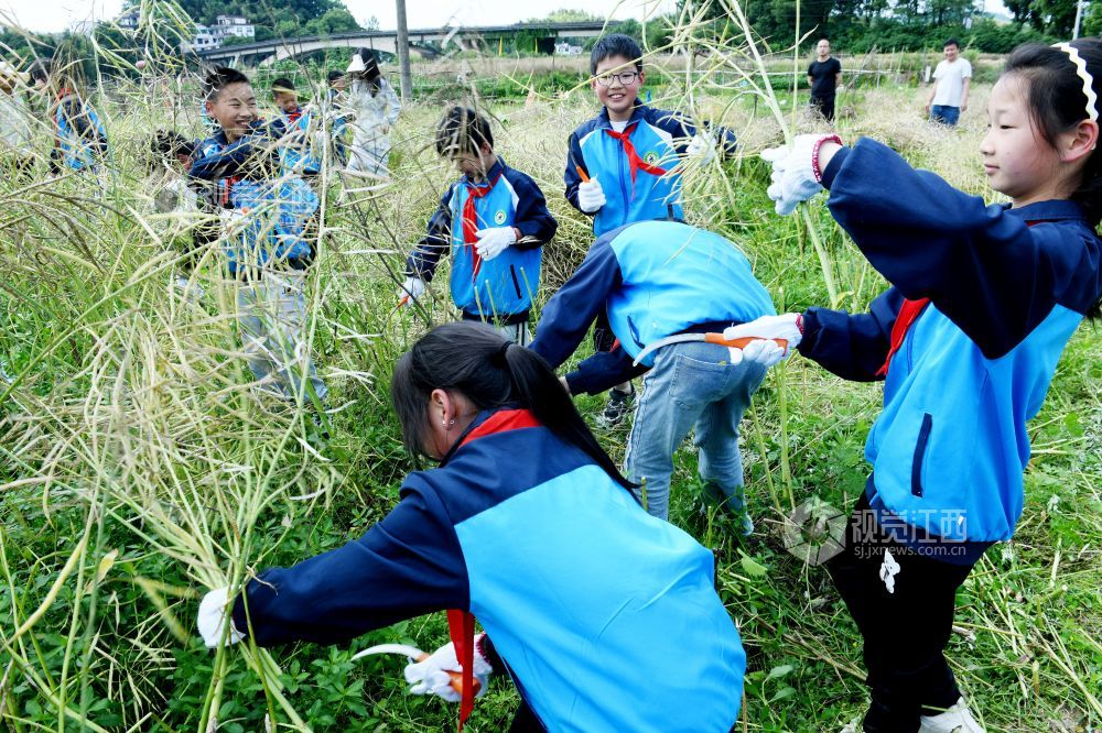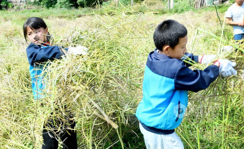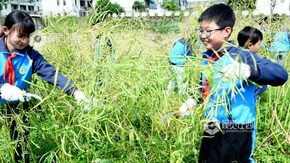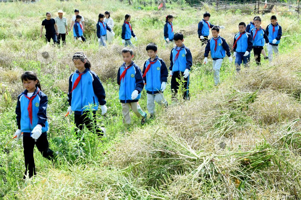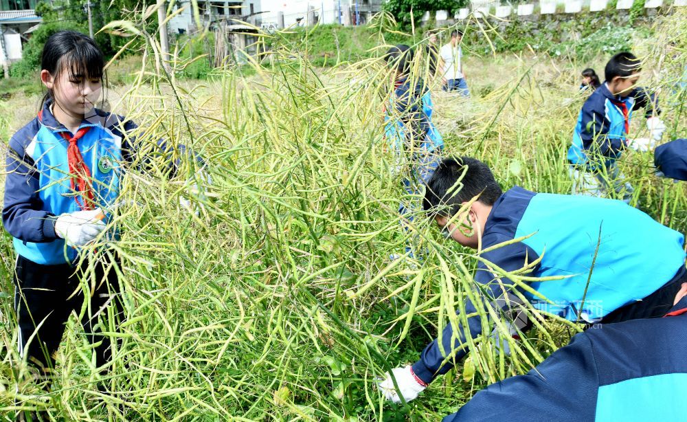 2023年5月8日,江西省婺源县的小学生们正在帮助该县太白镇农家收割油菜,体验劳动带来的快乐。