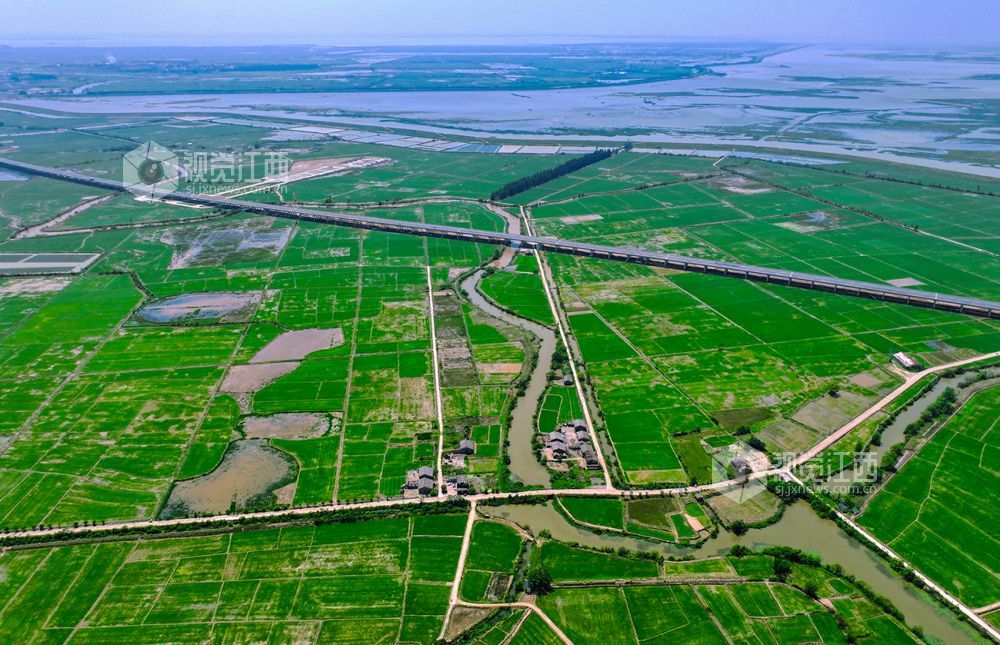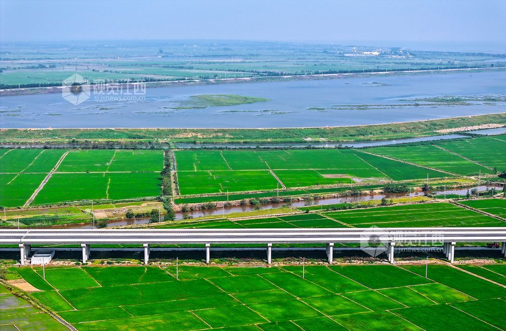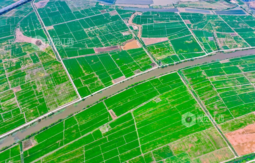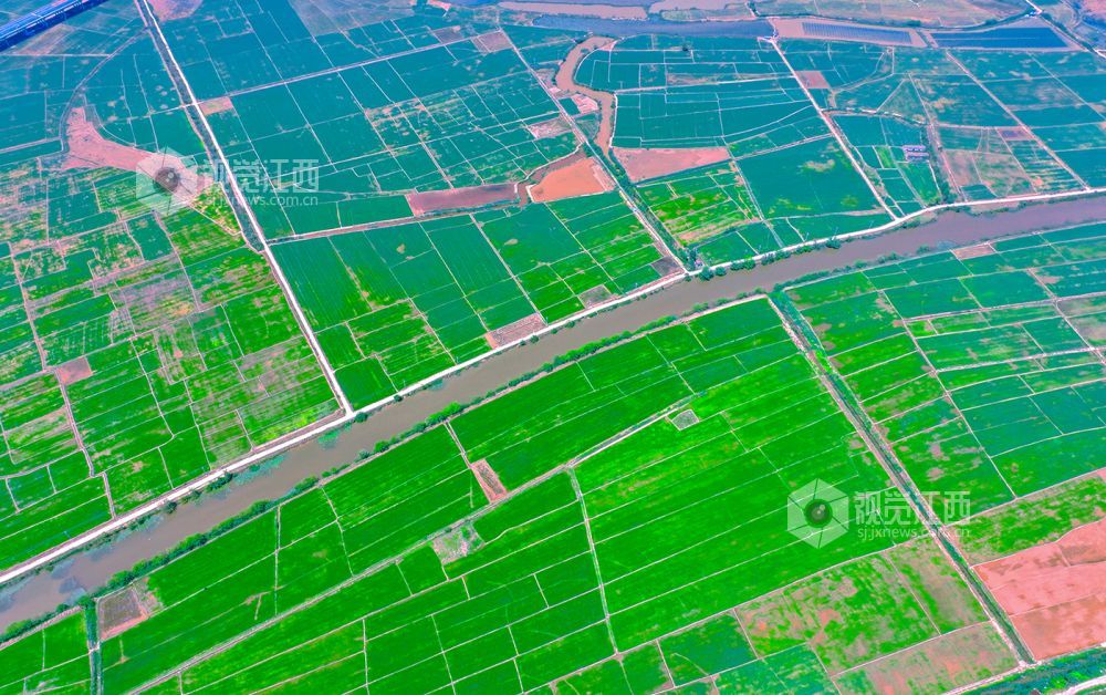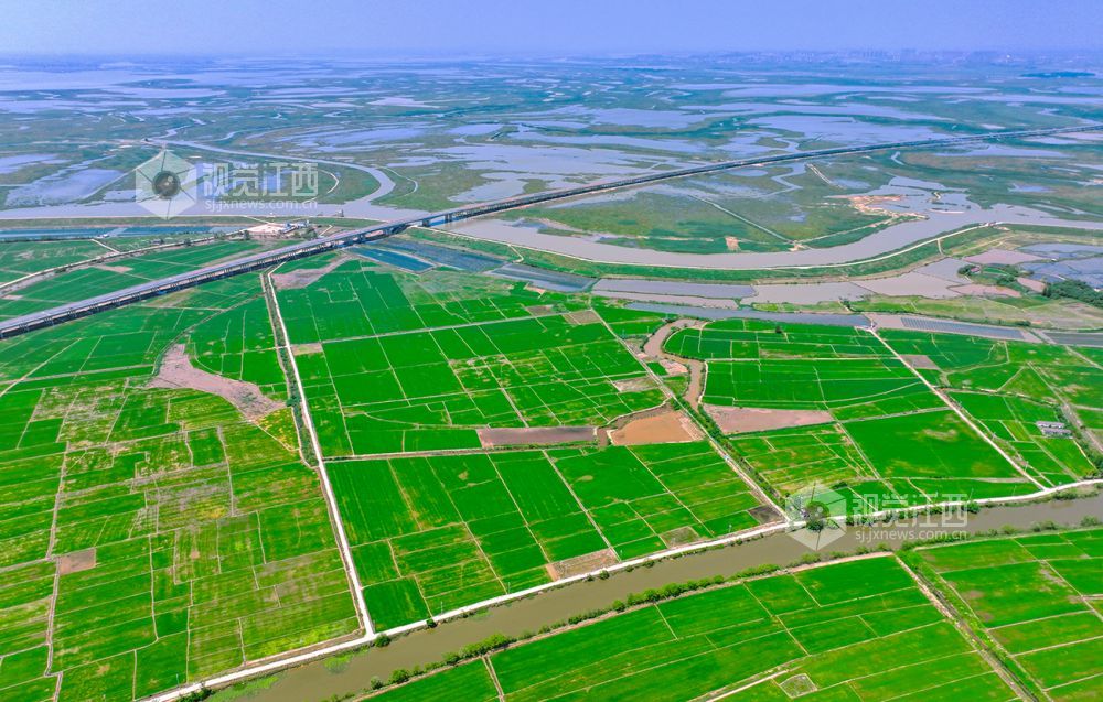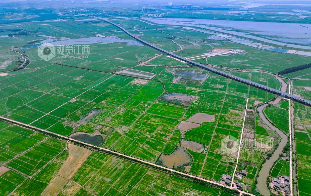 5月9日,在江西省余干县信丰垦殖场箭头社区田间地头,无人机高空俯瞰下的高标准农田与村庄、河道、高铁交相辉映,呈现一派美丽的乡村田园画卷。