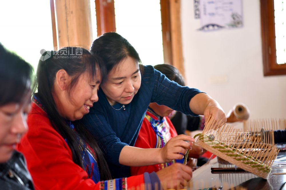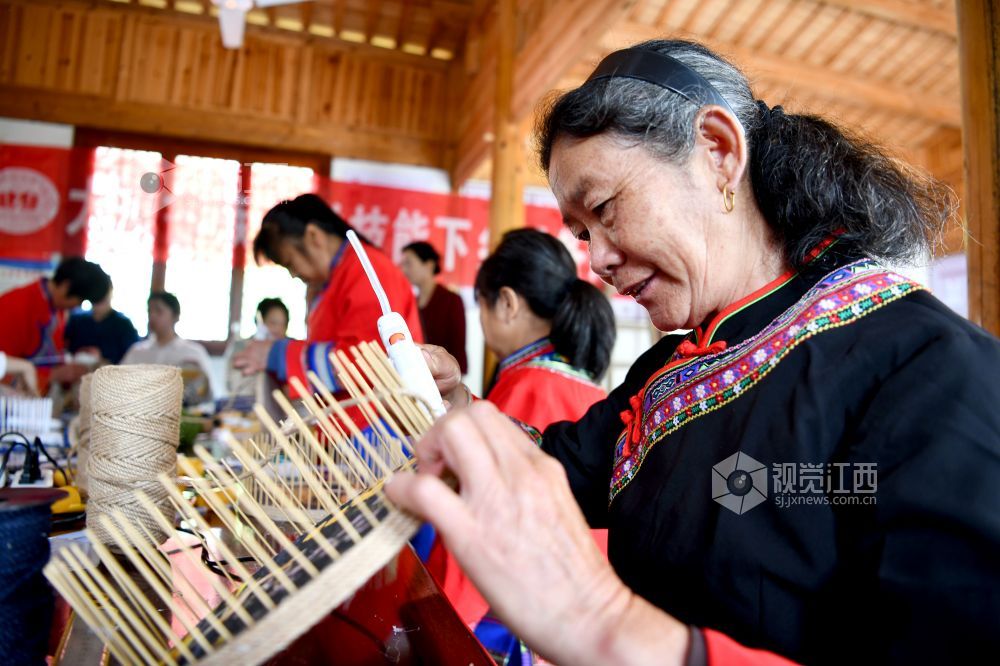 2023年5月12日,在江西省上饶市铅山县太源畲族乡水美自然村新时代文明实践站,妇女正在学习手工编织。