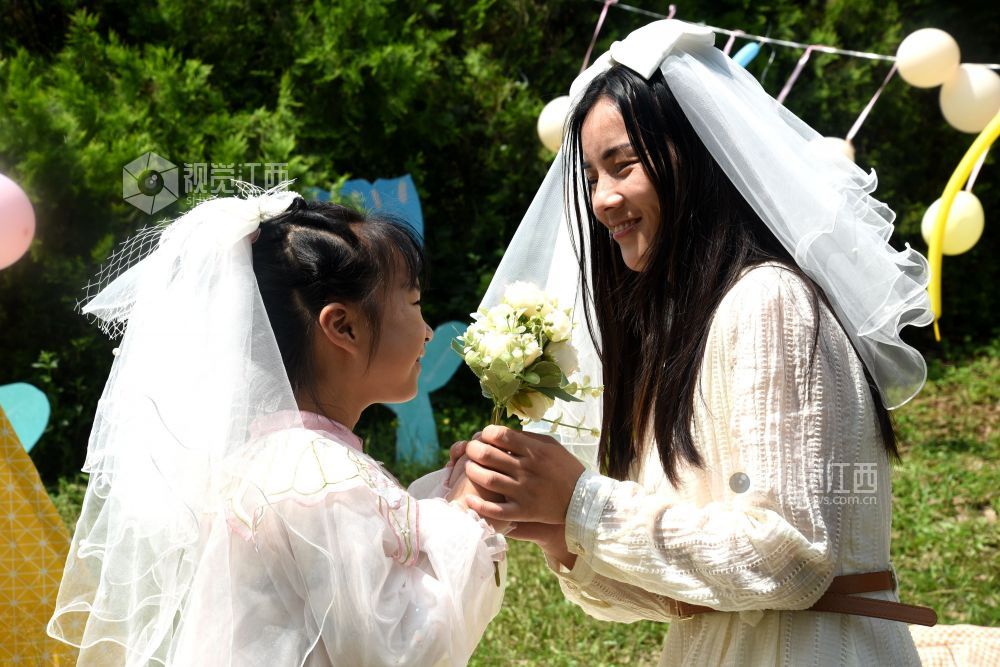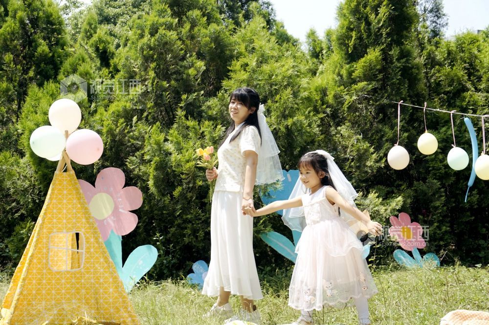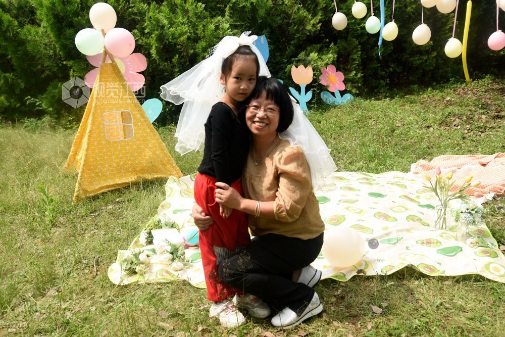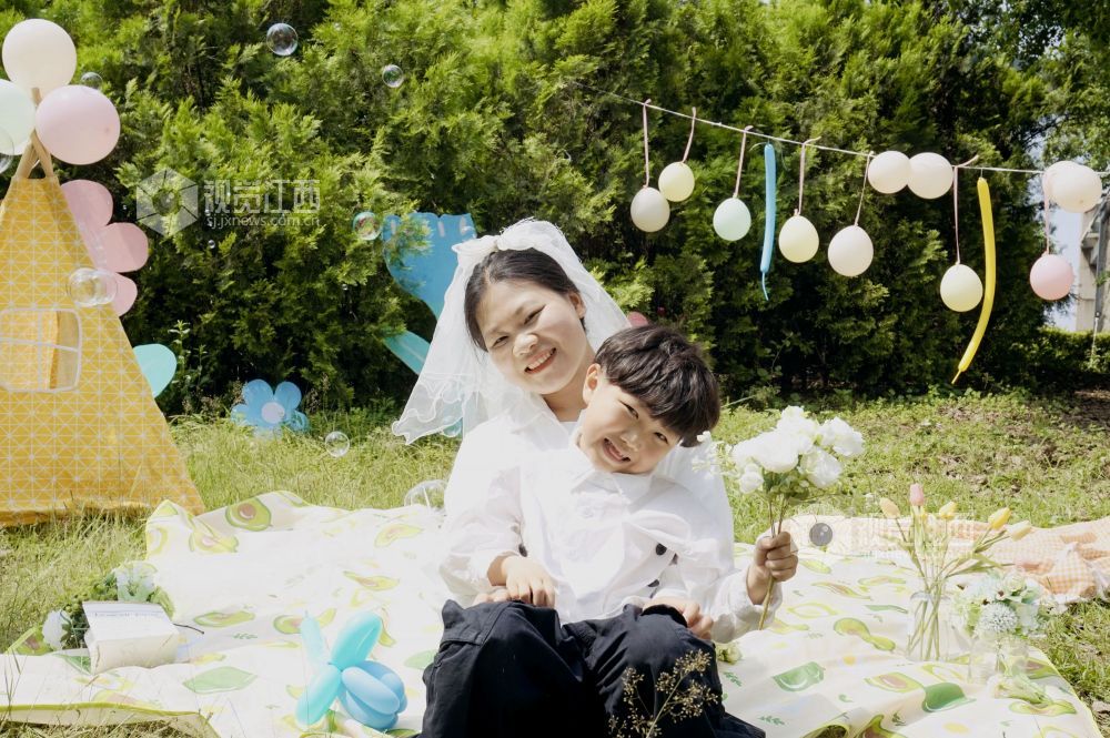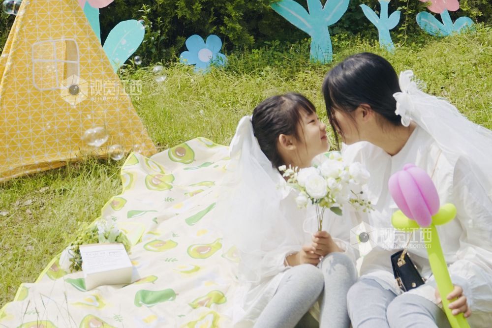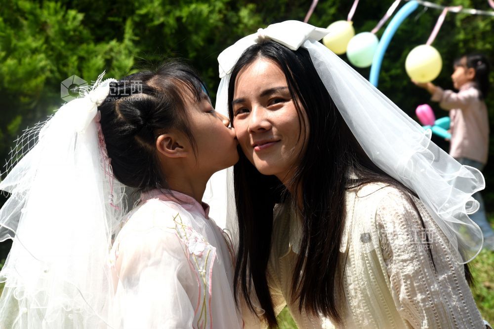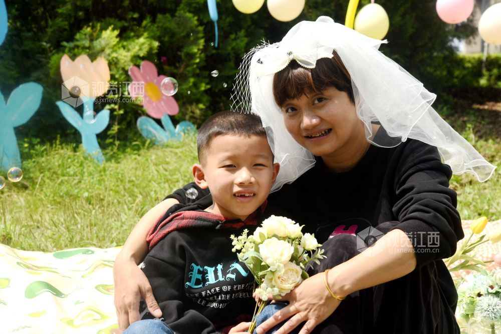 2023年5月13日上午,在江西省抚州市南丰县桔都文化广场草坪处,孩子们正在与母亲一起合影留念。