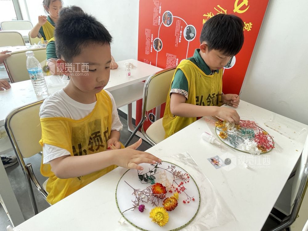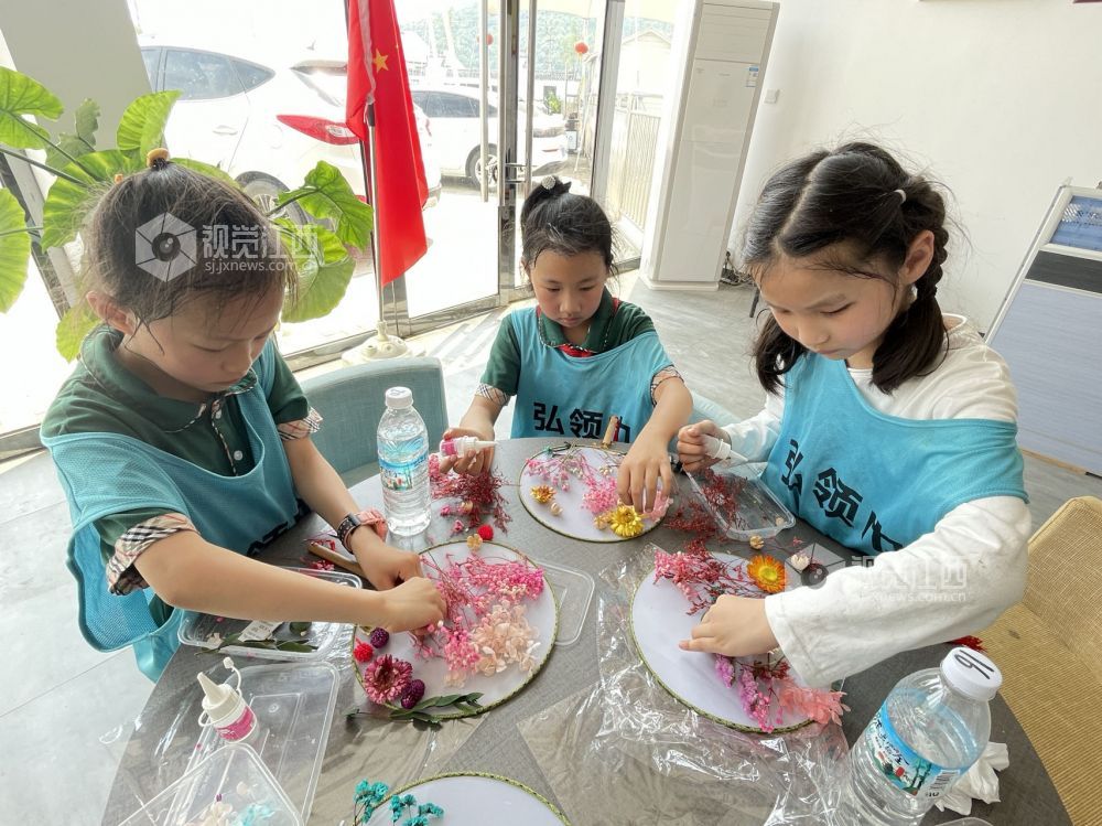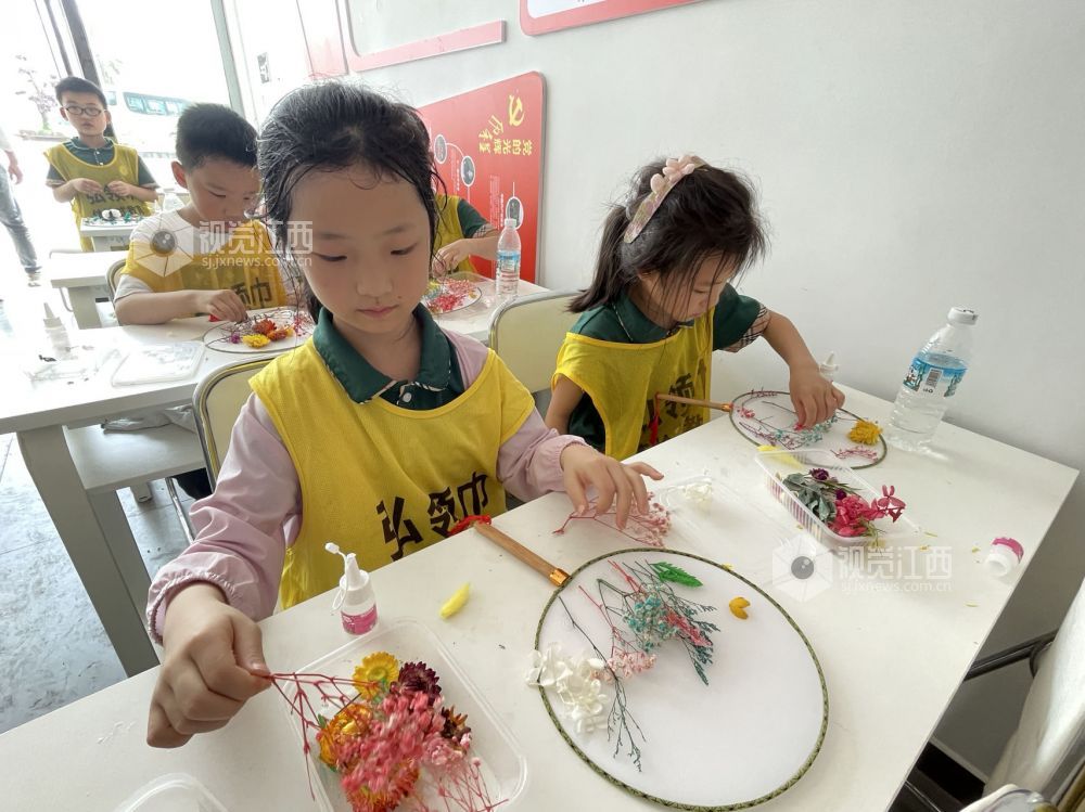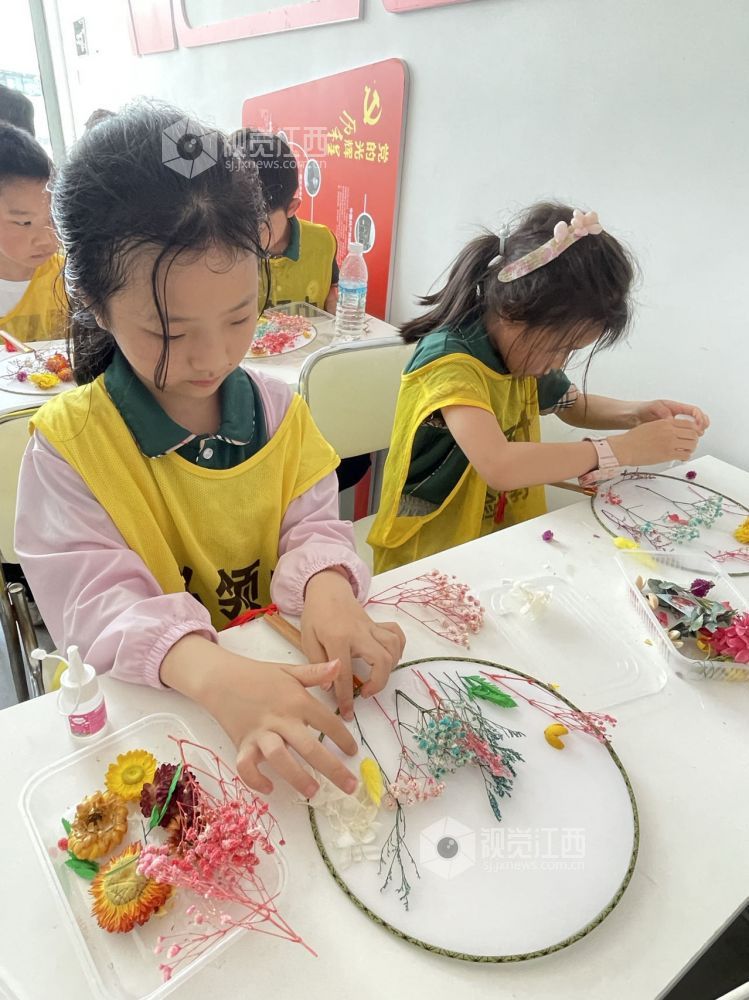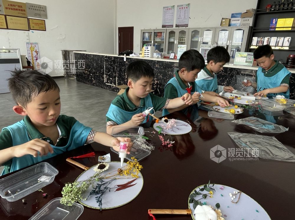 2023年5月14日,在江西省上饶市一小学里,学生在学习粘花手工。学校注重培养学生创新和动手能力,通过情景教育、潜能激发等独特方式,让学生们在课余之外锻炼自己动手创造的能力。