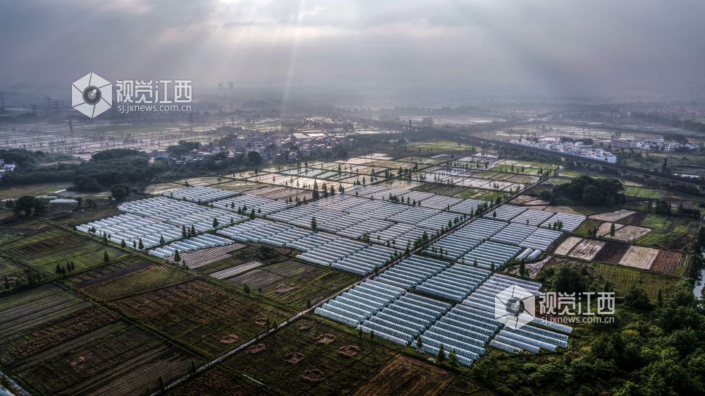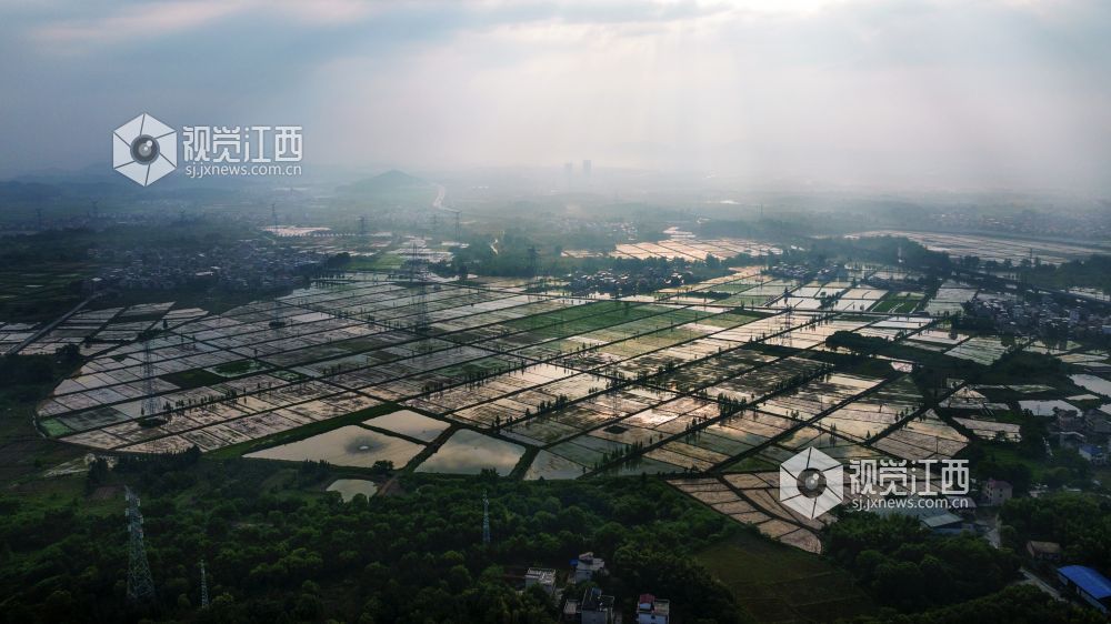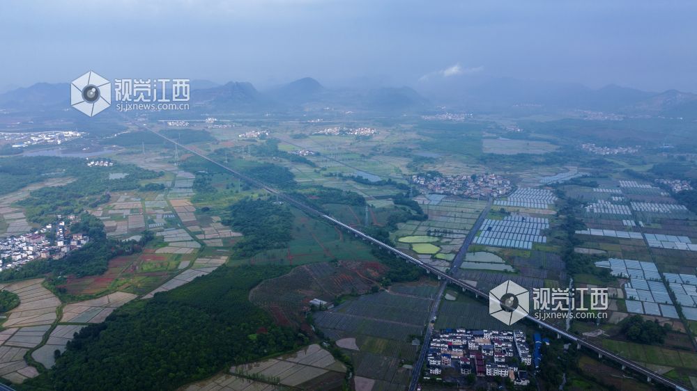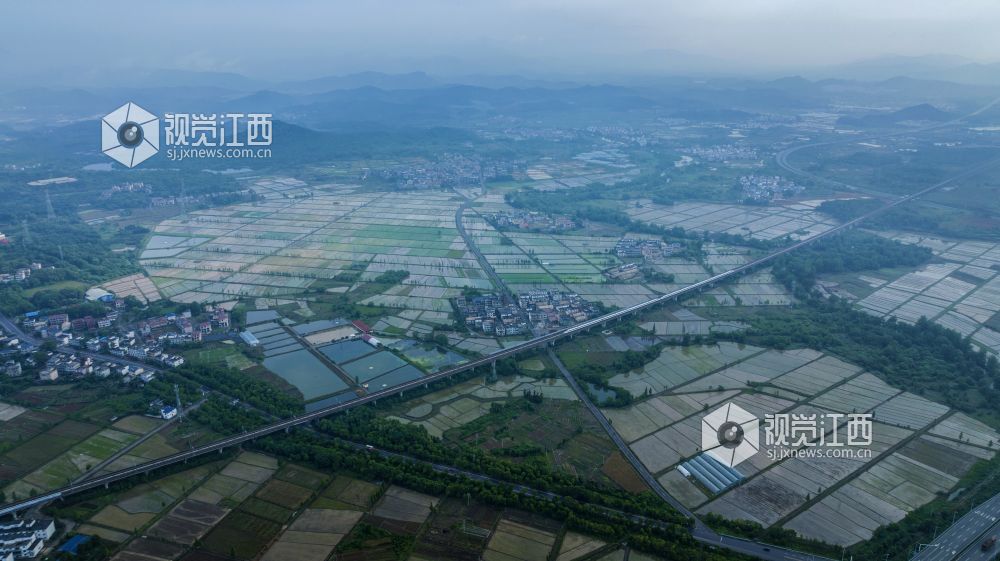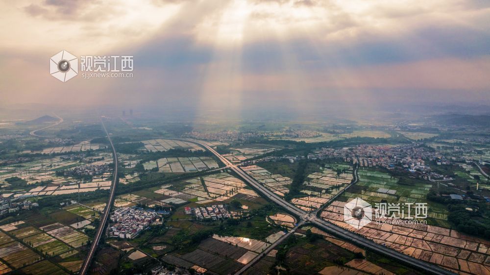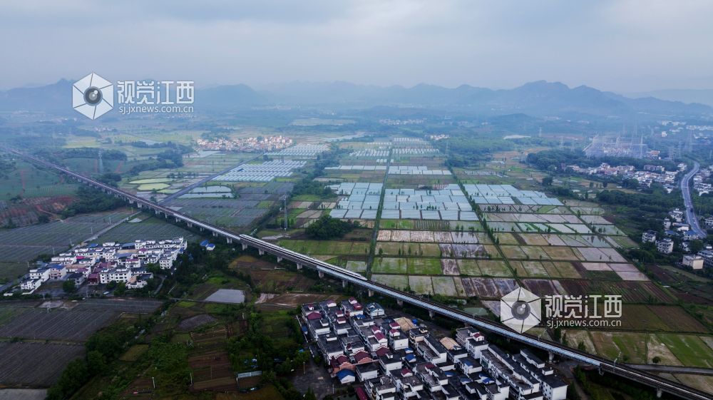 5月17日凌晨,太阳从东方冉冉升起,金色的阳光穿透云层,照射在雨停后的江西新余仙女湖区观巢镇的田园、河流、道路、铁路、房屋、大棚上,一趟趟往返高速列车穿行其间,形成了一幅幅栩栩如生、色彩斑斓的美丽画卷。