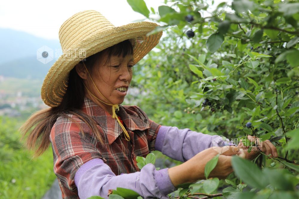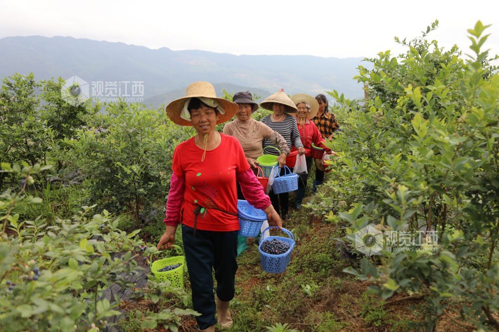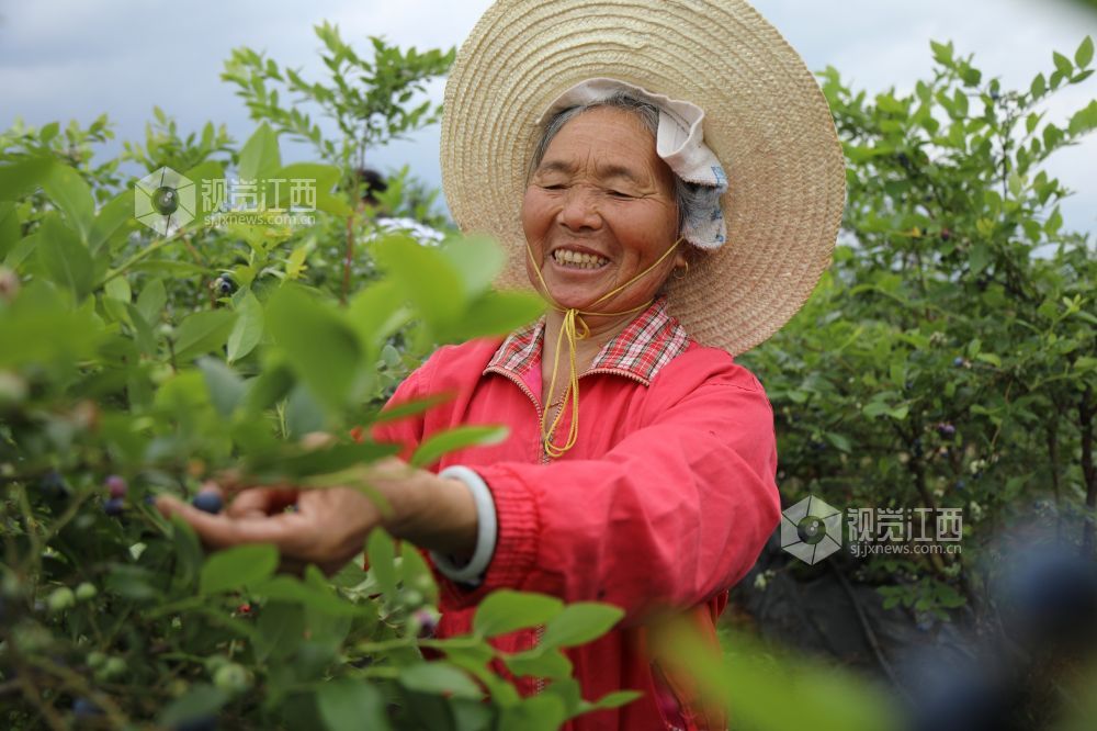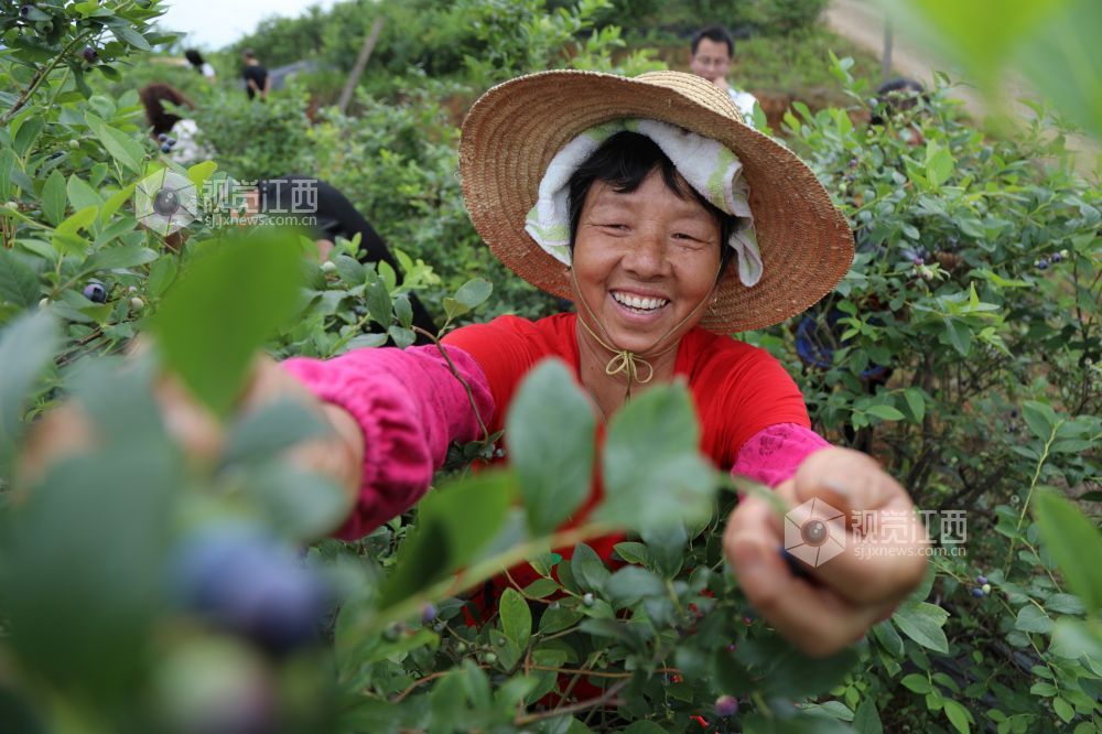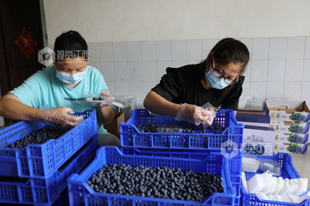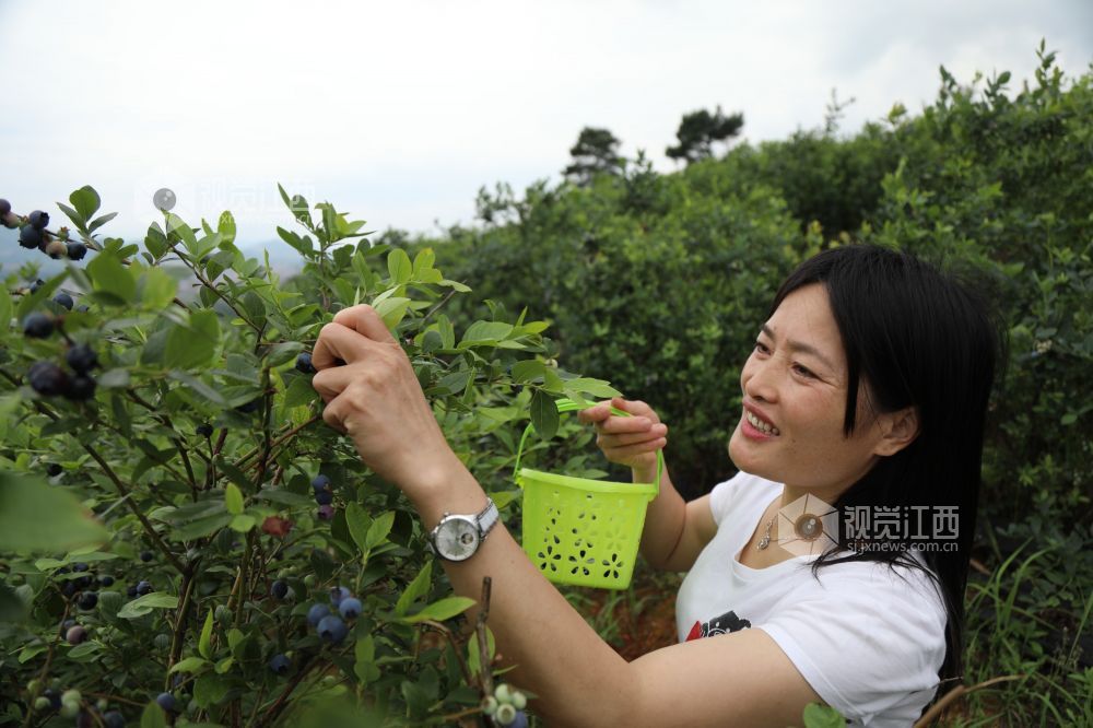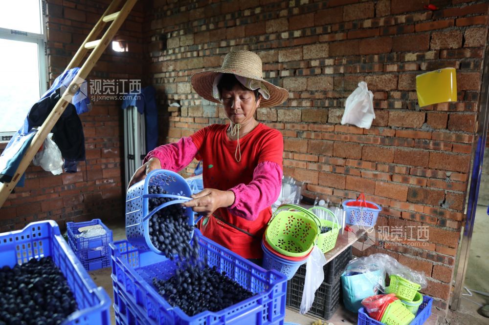 5月17日,走进江西省莲花县良坊镇白渡村蓝莓基地,只见绿油油的蓝莓树上结满了紫色的果子,村民忙着采摘、分拣、装盒;游客边吃边摘,体验采摘乐趣。