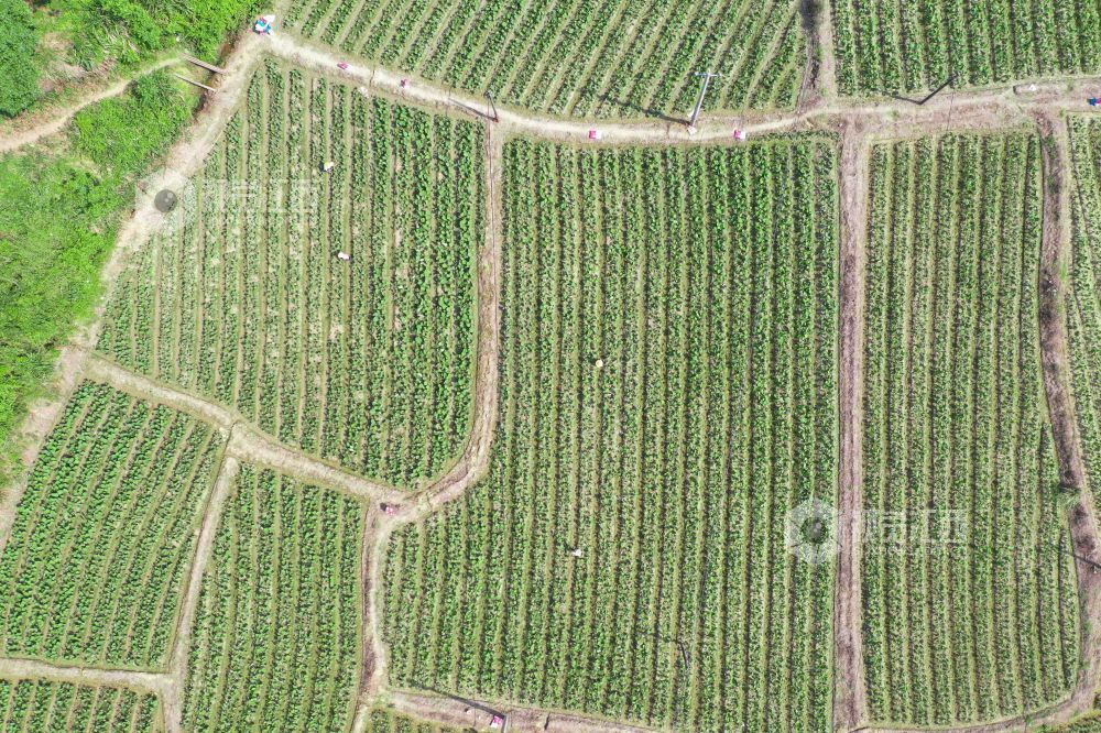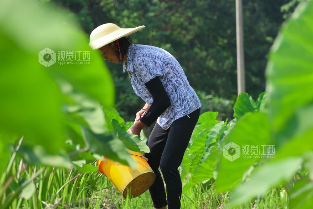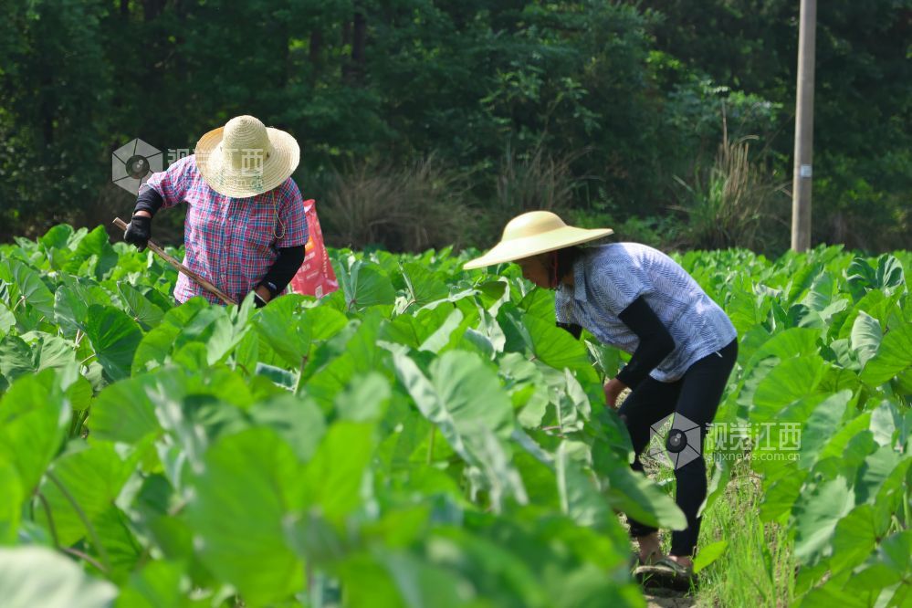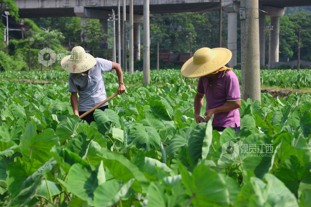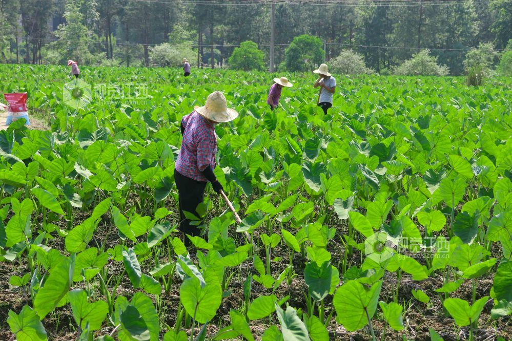 5月18日,初夏时节,在江西省泰和县中龙乡的香芋基地内,连片的香芋涨势喜人。农户们正在抢抓农时,进行施肥除草,确保香芋的健康生长和高产的目标。