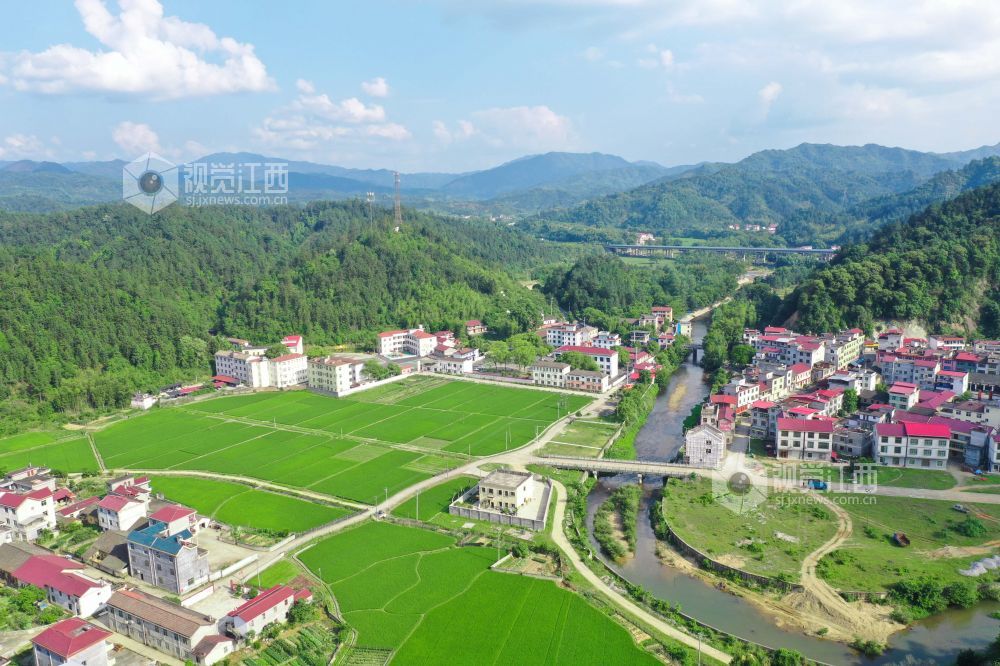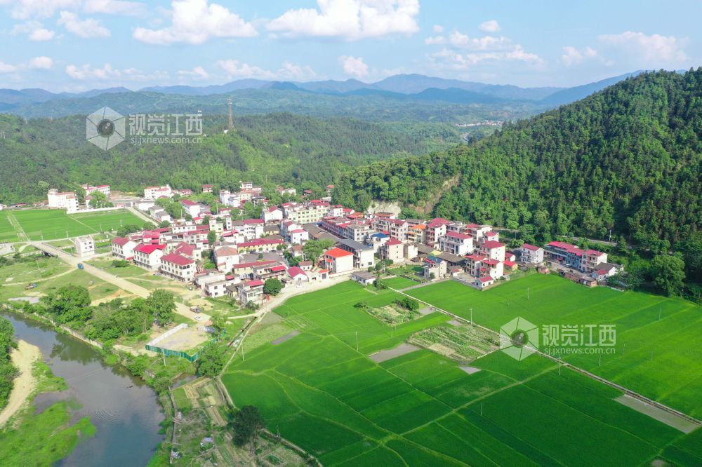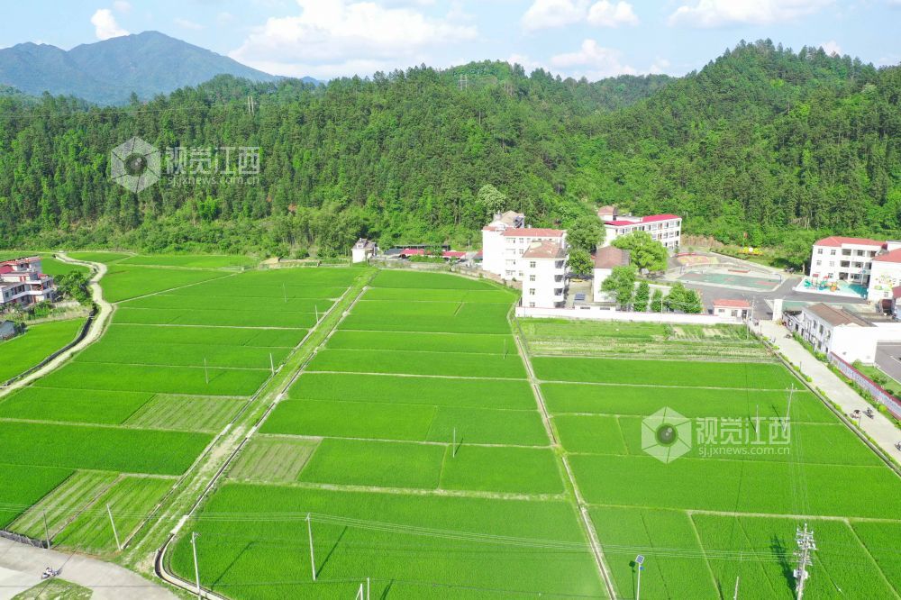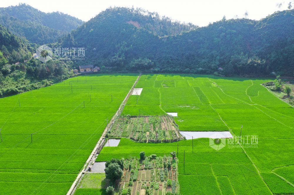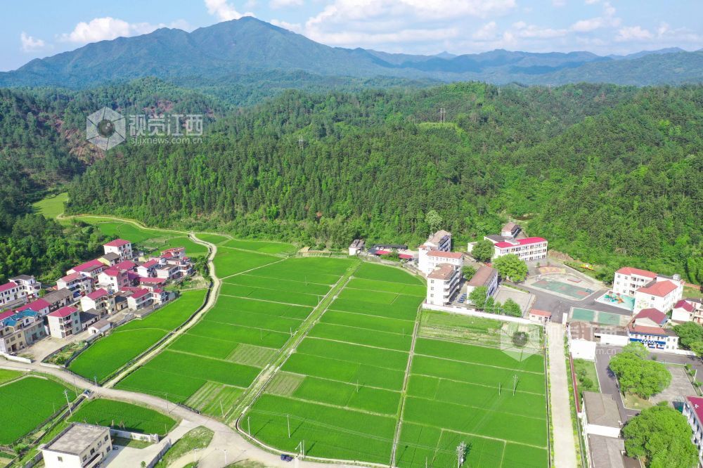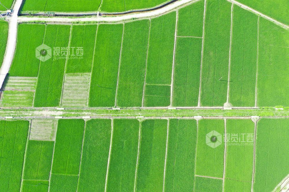 5月18日,初夏时节,在江西省泰和县中龙乡,连片的农田里水稻生长正旺。从空中俯瞰,宛如绿色的海洋,与远处的青山、房屋交相辉映,构成一幅景色怡人的田园画卷,美不胜收。