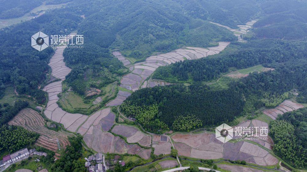 5月18日,航拍江西新余仙女湖区凤凰湾办事处田园美丽如画,俯瞰镜头下梯田、道路、森林、房屋相映成趣,犹如一幅幅画卷,美不胜收。