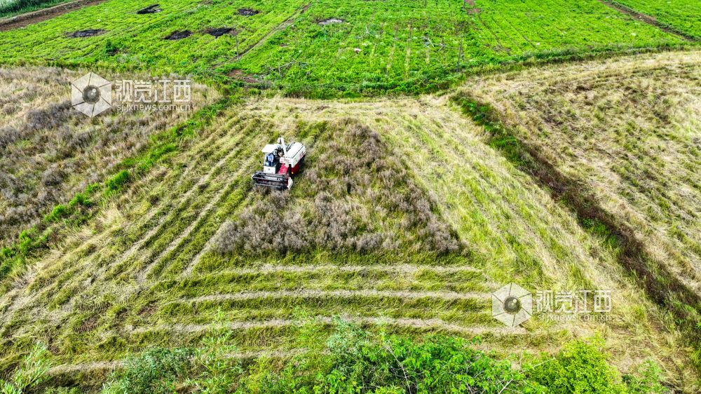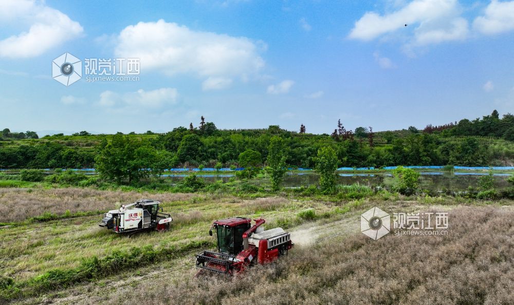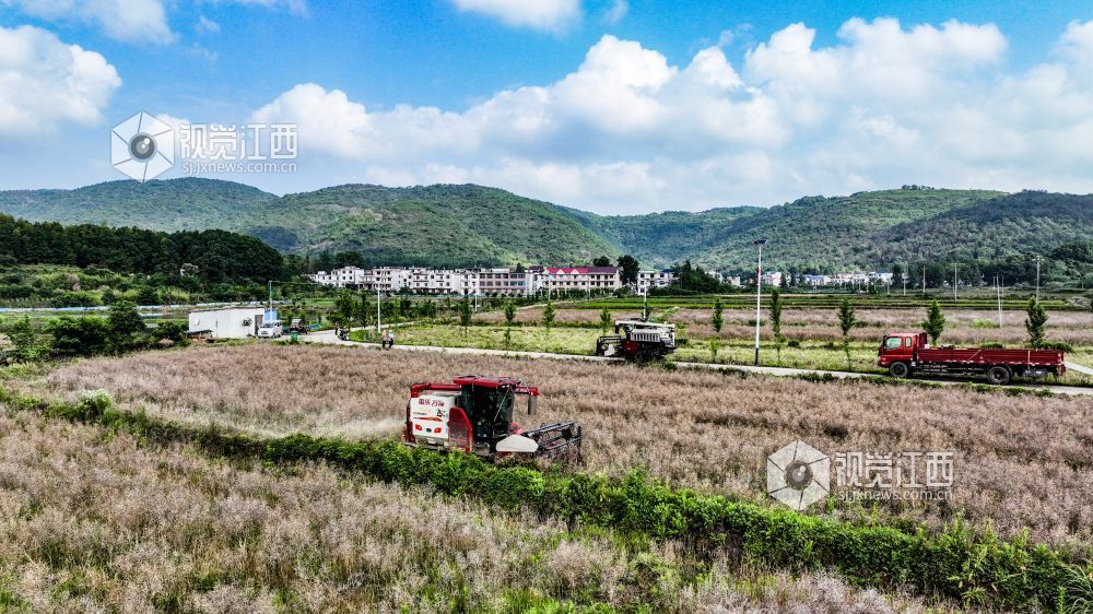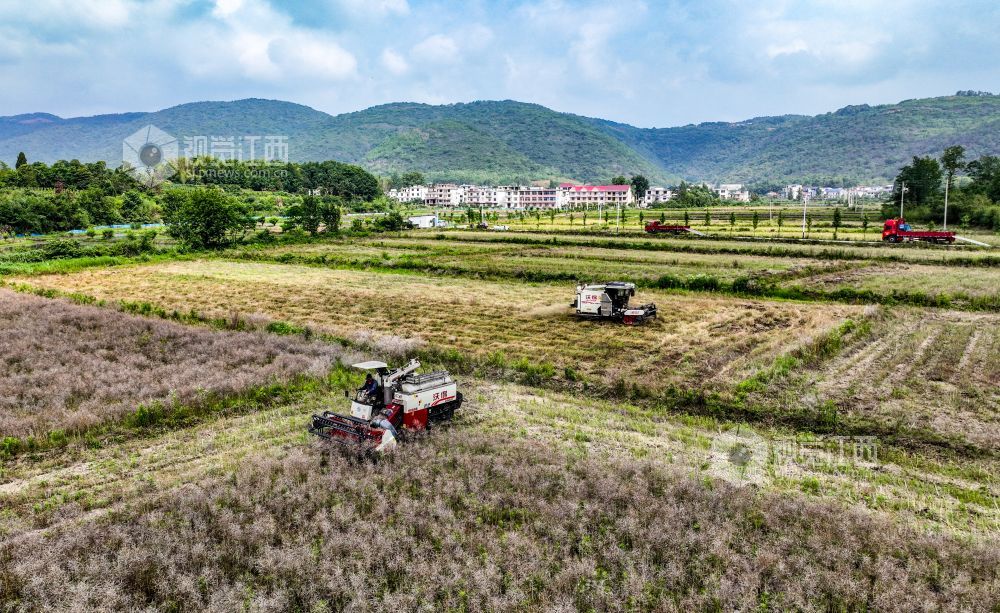 2023年5月23日,江西省瑞昌市范镇陡岗村,农机手正驾驶收割机采收油菜籽。近期,江西省瑞昌市19万亩油菜陆续开始收割,该市各农机合作社抢抓晴好天气加紧收割,确保颗粒归仓。