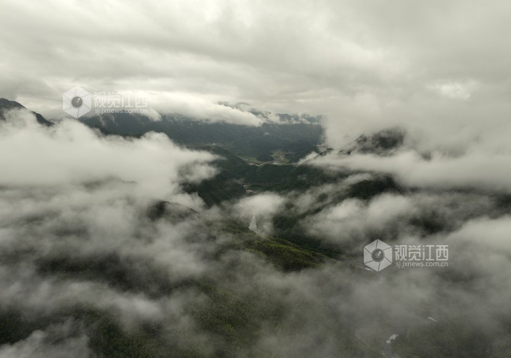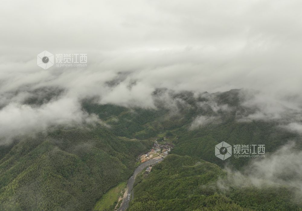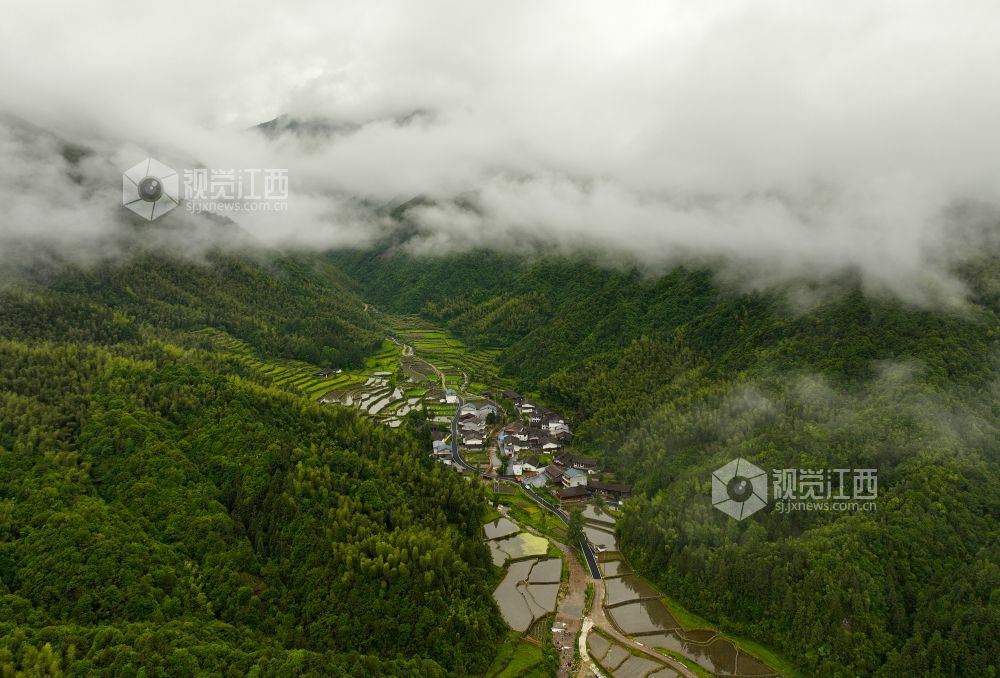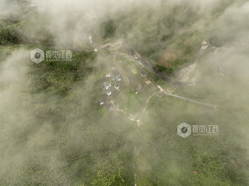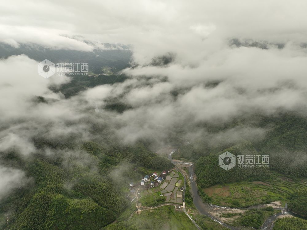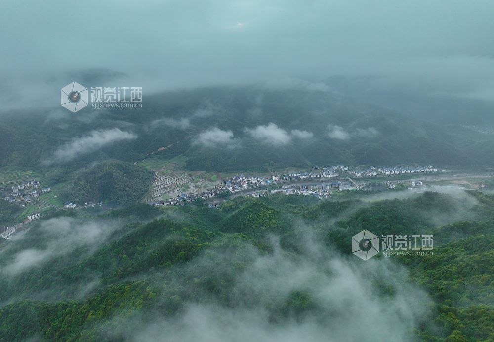 2023年5月24日,航拍江西省上饶市铅山县天柱山乡,云雾缭绕,宛如仙境。大雨过后,山村中升起阵阵云雾,乡村、田园、山峰相互辉映,秀美如画。