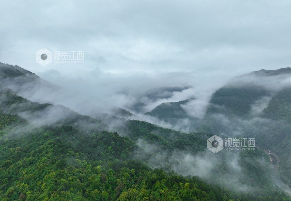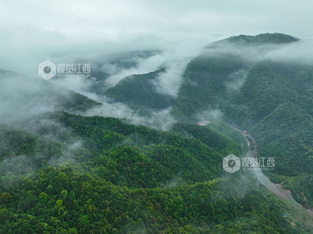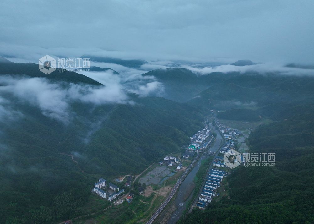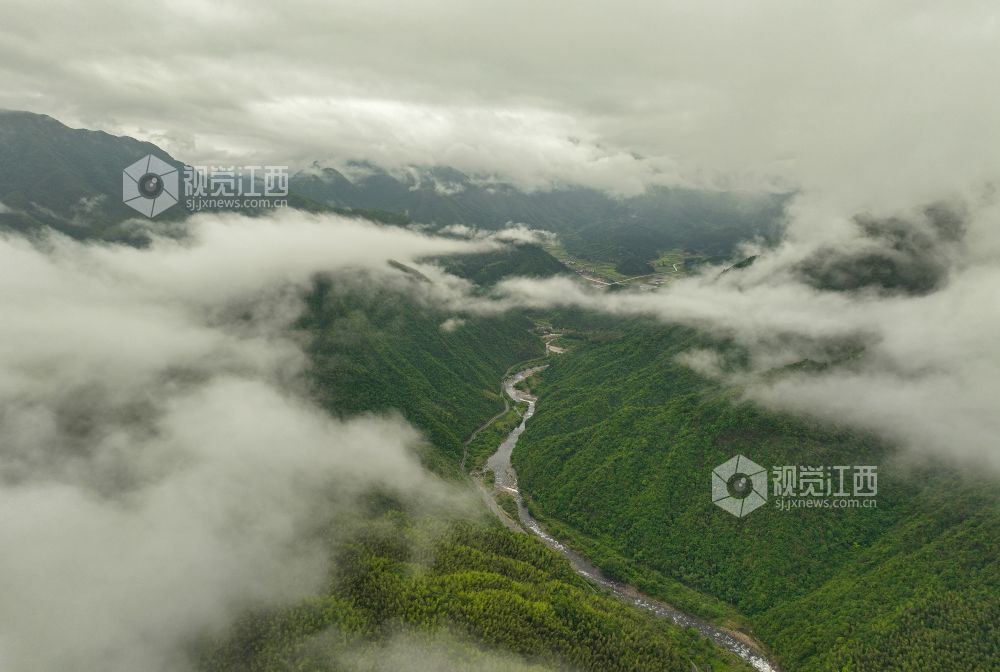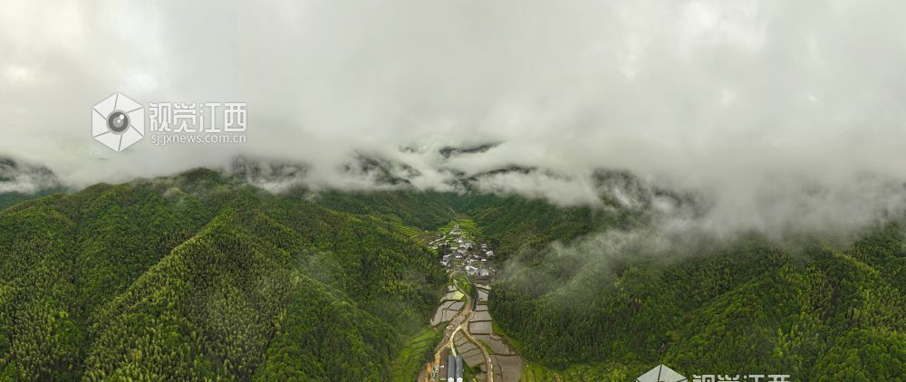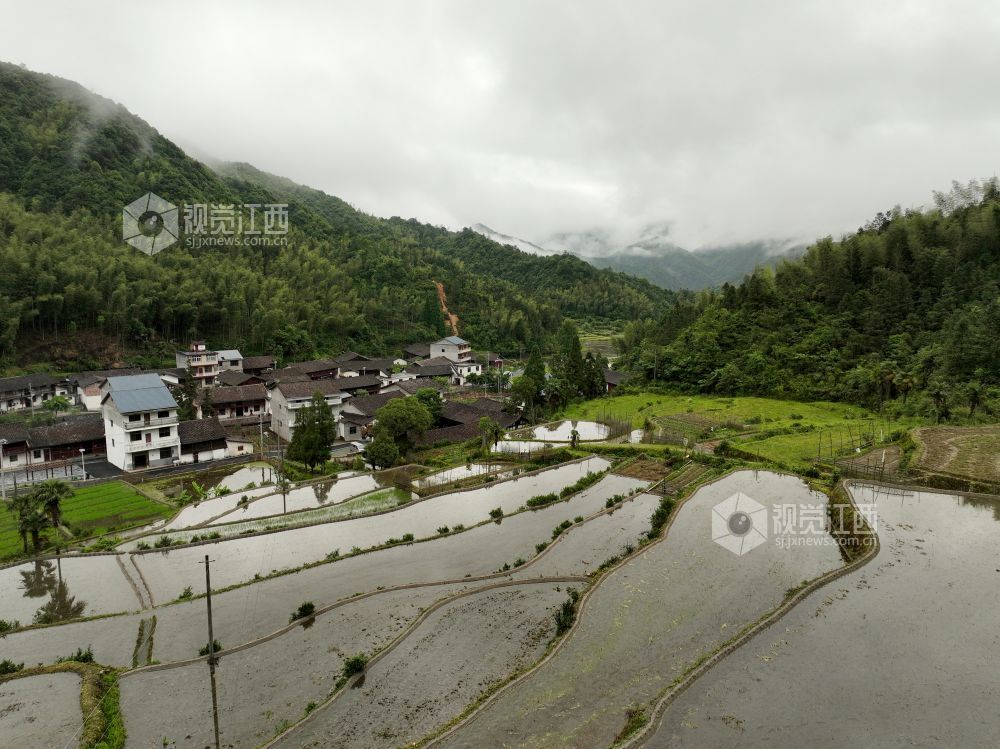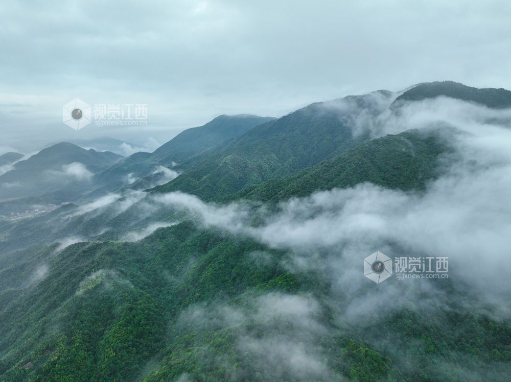 2023年5月24日,航拍江西省上饶市铅山县天柱山乡,云雾缭绕,宛如仙境。大雨过后,山村中升起阵阵云雾,乡村、田园、山峰相互辉映,秀美如画。