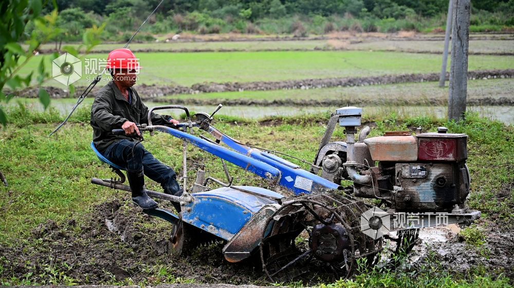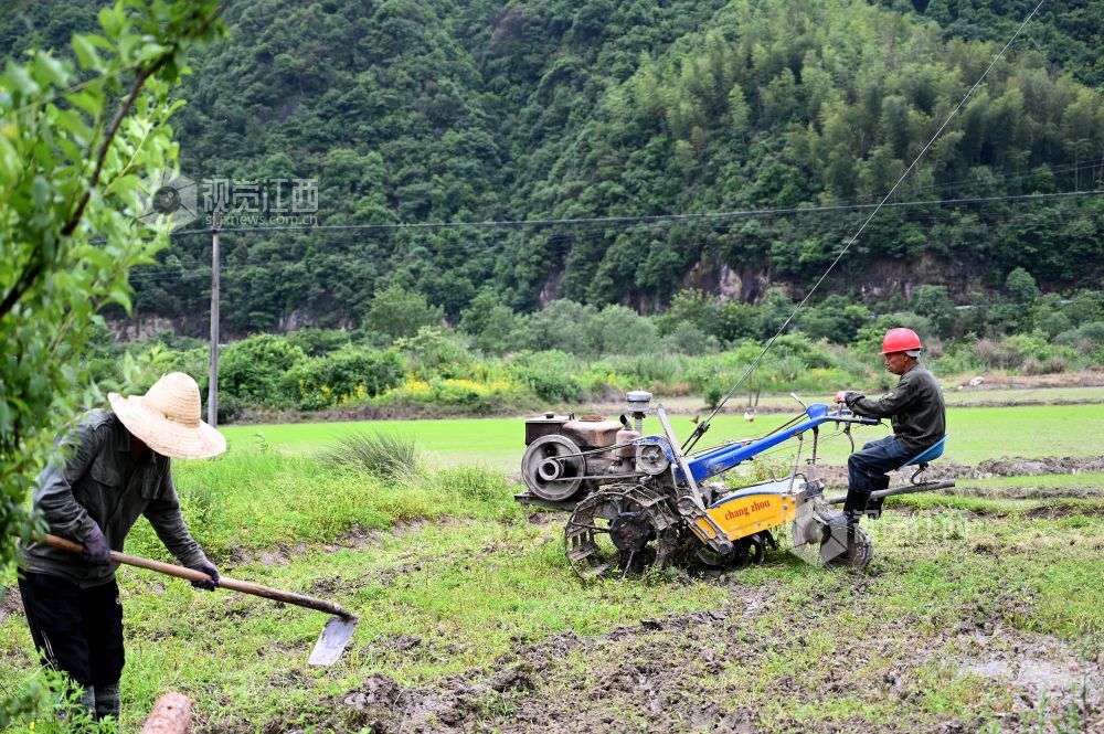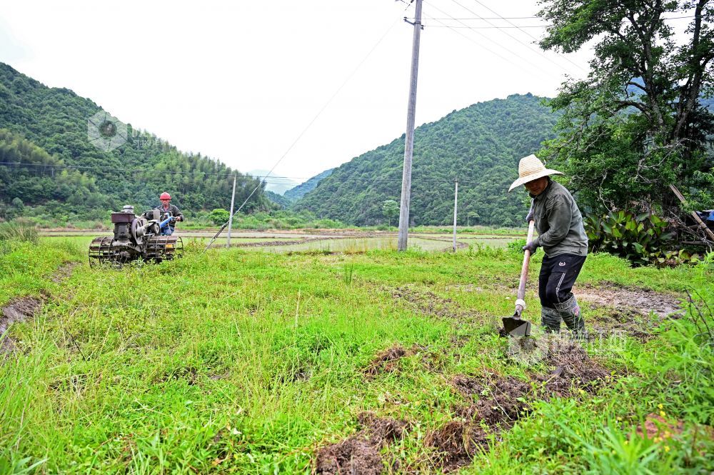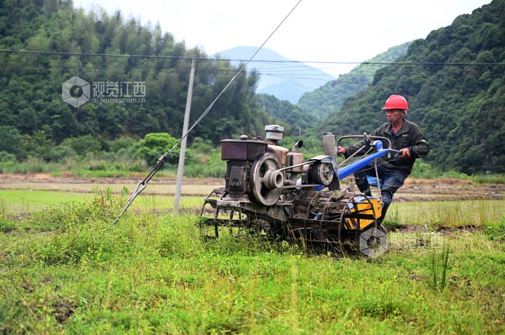 2023年5月25日,在江西省上饶市铅山县天柱山乡高泉村,村民正在耕田。“小满”过后,雨水增多,气温升高,中稻已经进入紧张的种植阶段,当地稻农抢抓住黄金时节,不误农事耕田、抢栽、抢种水稻秧苗,确保今年水稻秧苗按时完成移栽。