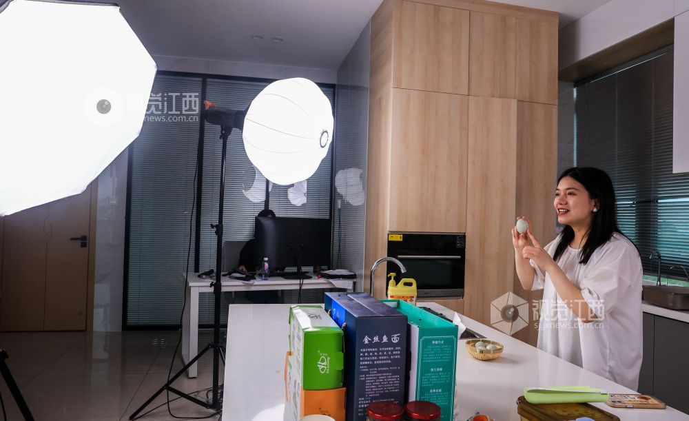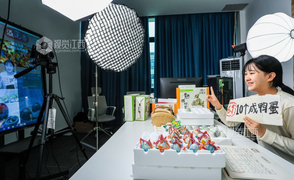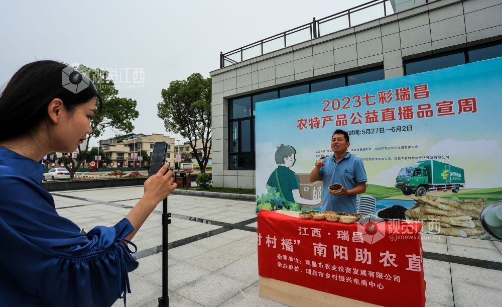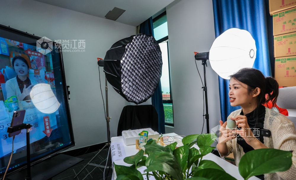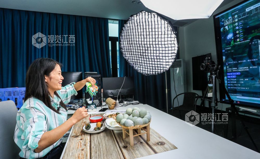 2023年5月27日,江西省瑞昌市乡村振兴电商中心农产品直播间内,主播正在向客户推介农产品。
