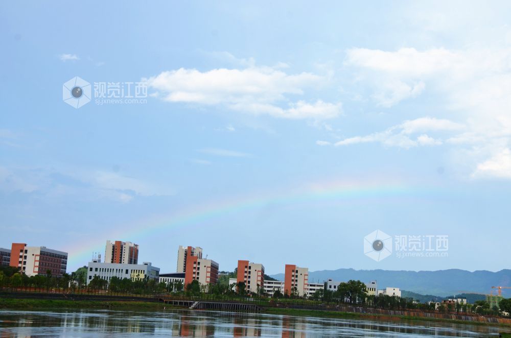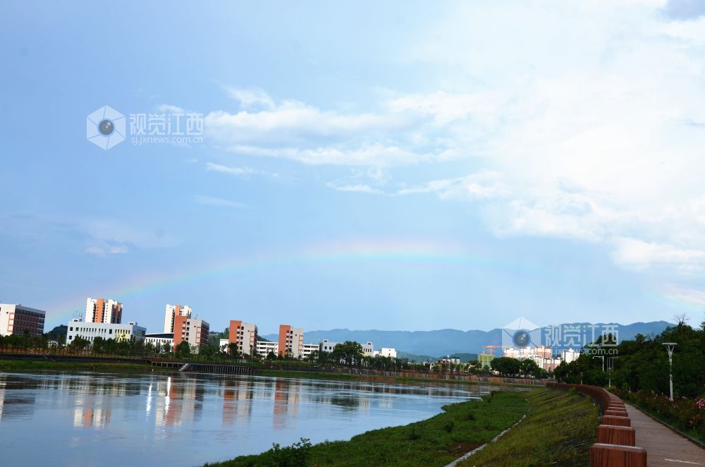 5月26日下午,一场大雨过后,江西省永新县上空出现彩虹美景,青山、田野、河流和林立的楼宇在彩虹的映衬下,美如画卷。
