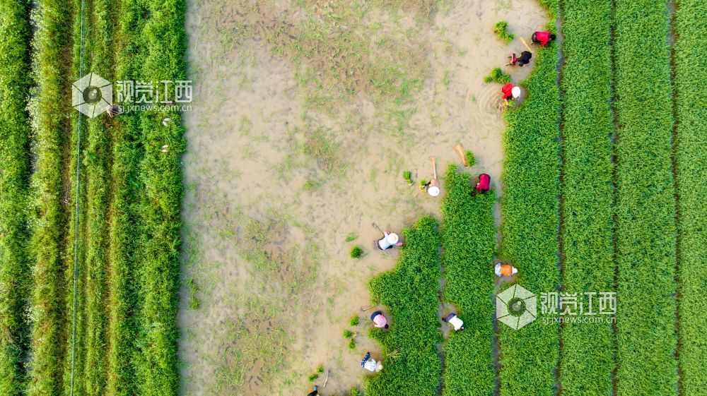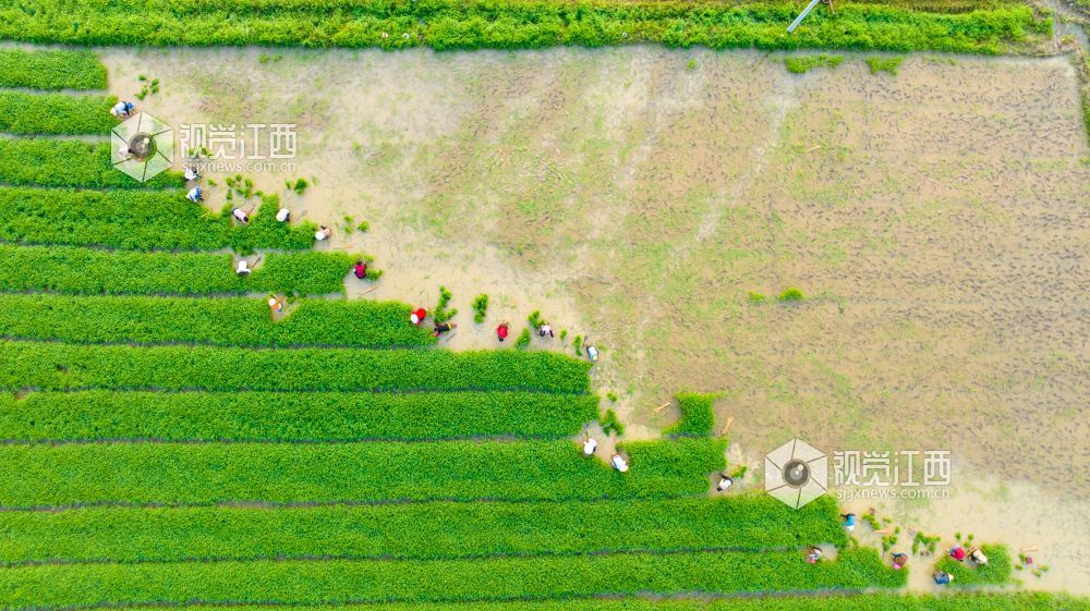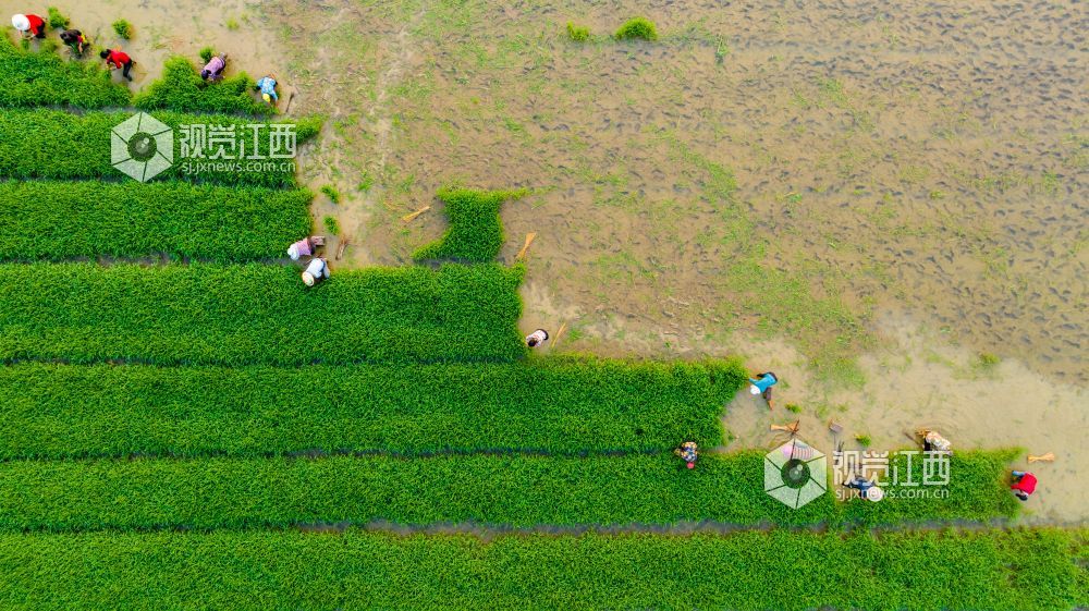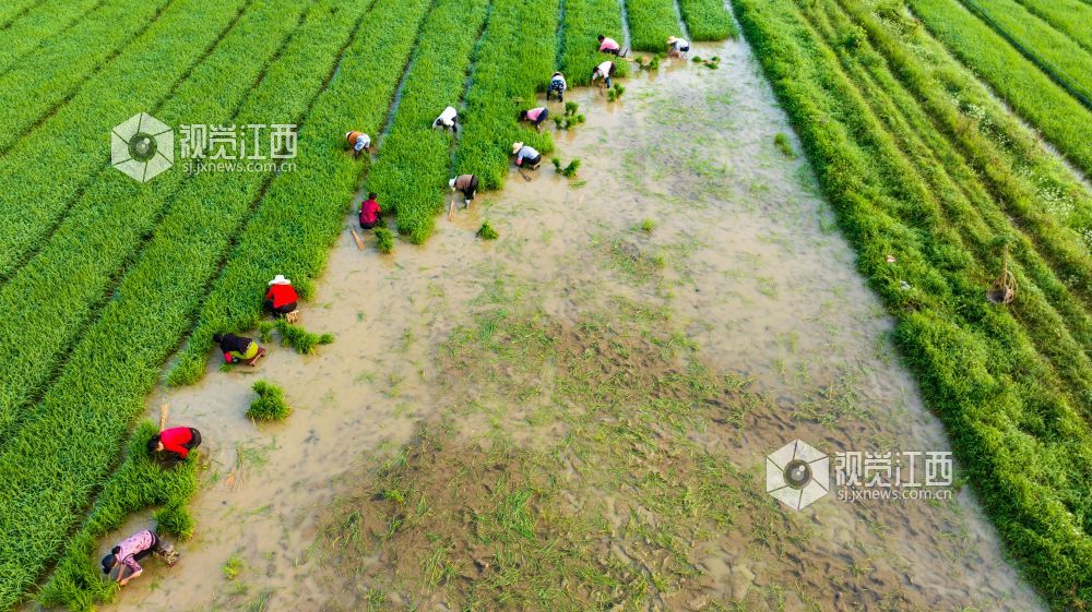 2023年6月2日,江西省瑞昌市横港镇繁荣村,村民在水稻育苗基地拔秧。初夏时节,瑞昌市农民抢抓农时栽插中稻,到处一派夏种忙碌景象。