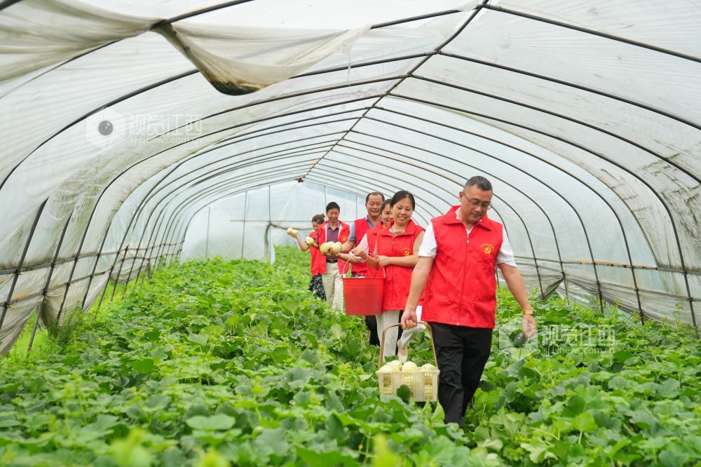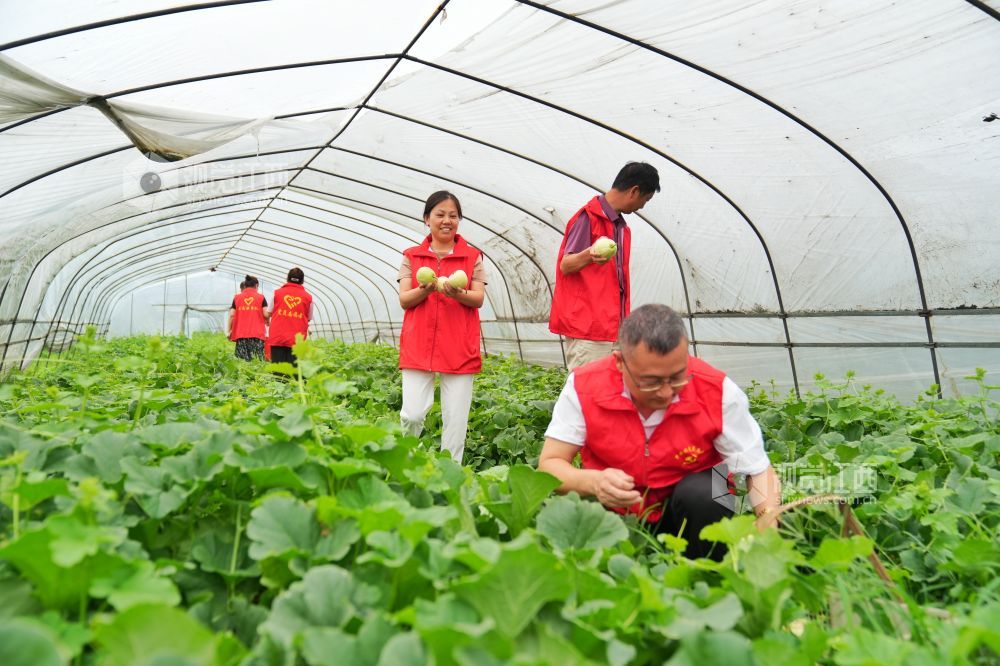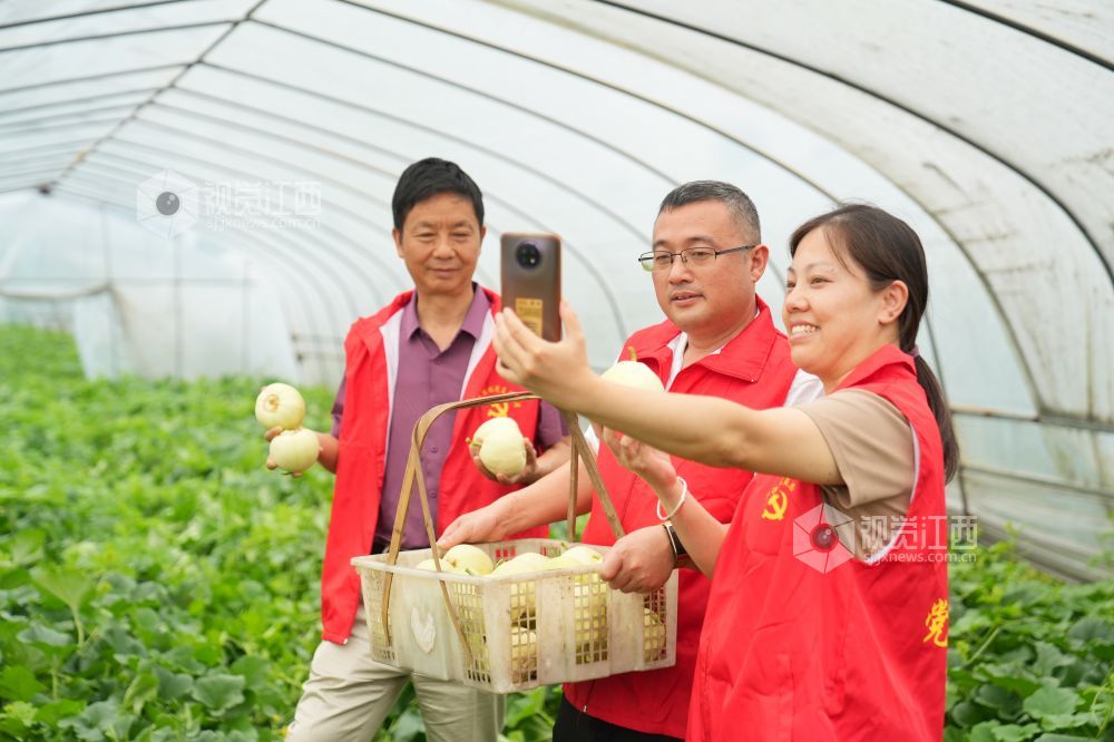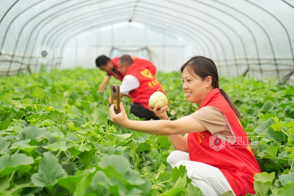 2023年6月6日,在江西省萍乡市芦溪县芦溪镇林家坊村脱贫户种植的甜瓜大棚里,党员志愿者正在直播带货,助力瓜农打开销路,助力乡村振兴。