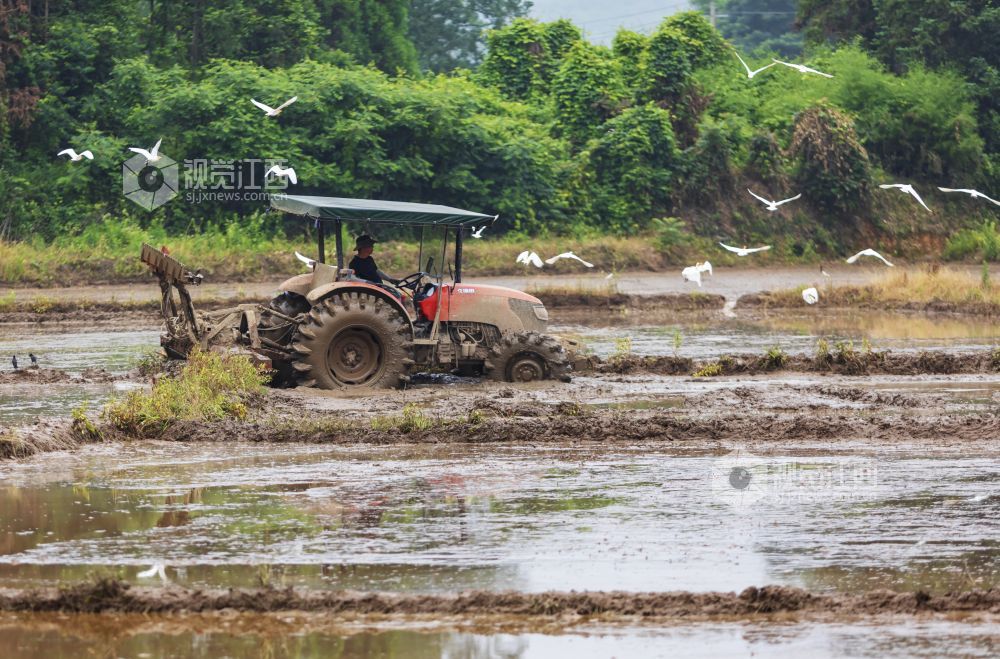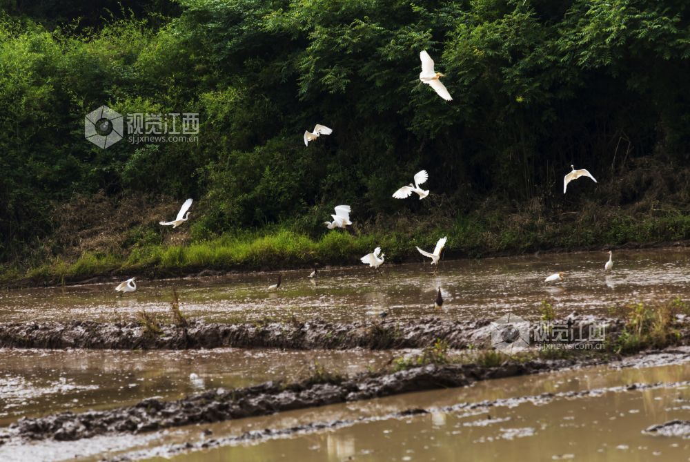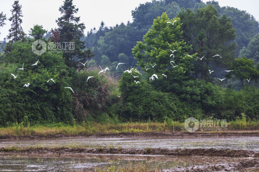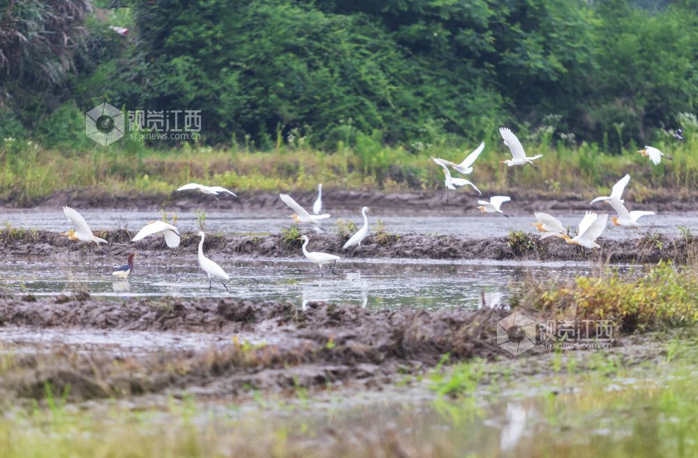2023年6月7日,江西省新余市分宜县洋江镇前江村的田间地头,成群的白鹭纷至沓来,特别是犁田的时候,泥土里翻出来的各种昆虫吸引大批白鹭前来觅食,呈现出一幅人与自然和谐相处的美丽的生态田园画卷。