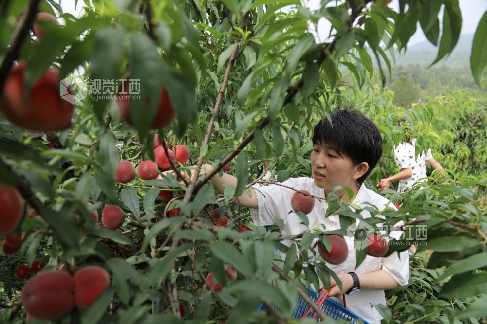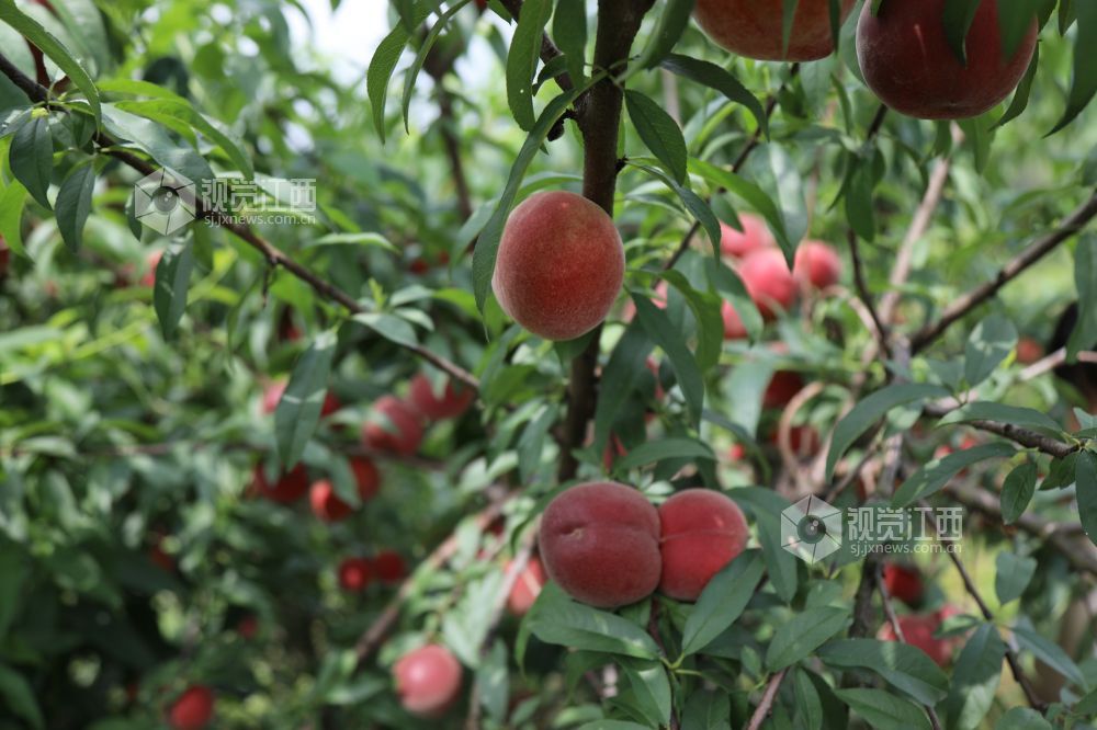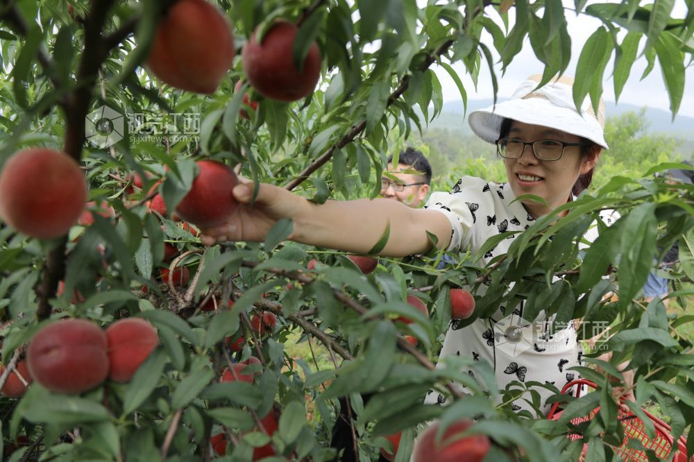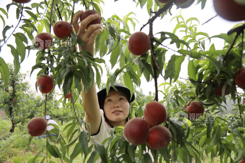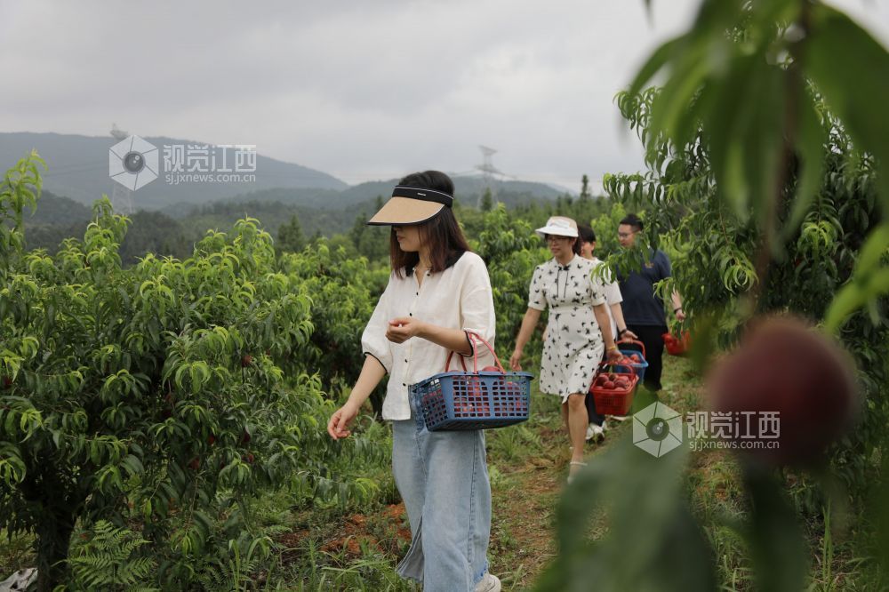 6月7日,在江西省莲花县六市乡西坑村蜜桃基地,红红的水蜜桃挂满枝头,游客穿梭其间,不停采摘,享受采摘乐趣。