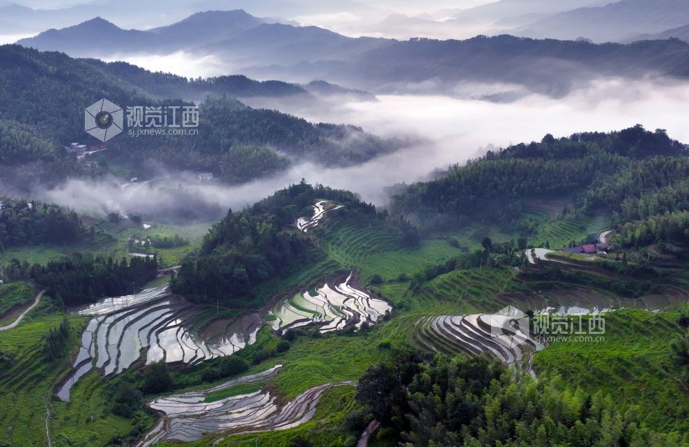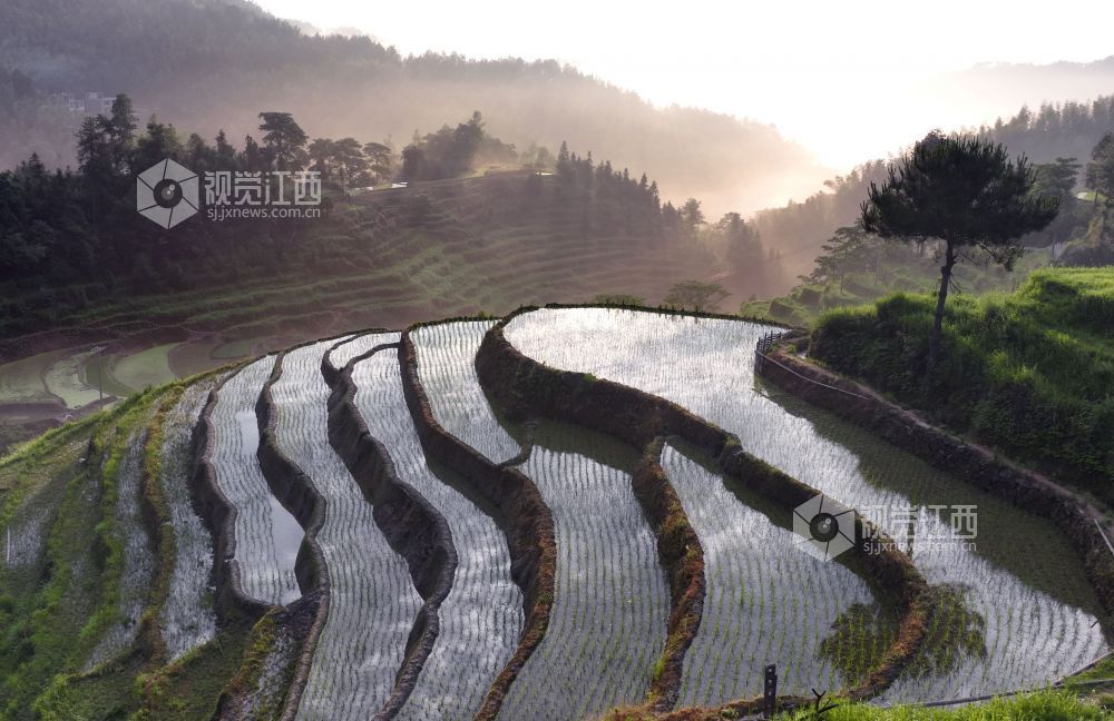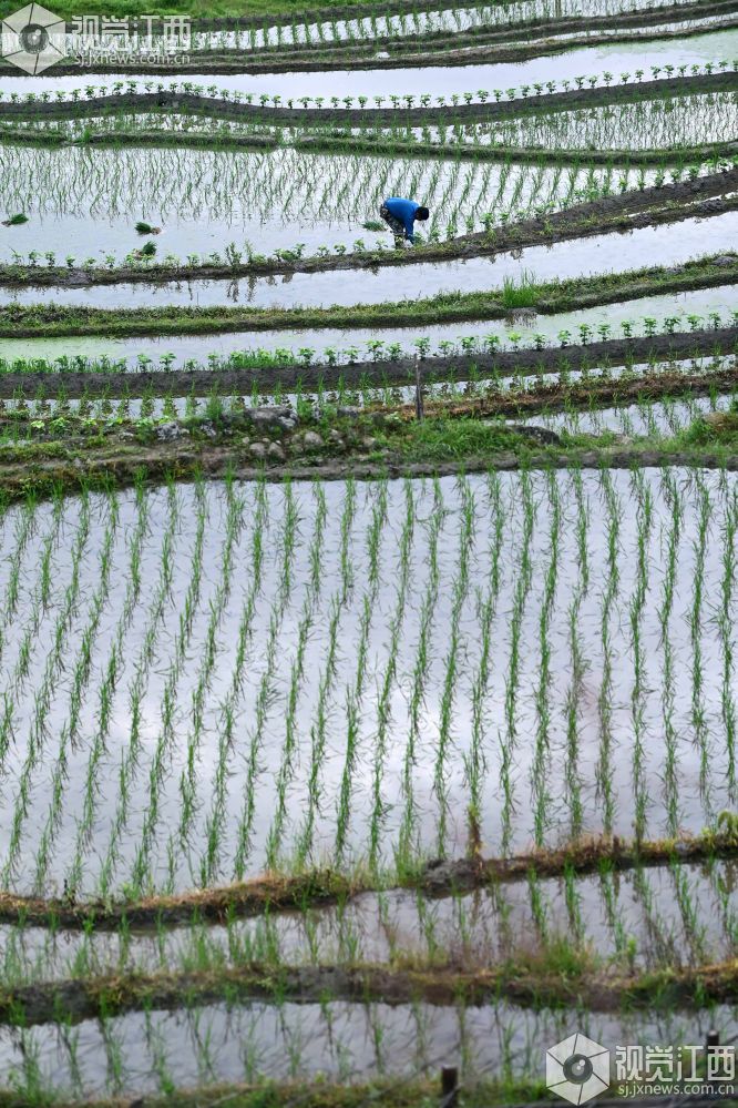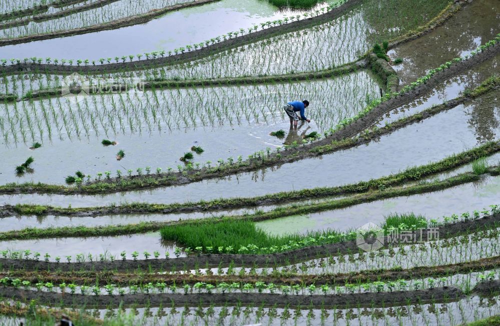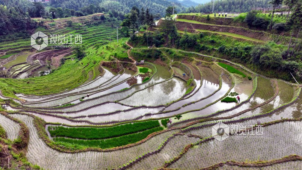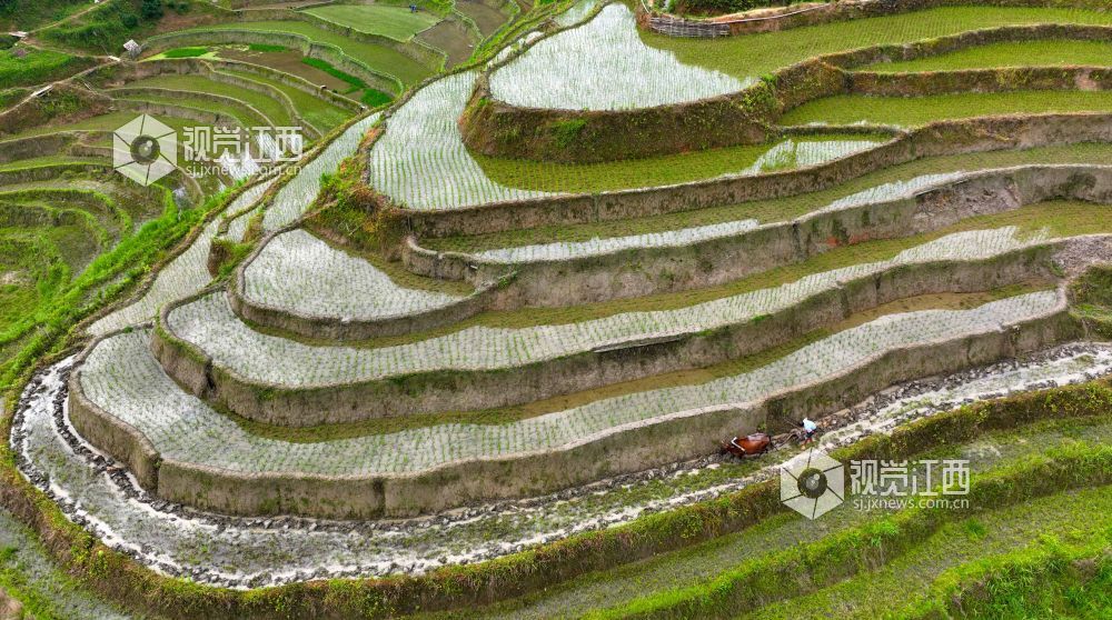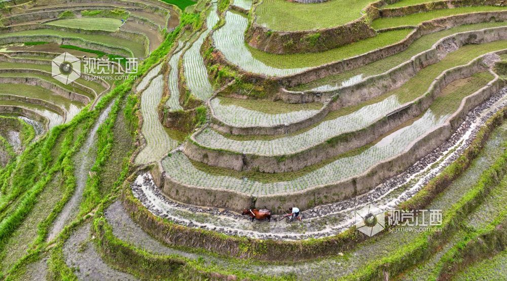2023年6月10日,江西省宜春市万载县高村镇新竹村村民在高山梯田犁田、插秧,忙碌的身影与层层叠叠的梯田交相辉映,构成一幅和谐的耕作美景图。据悉,近年来,当地依托生态优势,利用传统的耕作模式,种植高山梯田水稻,带动乡村农旅融合发展,助力农户增收致富。