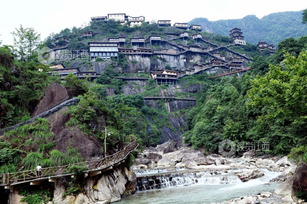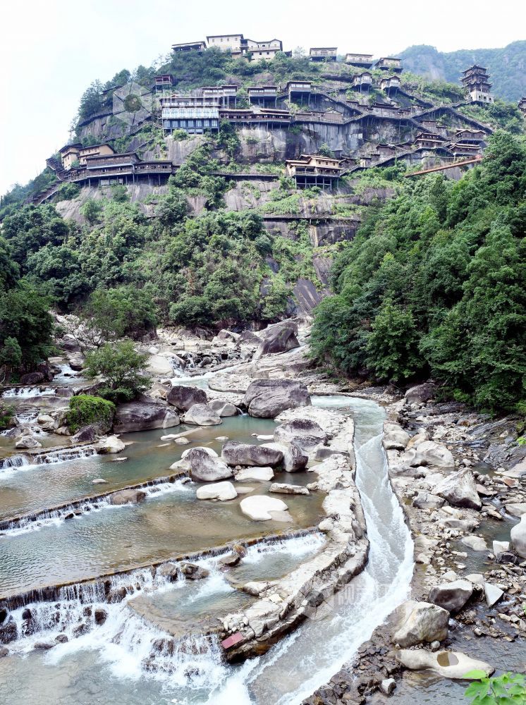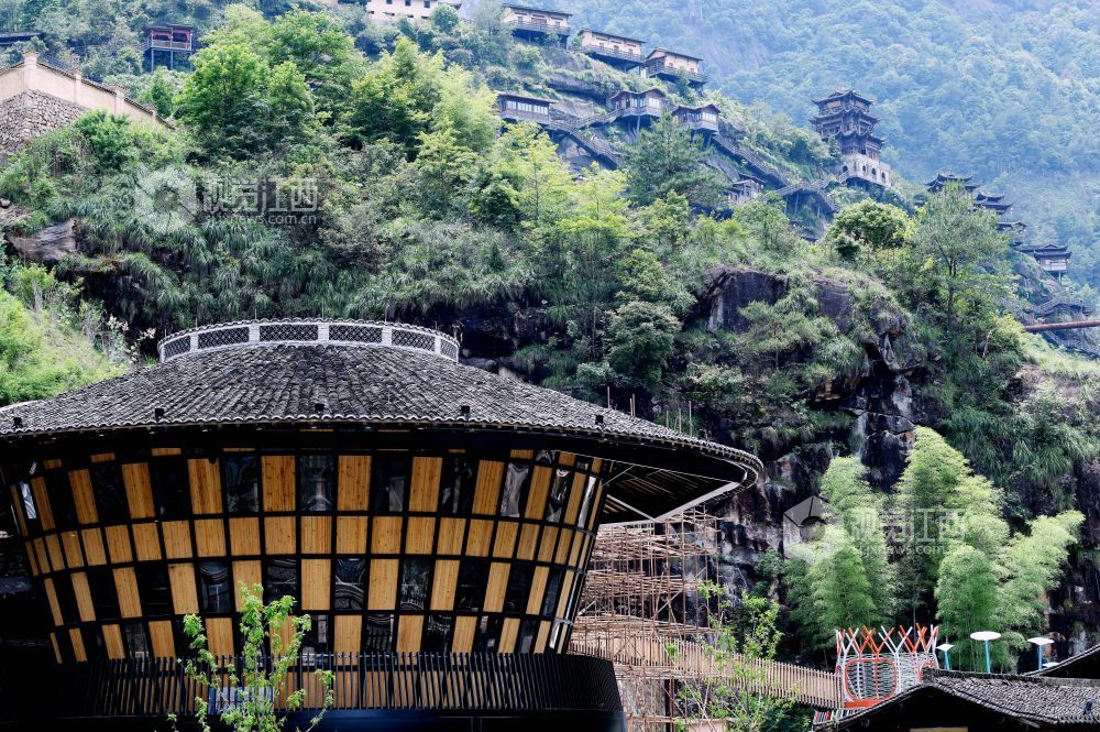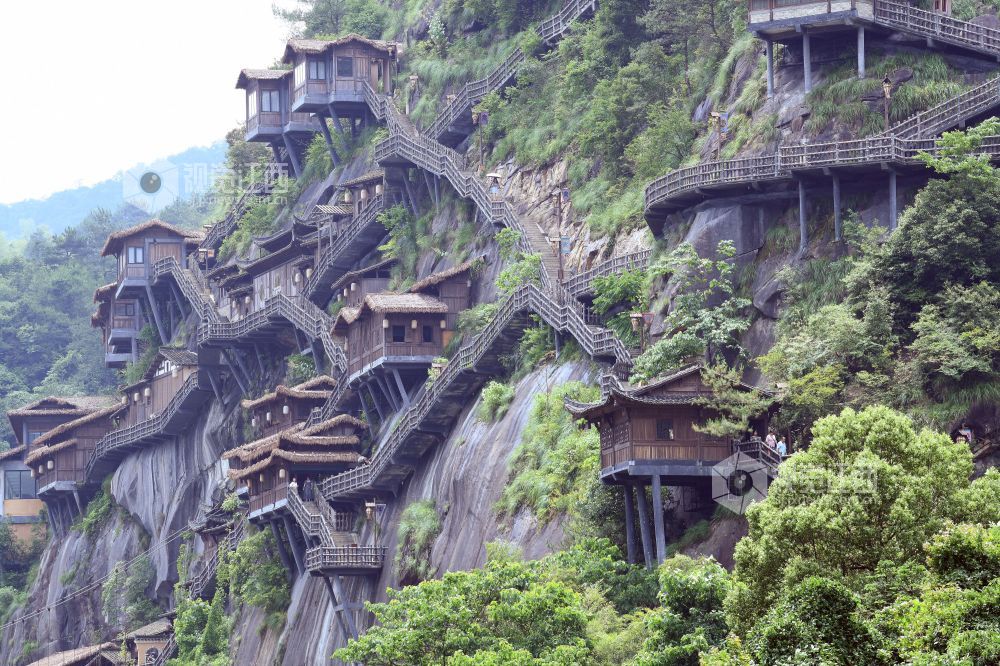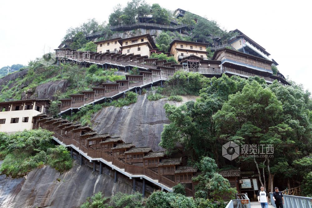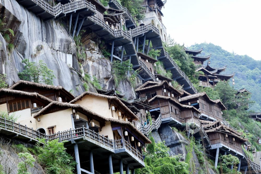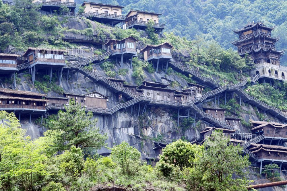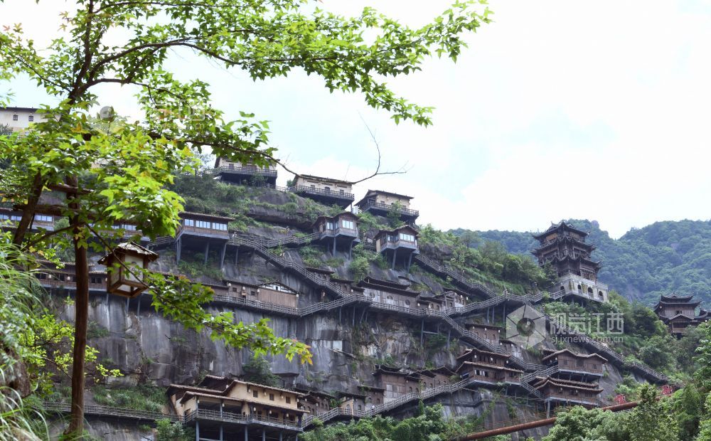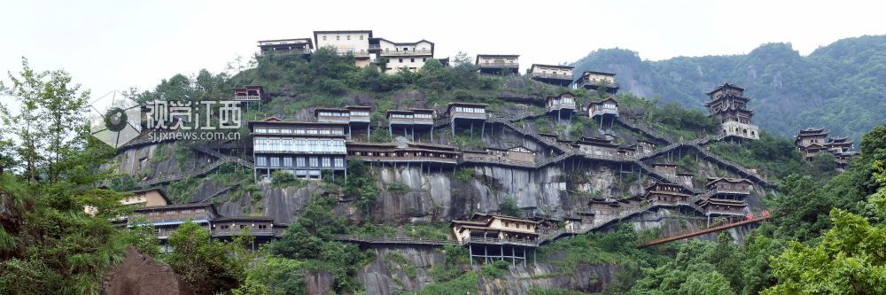 2023年6月10日,远眺江西省上饶市广信区的望仙谷悬崖民宿,彰显我国民间工匠的精湛技艺。