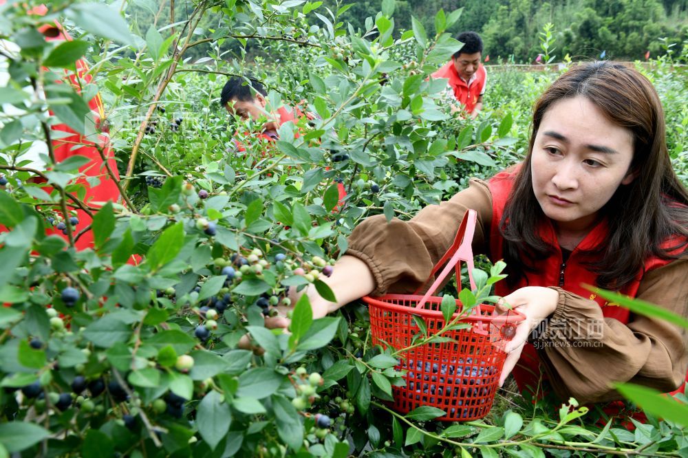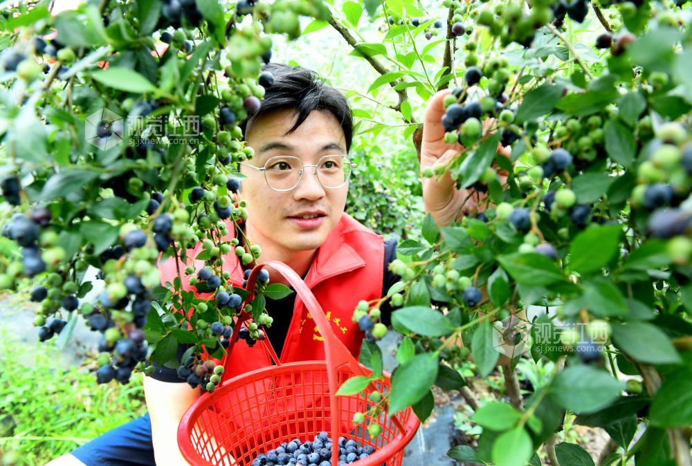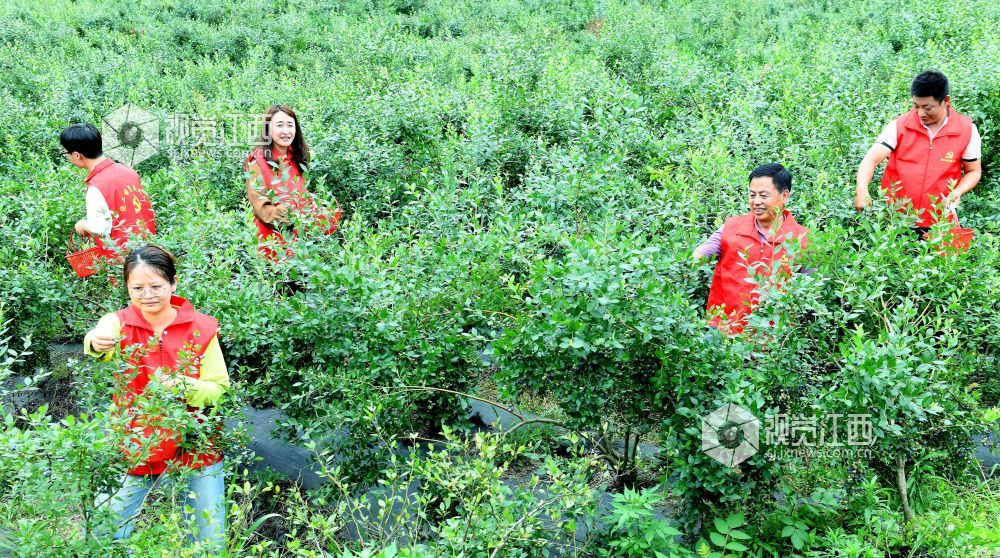 2023年6月14日,江西省德兴市绕二镇党员干部正在该镇花林村帮助农民采摘蓝莓。
