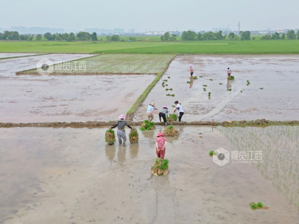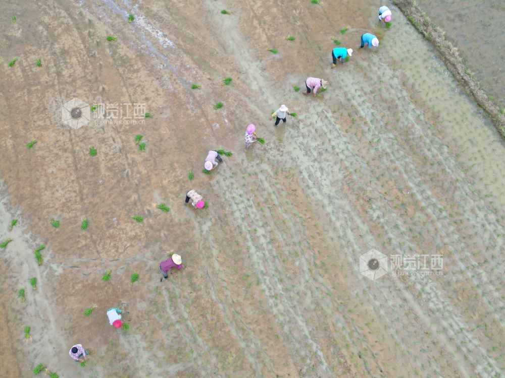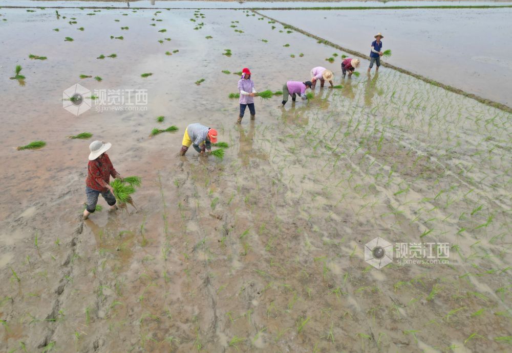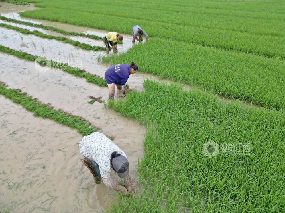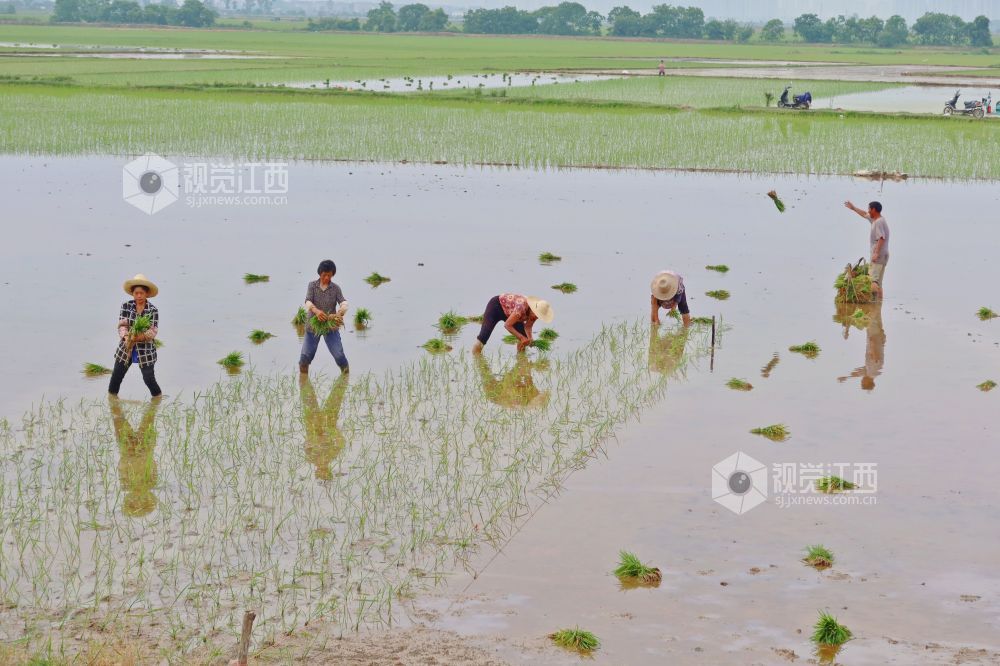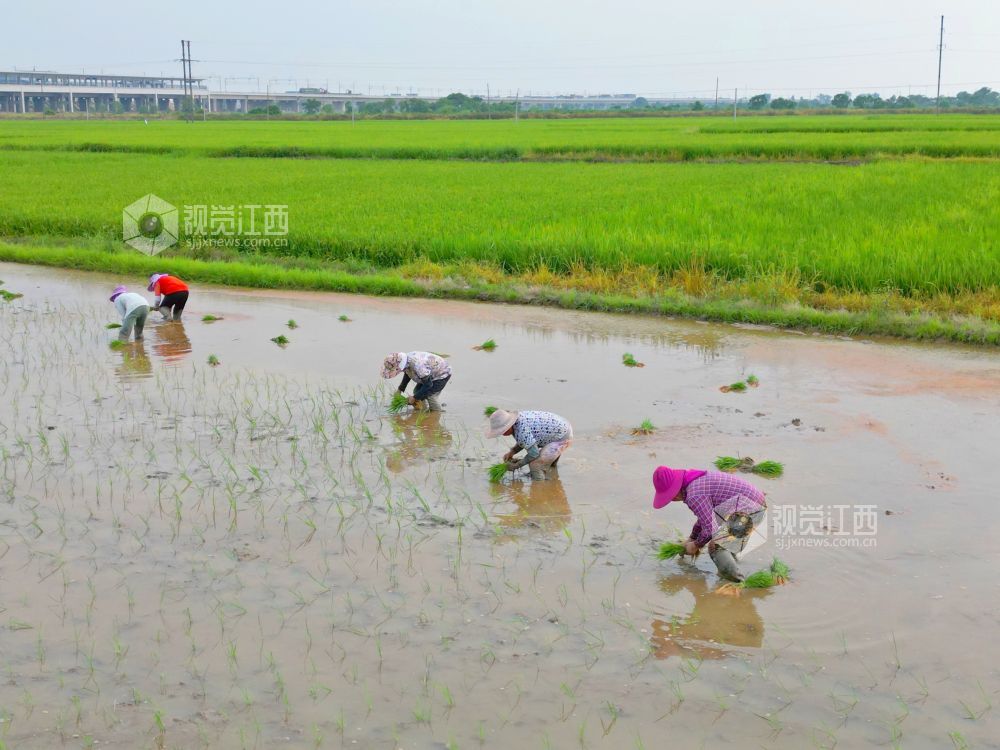 6月17日,江西省余干县鹭鸶港乡沿河村农田里,村民互帮互助,抢抓农时栽插中稻,田间地头,呈现出一幅乡风文明的劳作画卷。