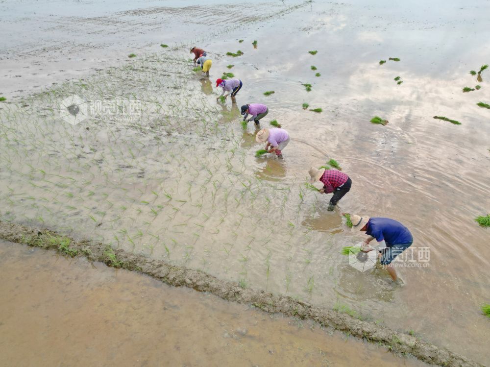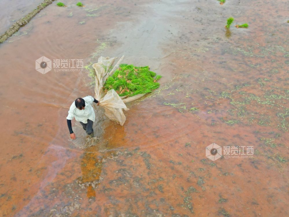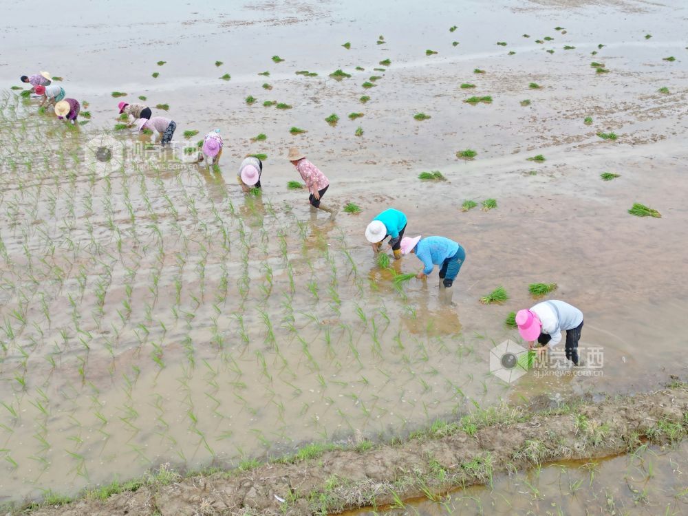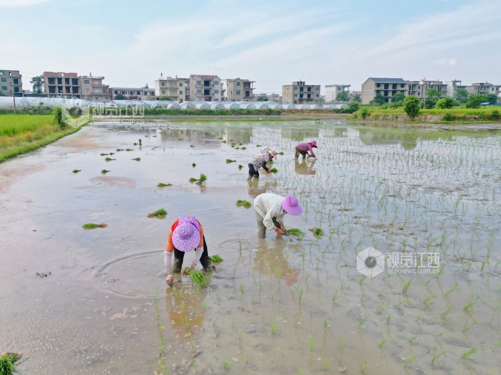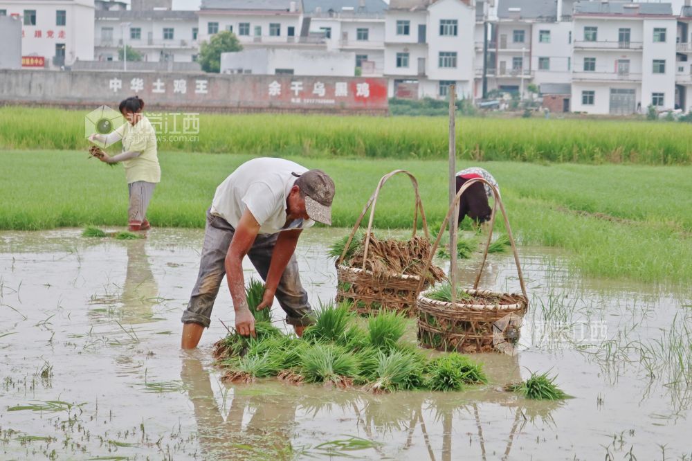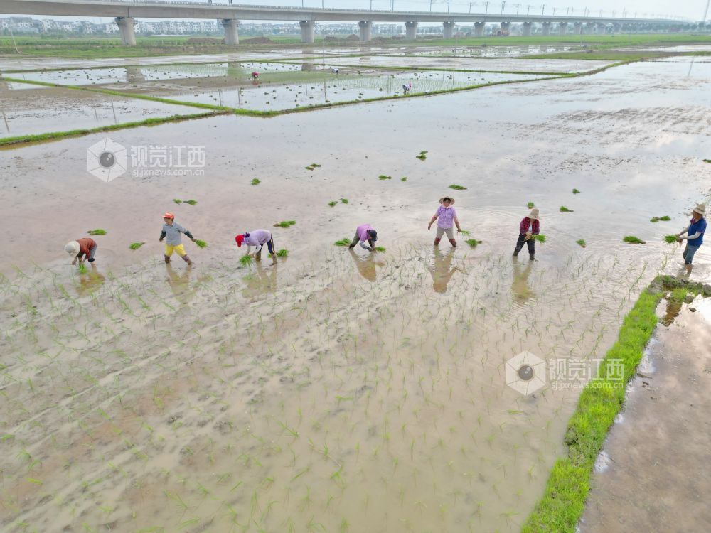 6月17日,江西省余干县鹭鸶港乡沿河村农田里,村民互帮互助,抢抓农时栽插中稻,田间地头,呈现出一幅乡风文明的劳作画卷。