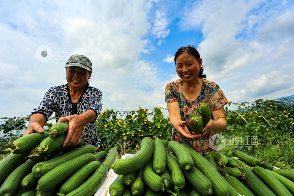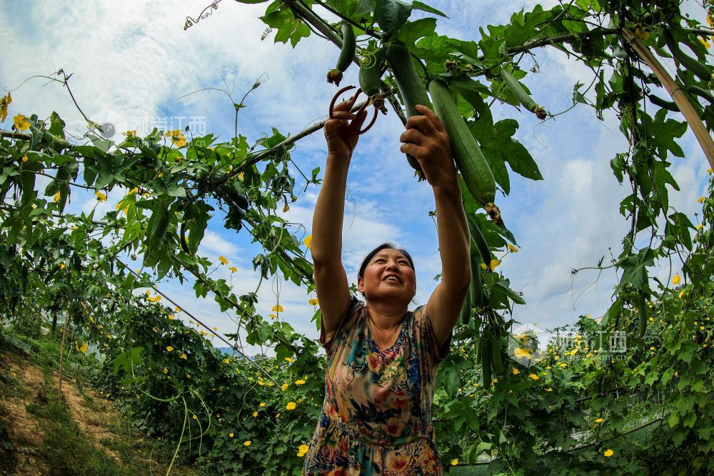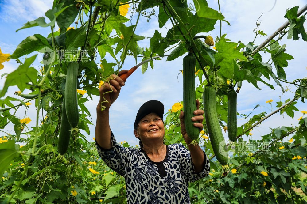 2023年6月18日,江西省瑞昌市横港镇九江市辉祥有机果蔬专业合作社,农民正在设施蔬菜大棚内采摘丝瓜,准备销往各地市场。