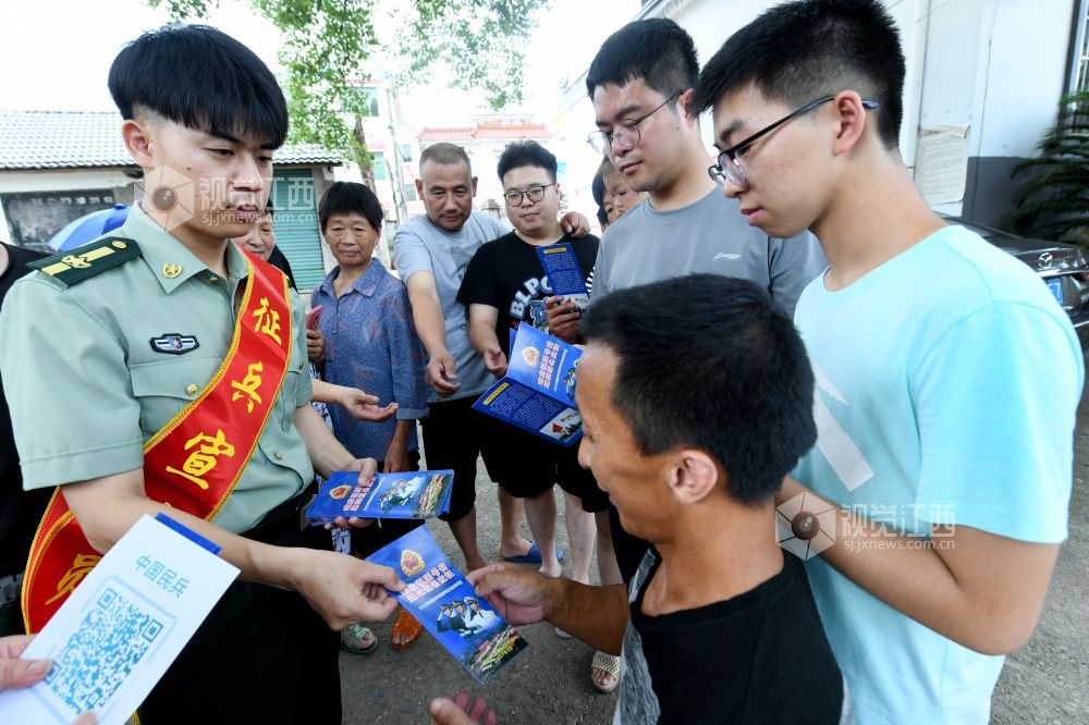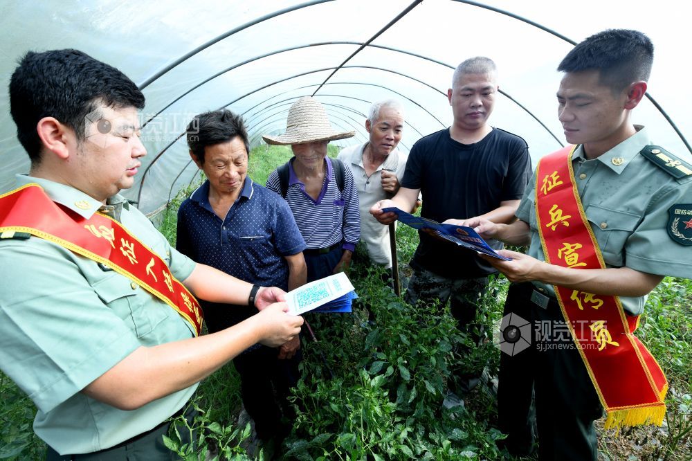 2023年6月18日,江西省德兴市花桥镇武装部干部正在该镇黄柏洋村,现场给村民讲解国家的征兵政策和服兵役的优越性。