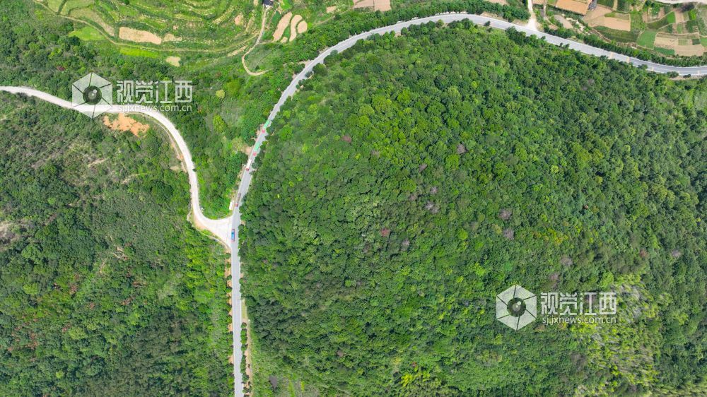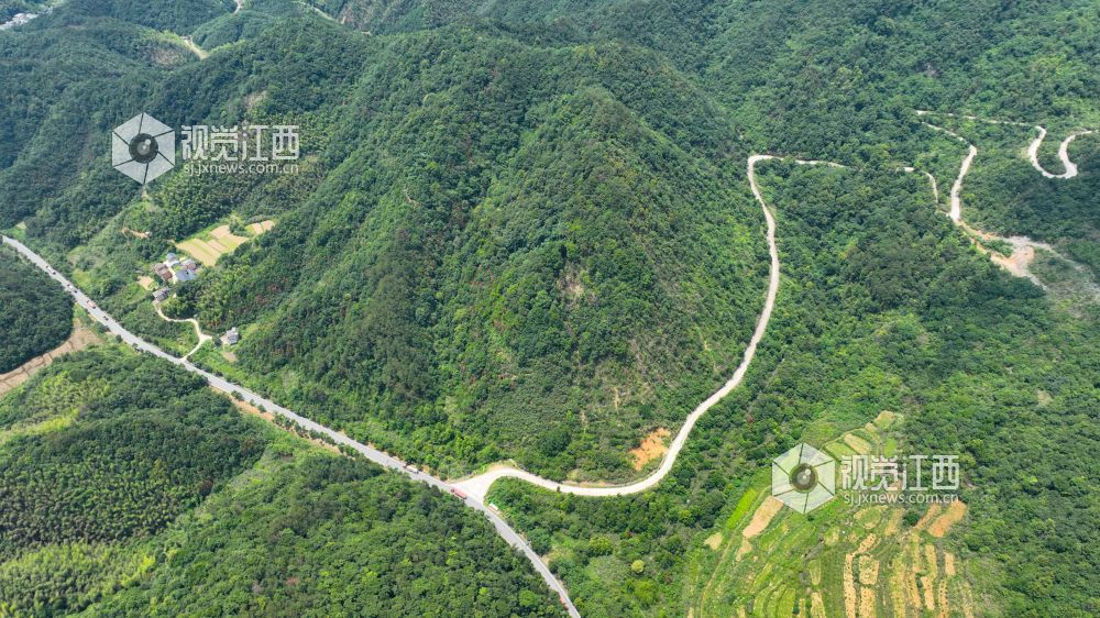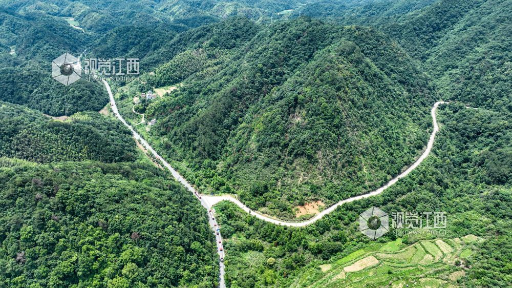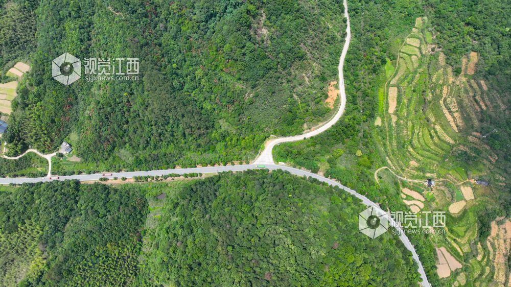 2023年6月19日,航拍下的瑞昌市横港镇乡村公路蜿蜒盘旋在崇山峻岭之间。