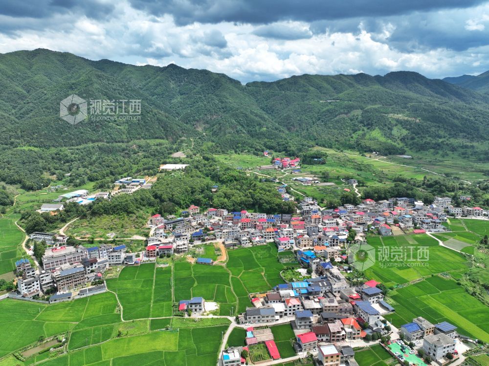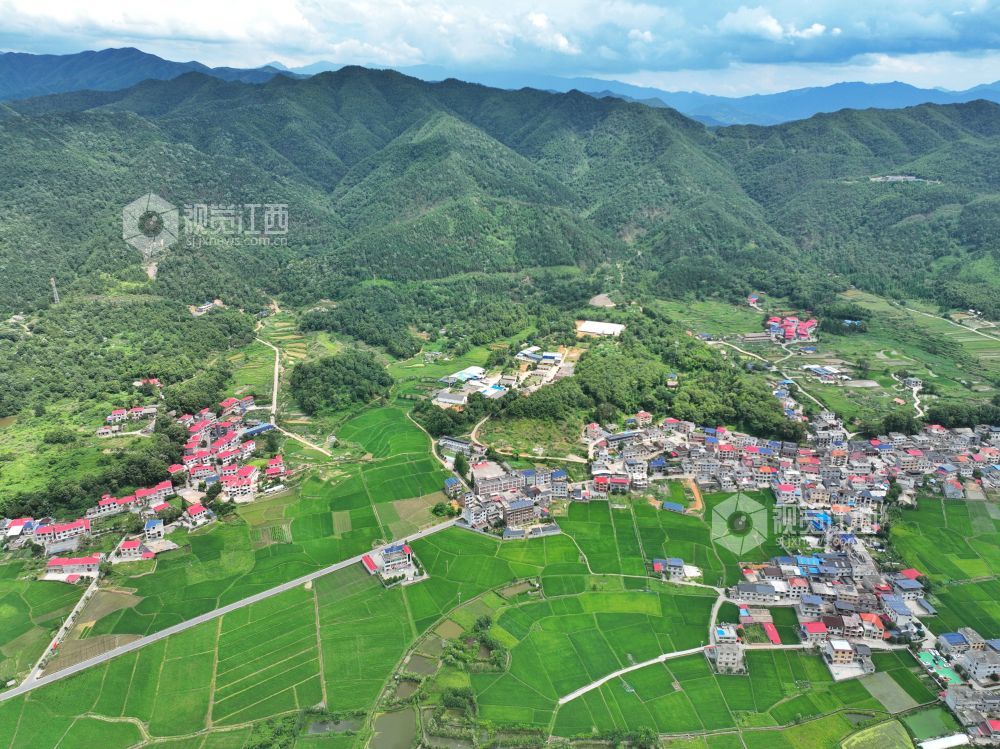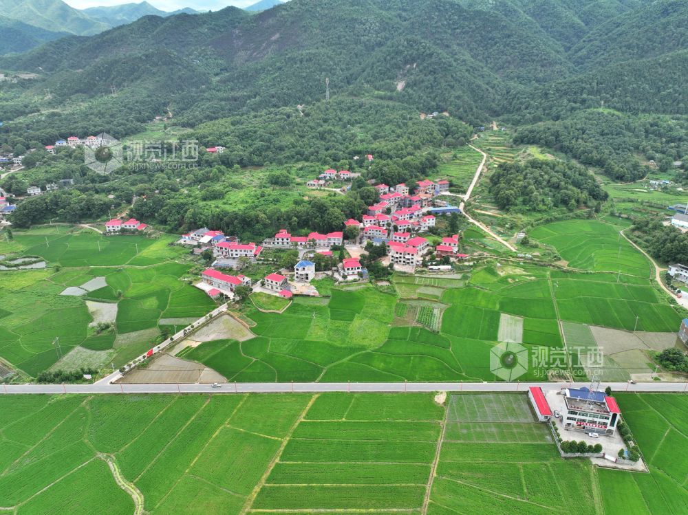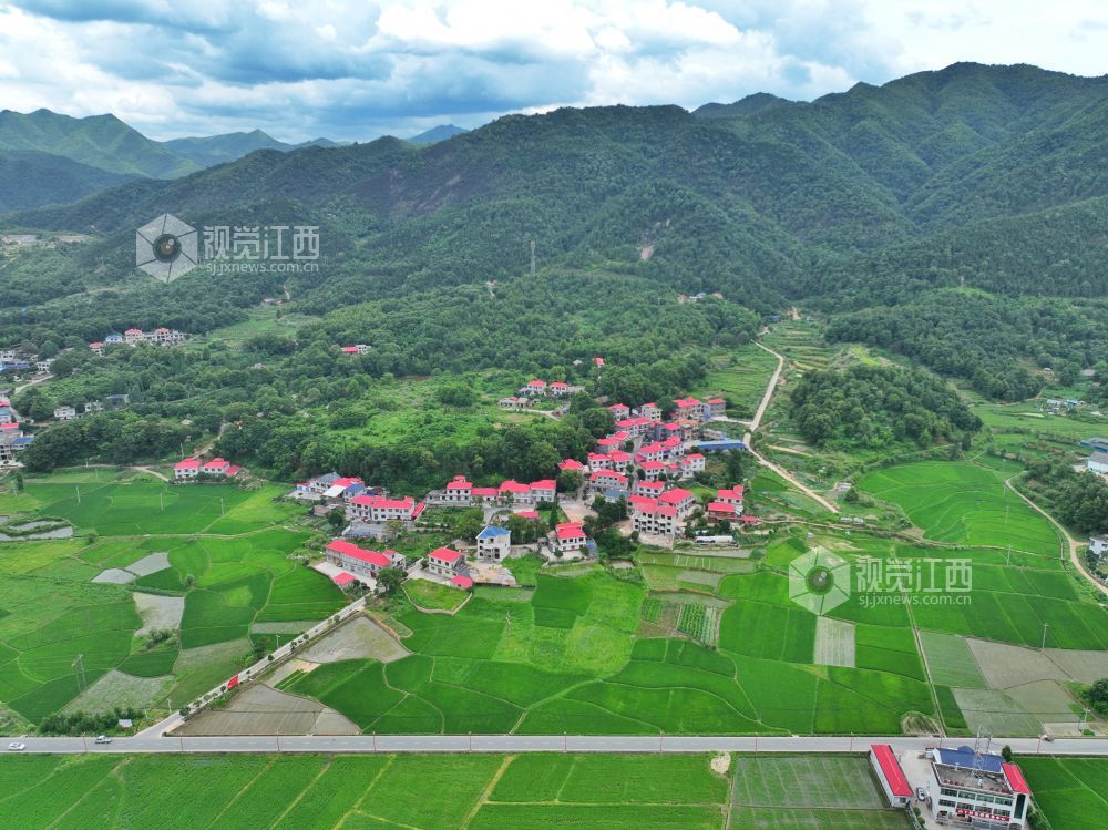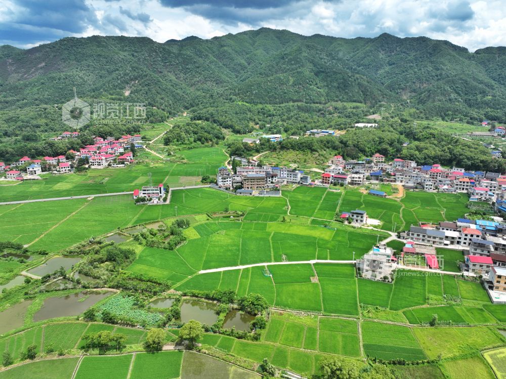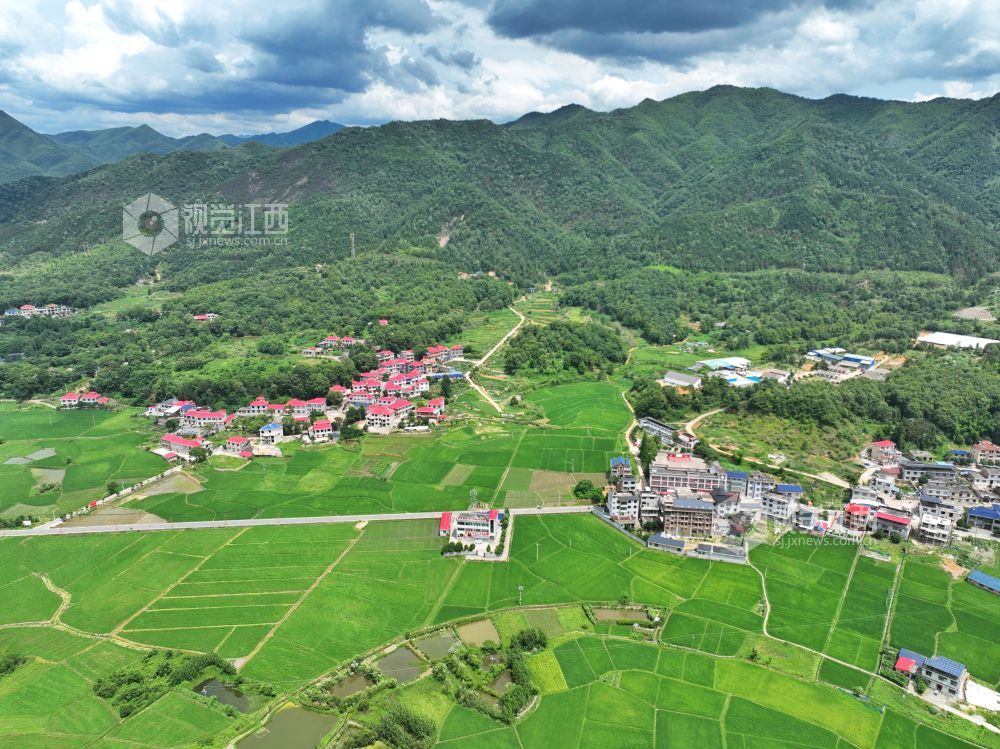 2023年6月19日,江西省萍乡市芦溪县芦溪镇山下村,青山、绿树、民居、田园、道路等相映成景,构成一幅美丽的夏日乡村田园风景。