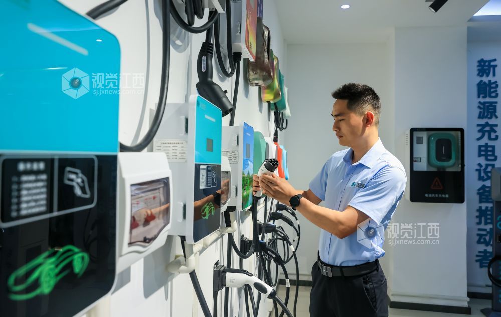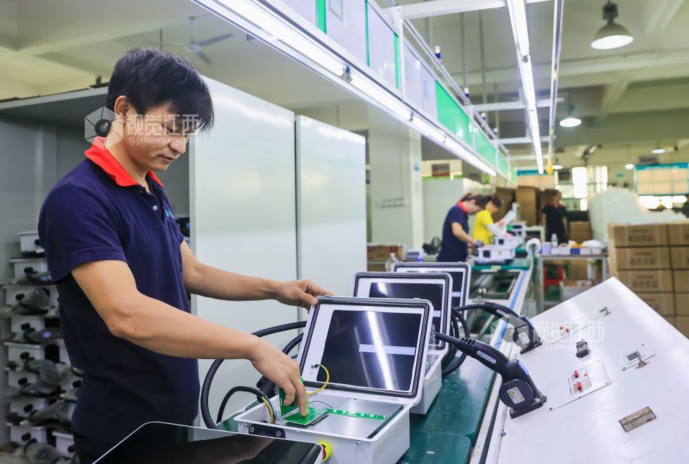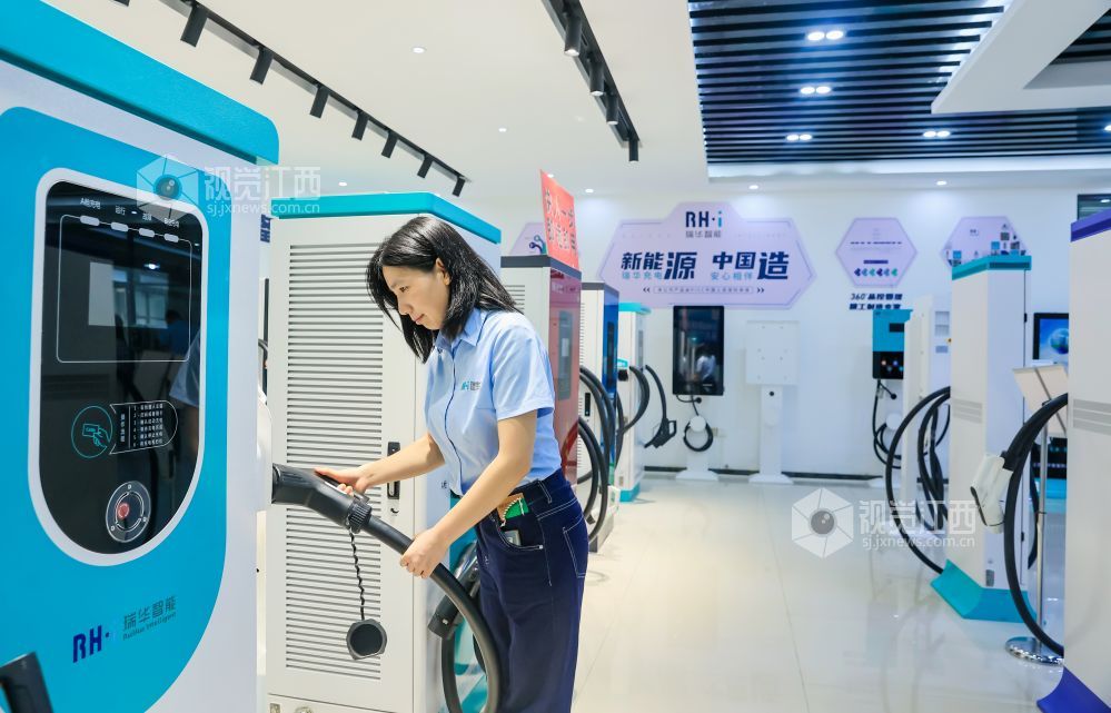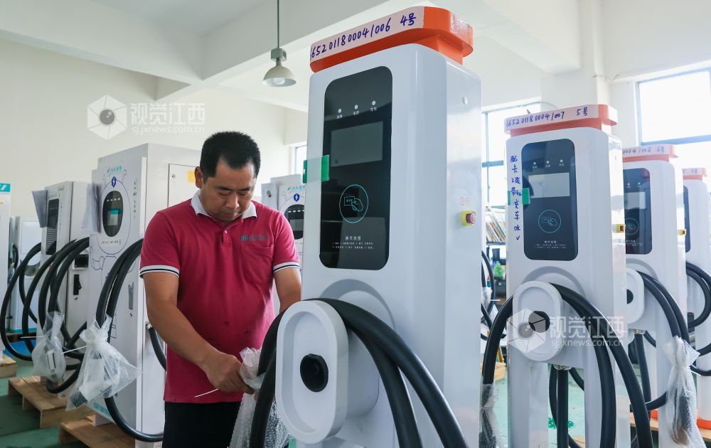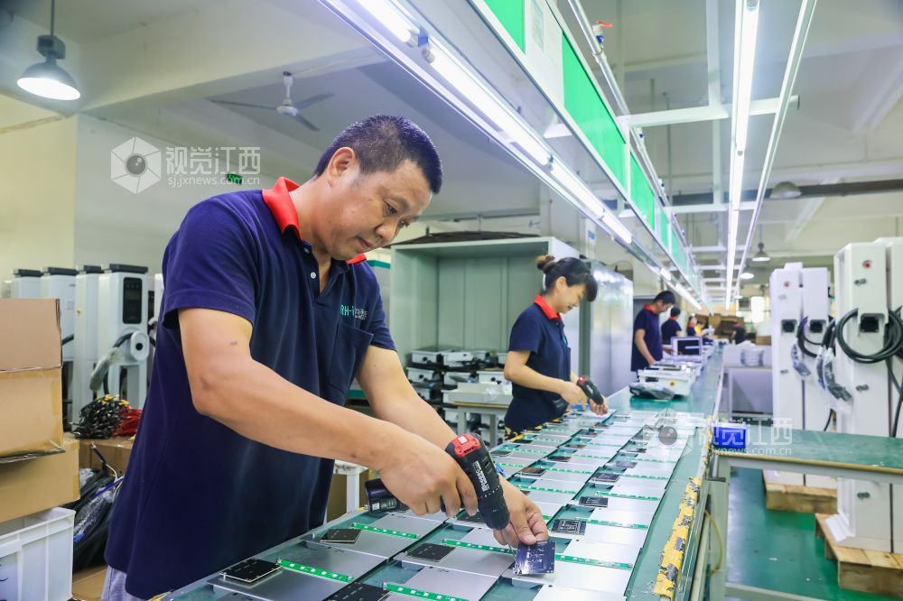 2023年6月20日,江西省瑞昌经开区科技园江西瑞华智能科技有限公司生产车间内,工人正在赶制新能源汽车智能无线充电桩。
