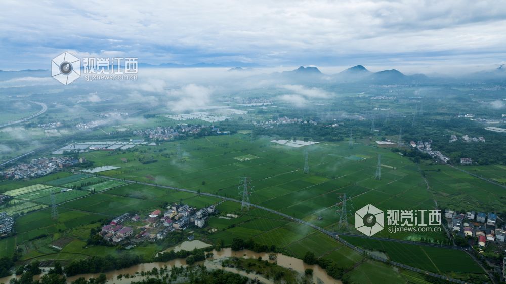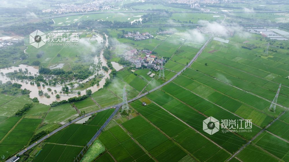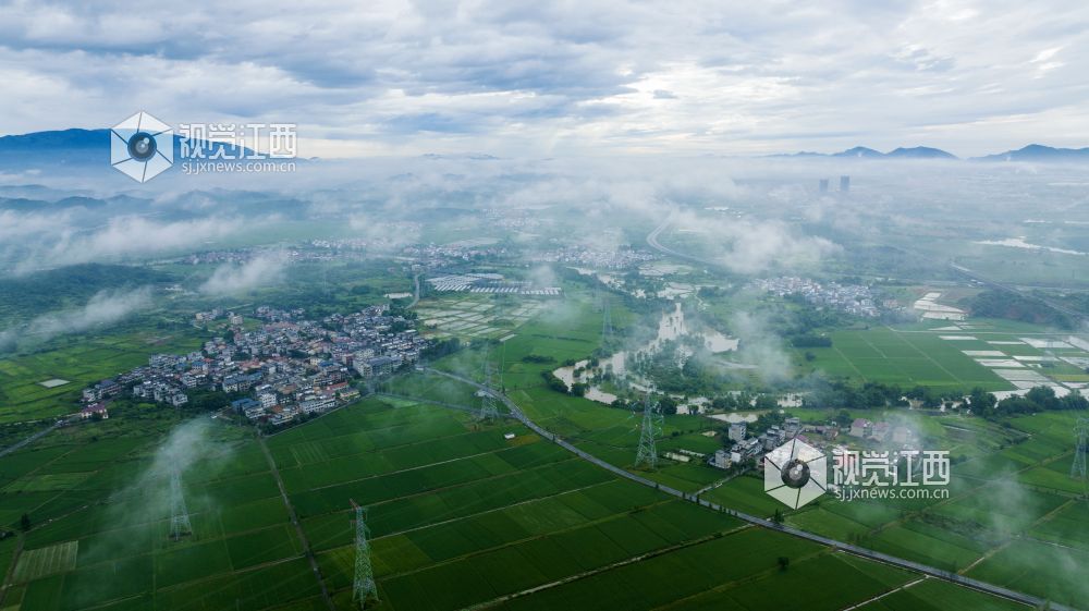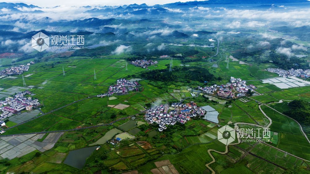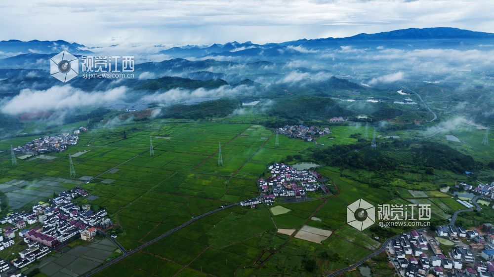 6月26日清晨,航拍雨后江西新余仙女湖区观巢镇,只见云雾缭绕下的大地绿意盎然,农房、稻田、道路与绿树交相辉映,呈现出一幅美丽的田园画卷。