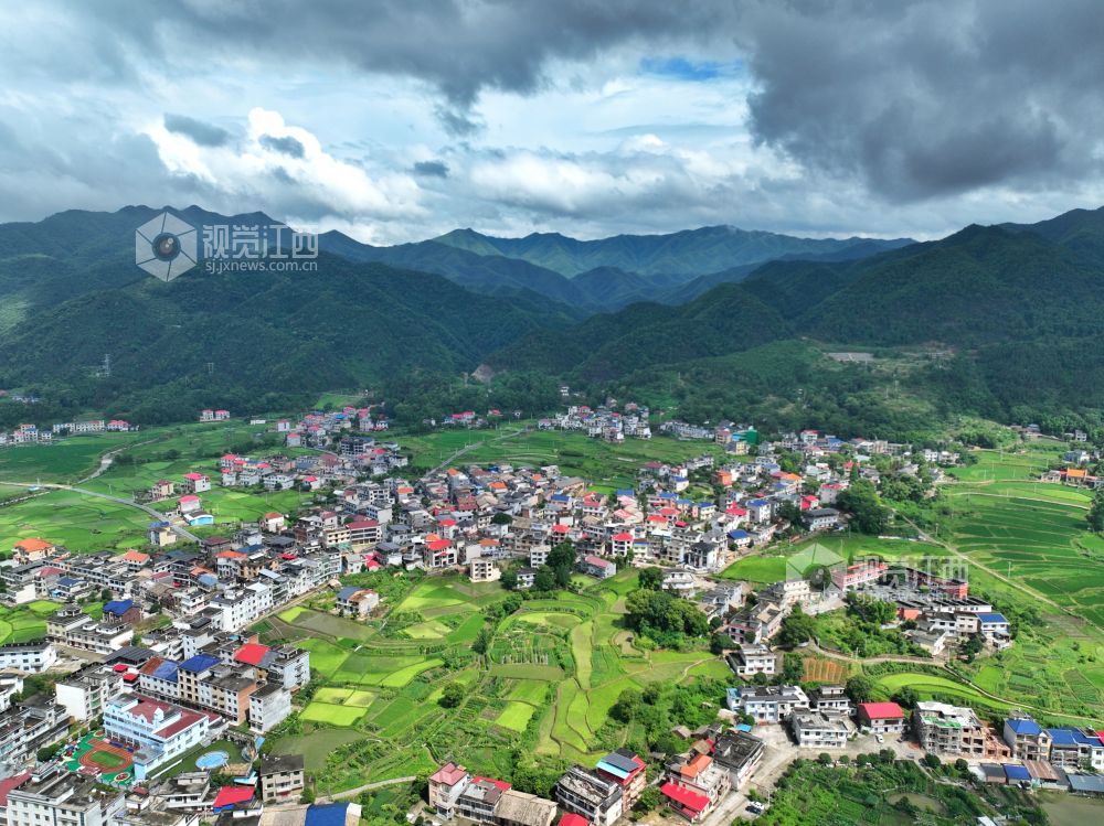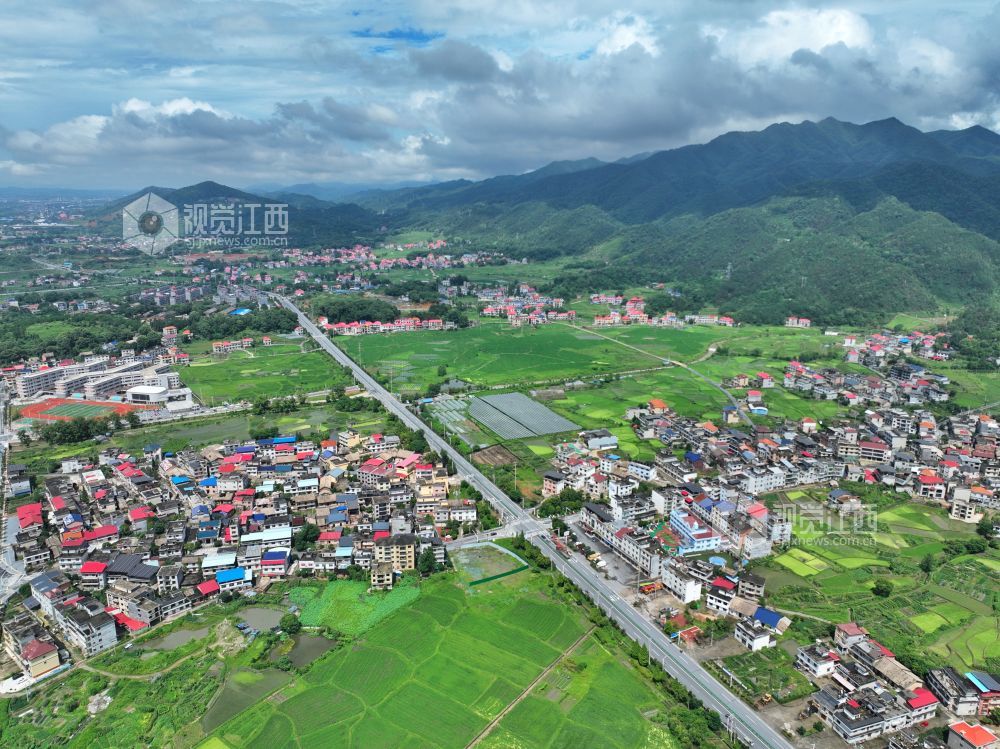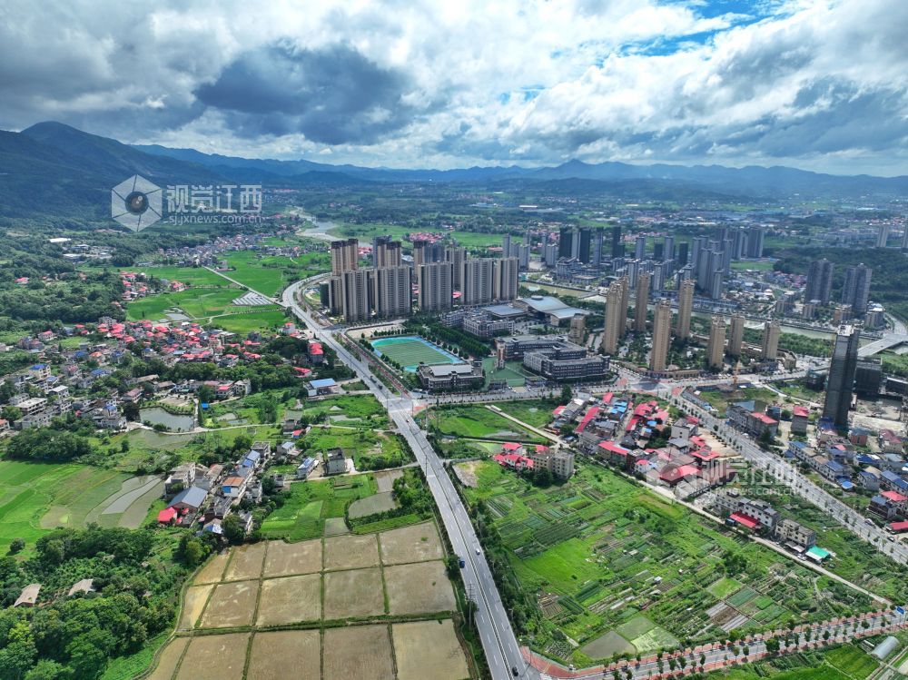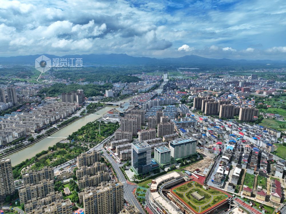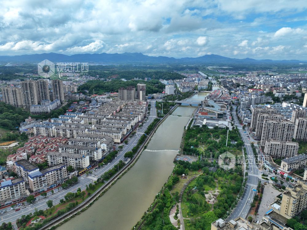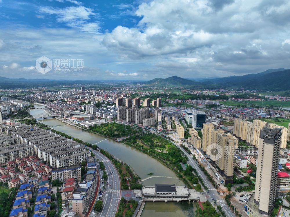 2023年6月26日,江西省萍乡市芦溪县城在蓝天白云的映衬下,碧水蓝天,白云朵朵,美不胜收。
