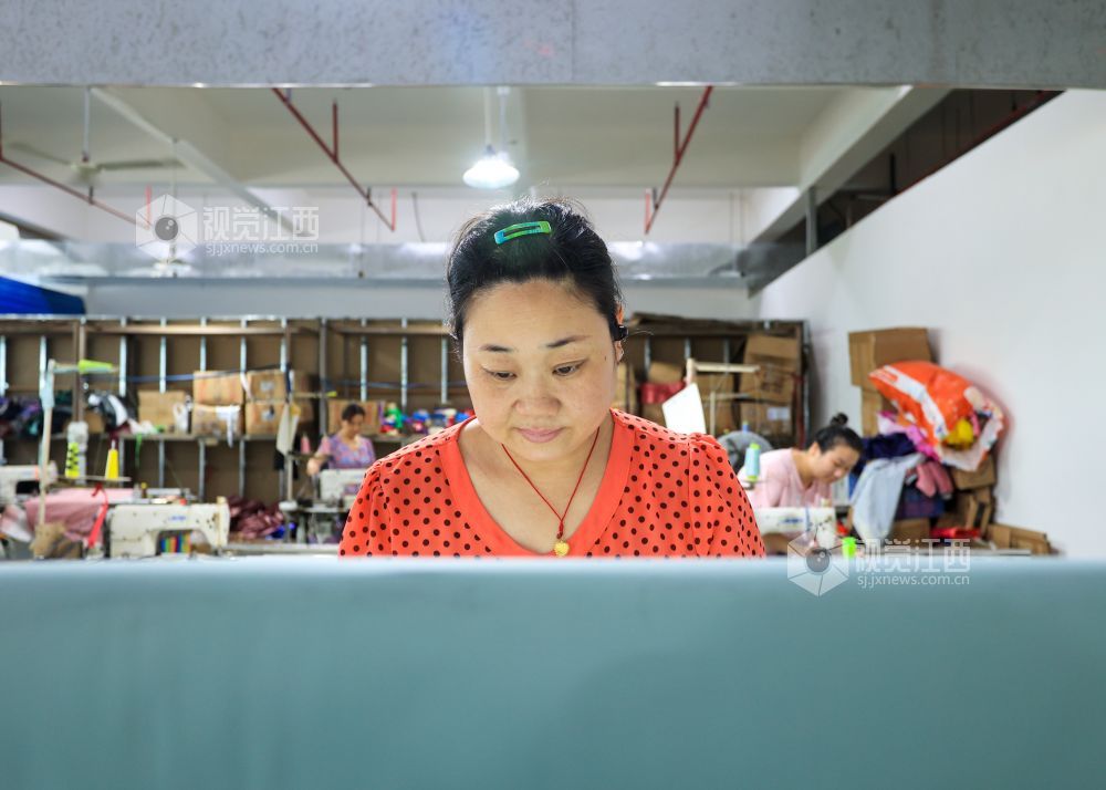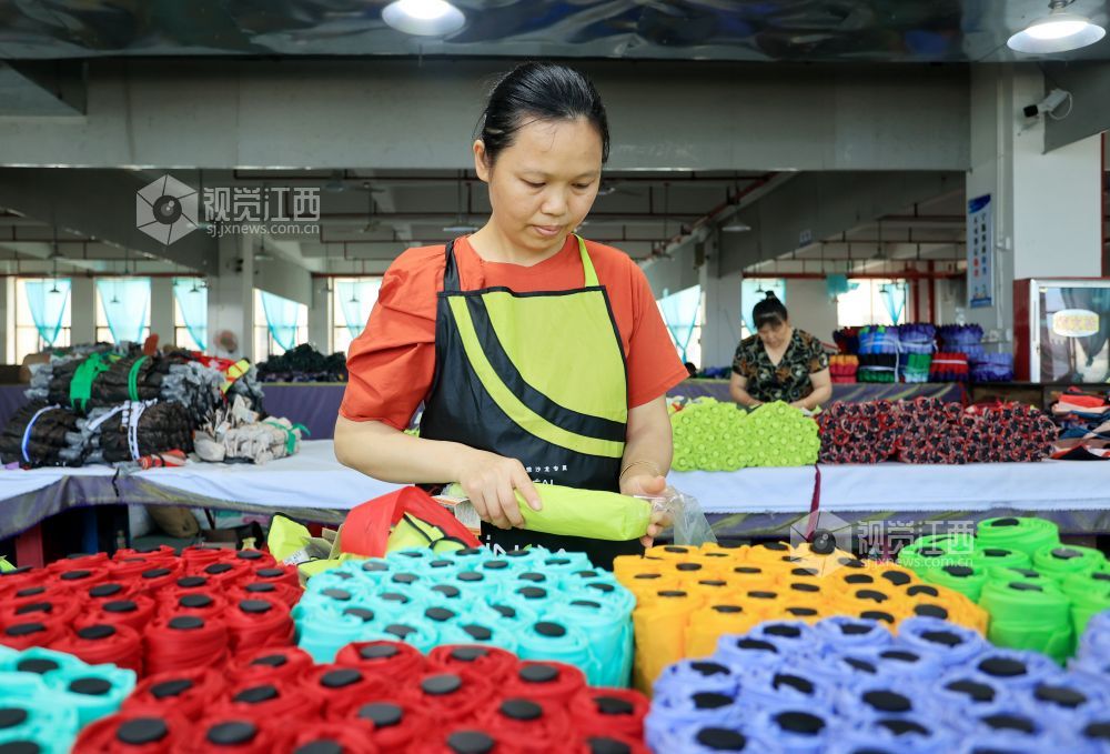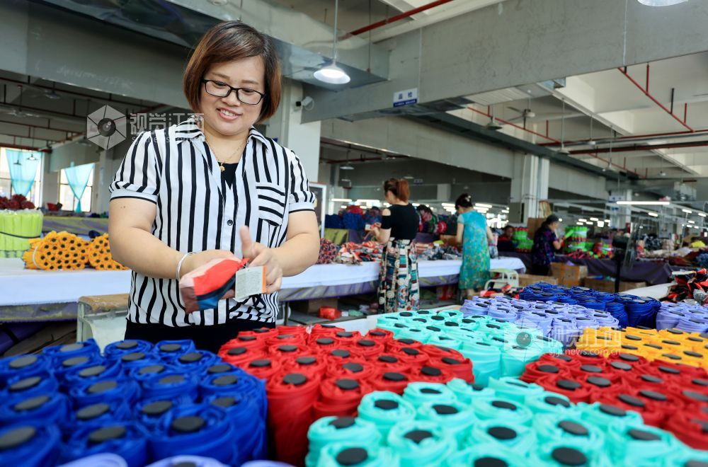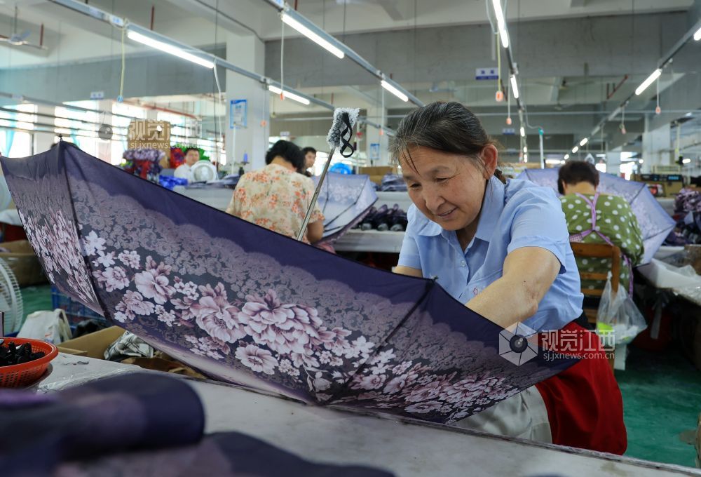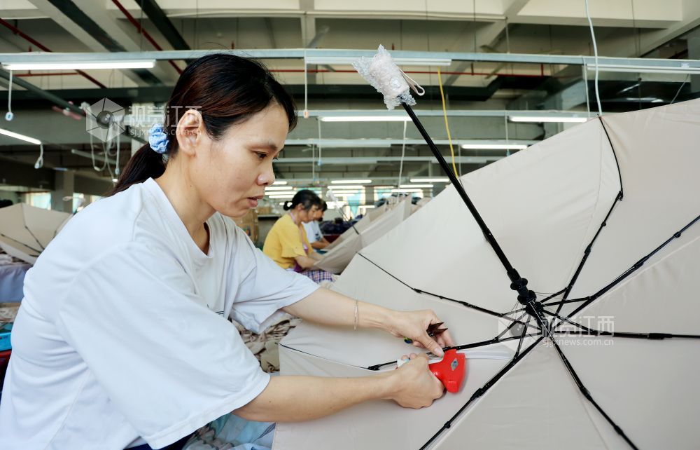 2023年6月27日,江西省瑞昌经开区科技园一公司生产车间内,工人正在加工生产雨伞。