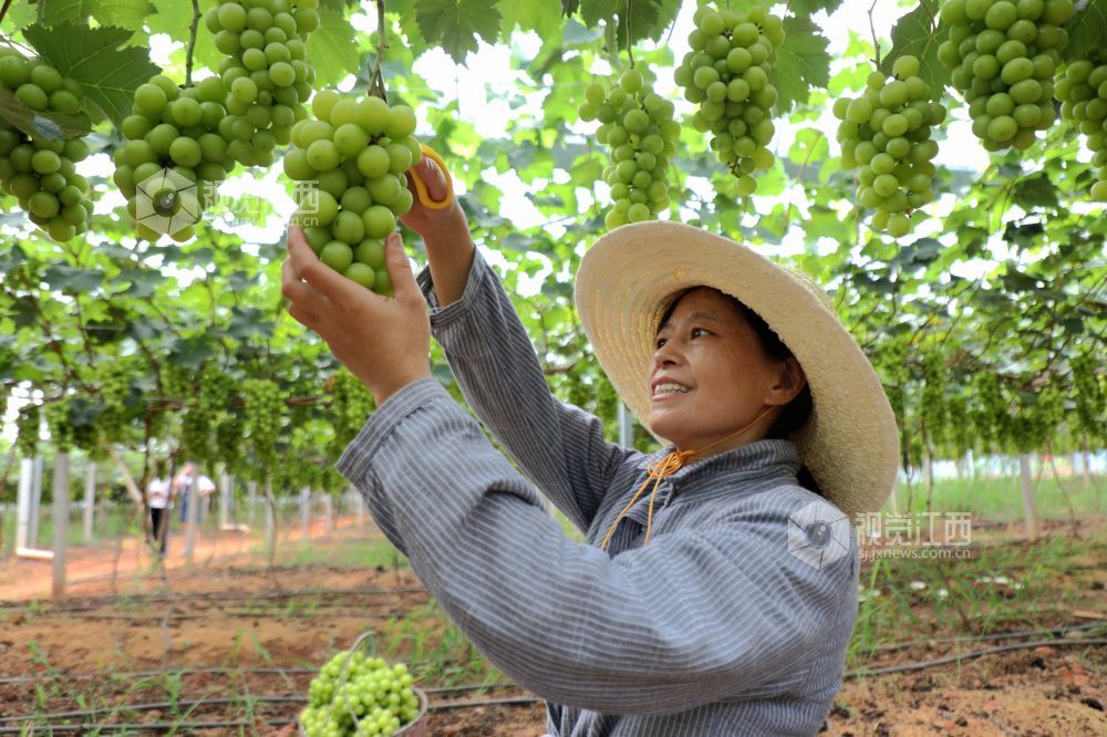 2023年6月27日,江西省吉安市峡江县马埠镇淘乐园果业合作社的葡萄园内,果农正在采摘成熟的阳光玫瑰葡萄。