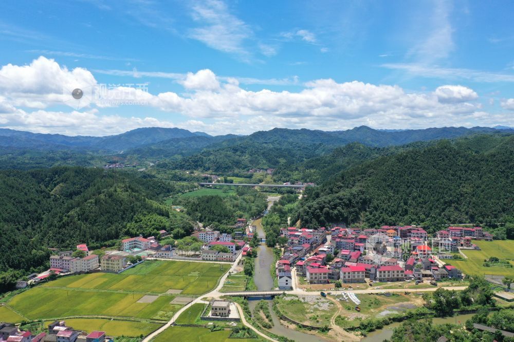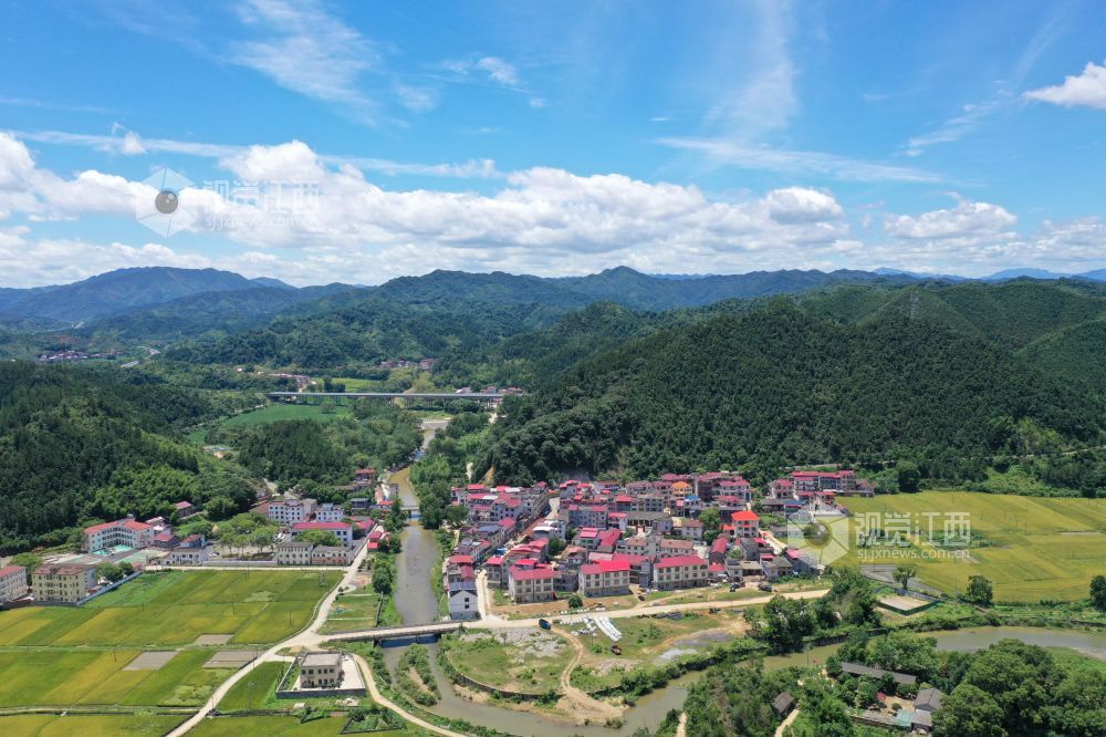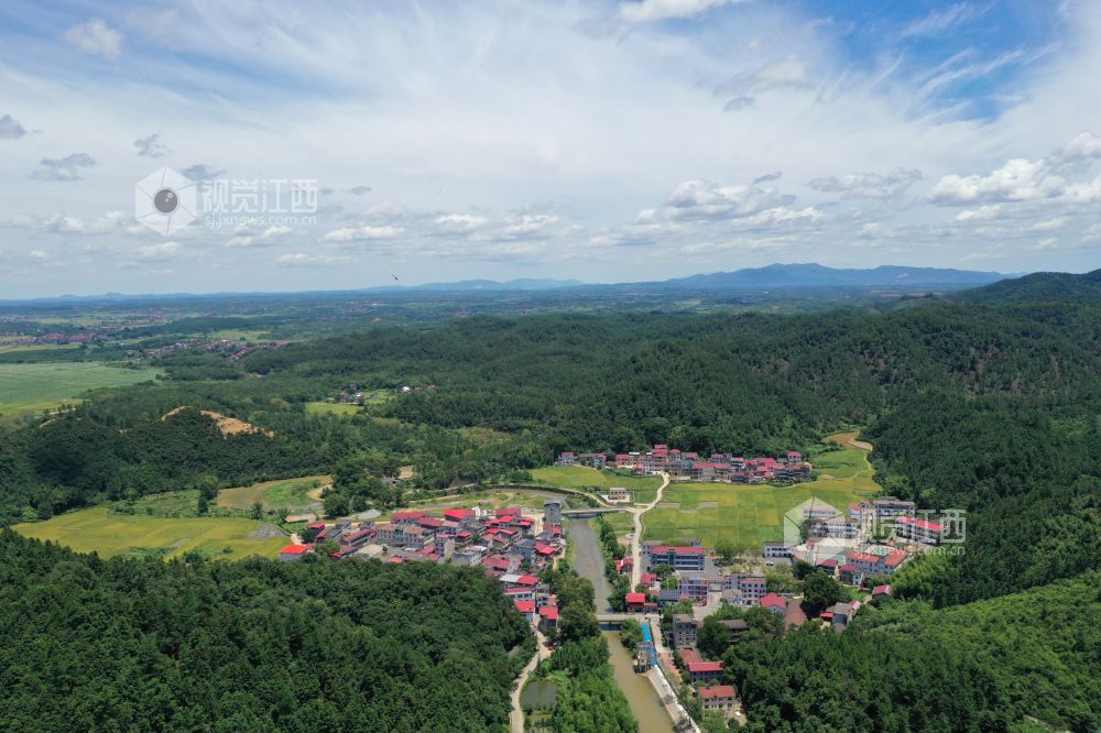 6月28日,航拍下的江西省泰和县中龙乡百记村风景如画,稻田、村庄、河流在蓝天白云的映衬下构成了一幅美丽的乡村画卷,令人陶醉。