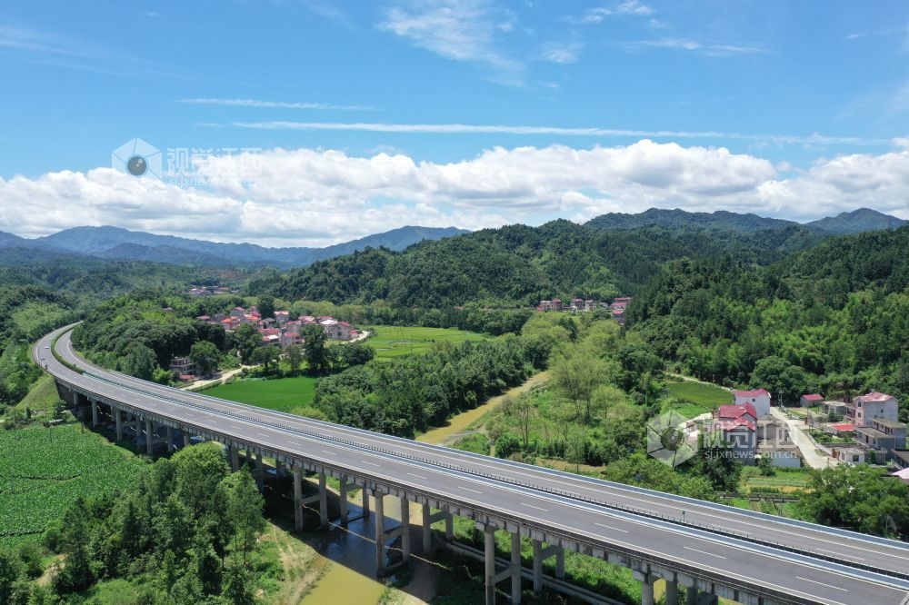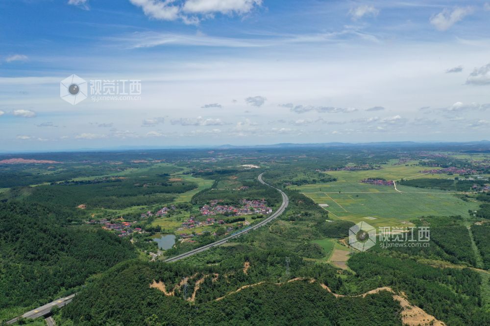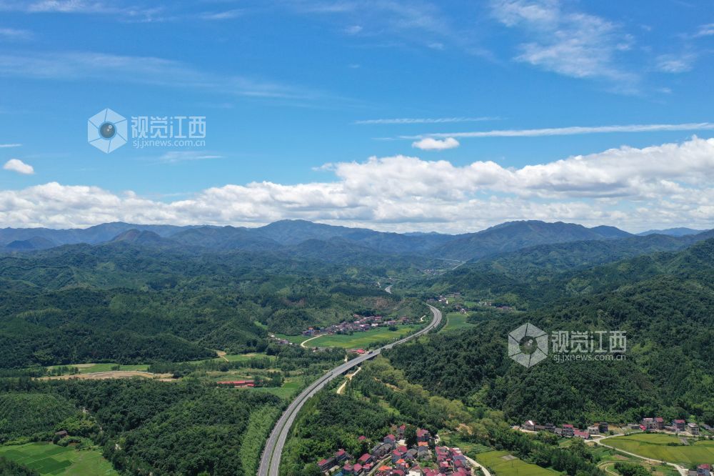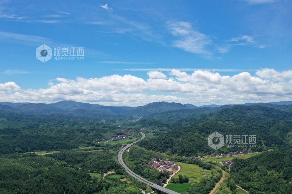 6月28日,俯瞰江西省泰和县中龙乡境内的泉南高速,在蓝天白云的映衬下,犹如一条银色丝带,穿越着青山绿水,呈现出一幅美丽的夏日画卷。