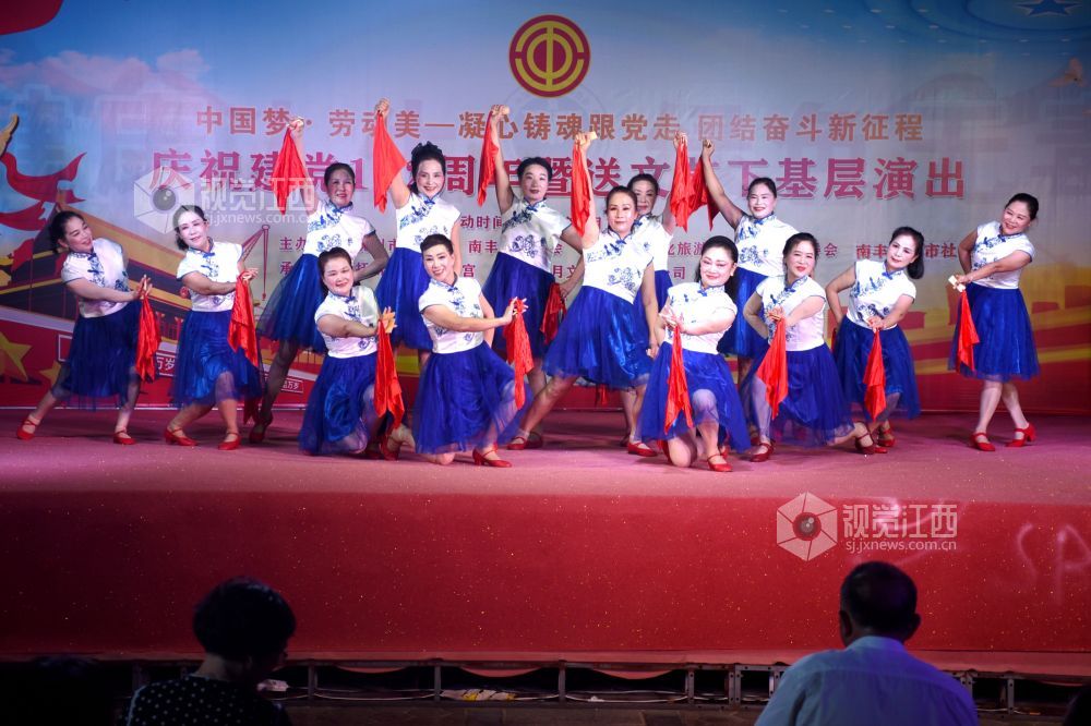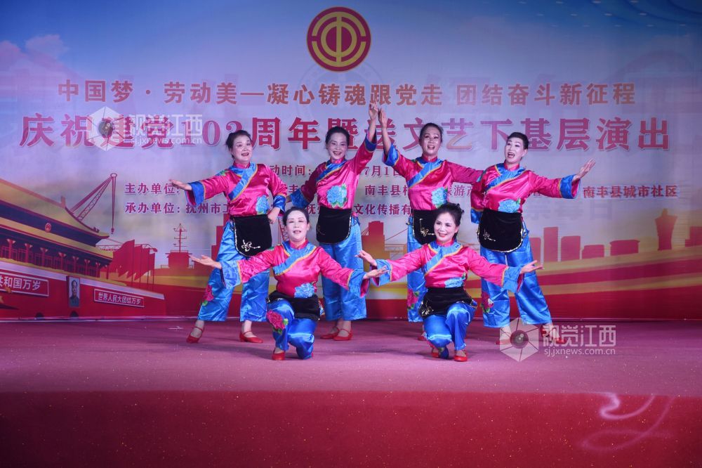此次“中国梦·劳动美——凝心铸魂跟党走 团结奋斗新征程”庆祝建党102周年暨送文艺下基层演出由抚州市总工会、南丰县总工会、县桔文化旅游产业集聚区管委会、县城市社区主办。整场演出共11个节目,形式多样、内容丰富。演出在开场舞《花开中国》中拉开序幕,强劲的音乐、激情的节奏、动感的舞蹈吸引着人们的目光。之后演出的节目丰富多彩,独唱《阳光路上》,器乐演奏《工会颂》《不染》《大鱼》,小品《快递小哥》,采茶戏《王妈妈数鸡》,诗朗诵《安全第一》等节目,最后,舞蹈《让中国更美丽》把文艺演出活动推向了高潮。