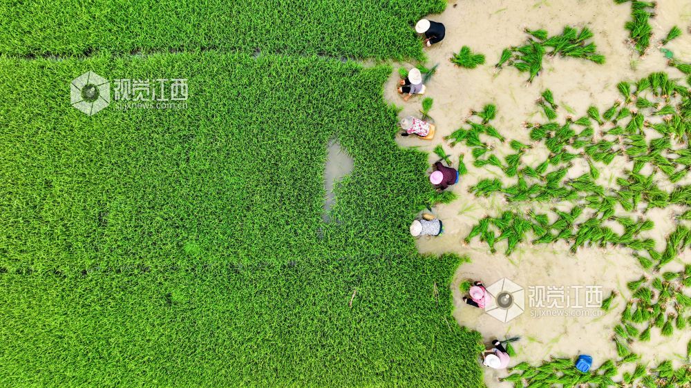 2023年7月2日,江西省瑞昌市赛湖农场三分场,农民在水田里拔秧、插秧。