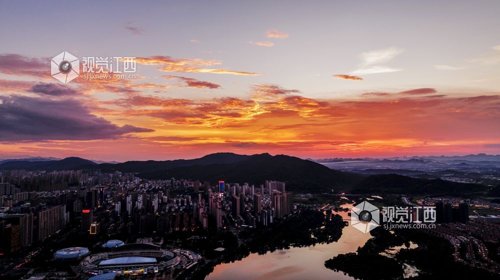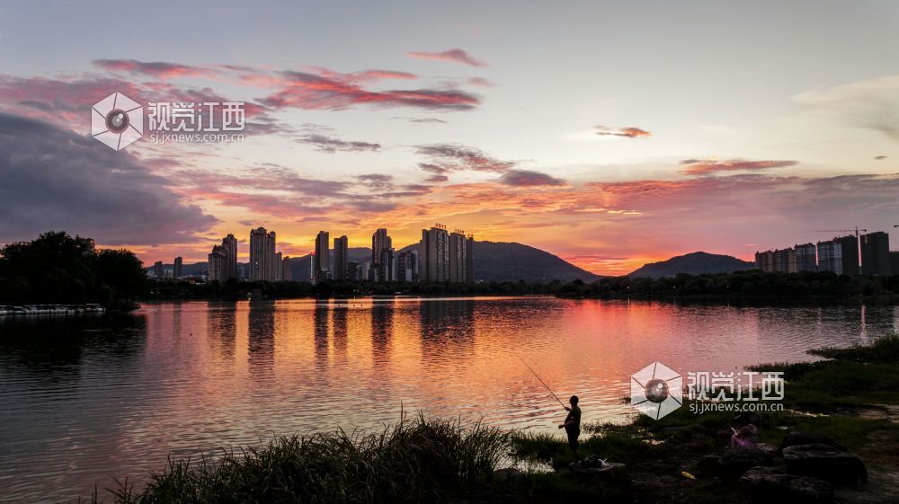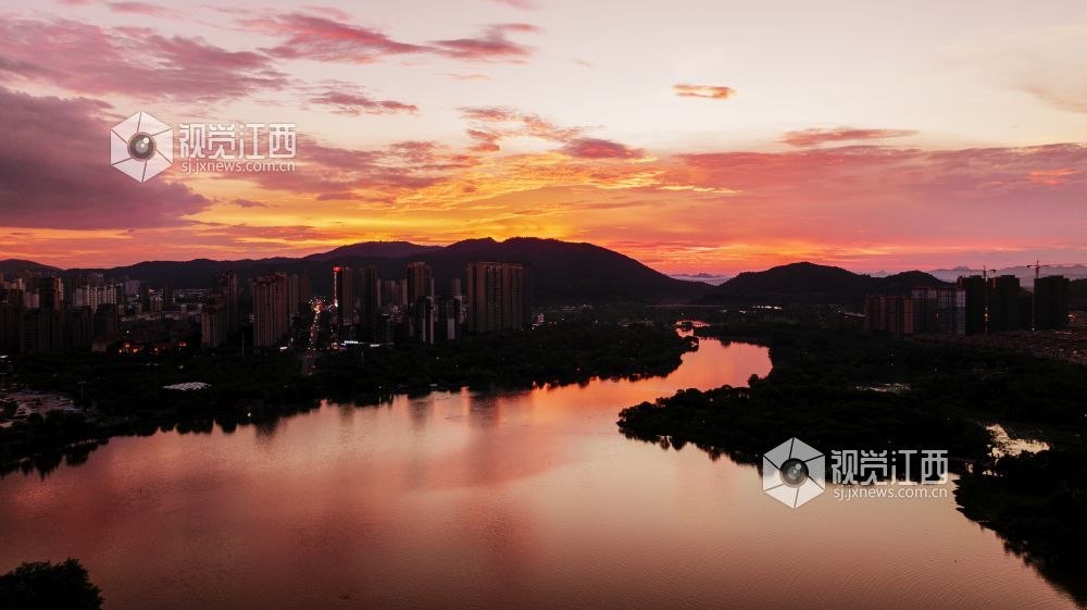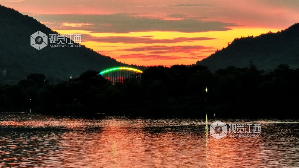 7月5日傍晚时分,雨天的江西新余孔目江国家湿地公园和仰天岗国家森林公园上空迎来绚丽晚霞,水天一色,美丽如画。