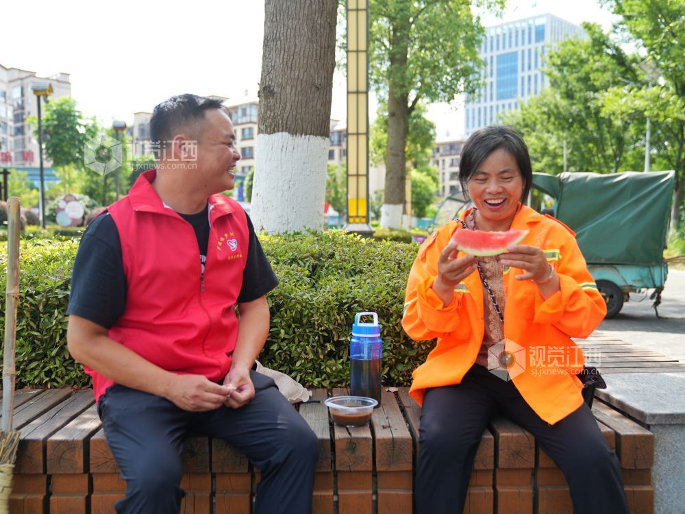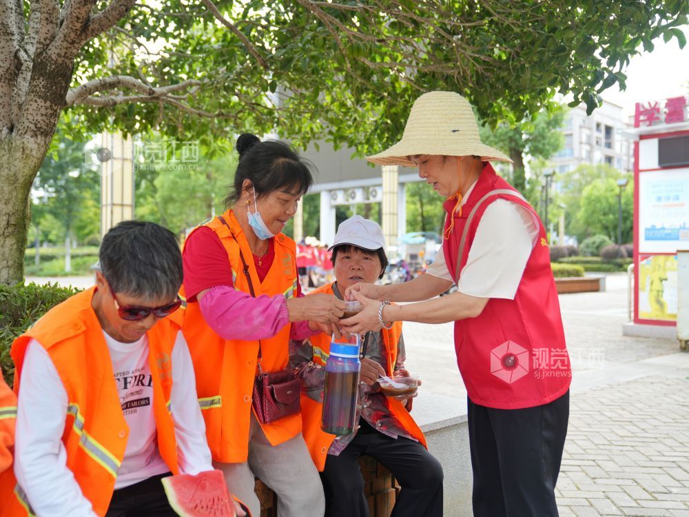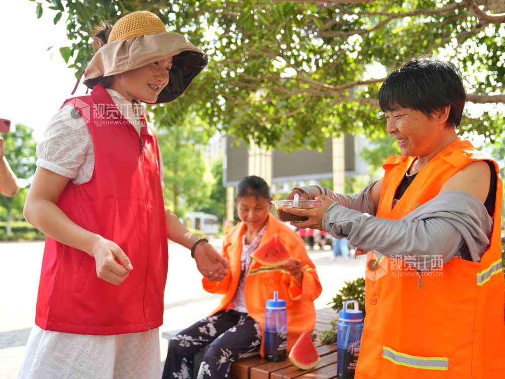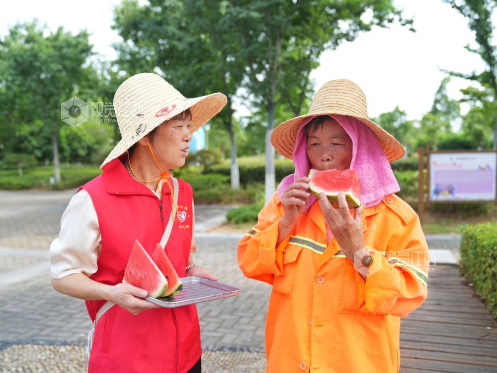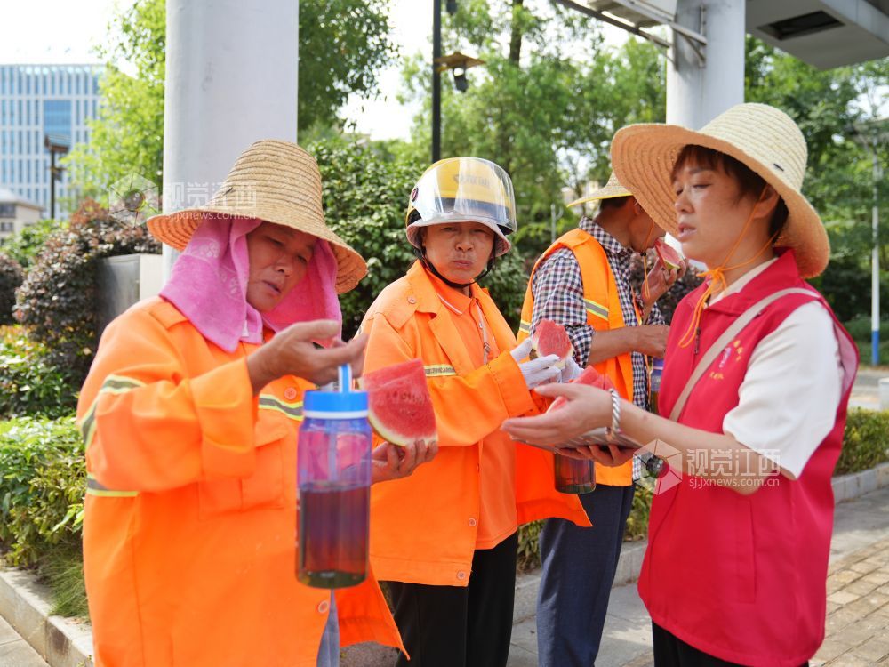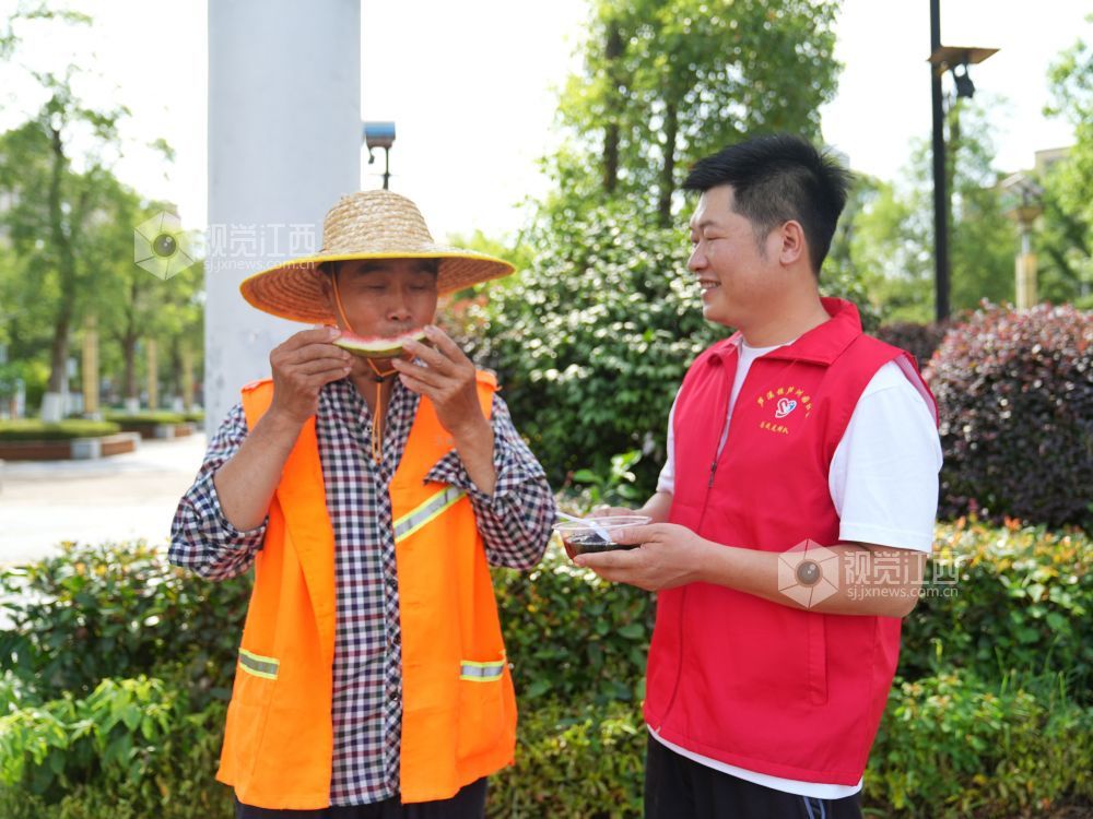 2023年7月7日,江西省萍乡市芦溪县芦溪镇芦洲园社区组织志愿者开展“送清凉 送关怀”活动,为辖区环卫工人送西瓜、凉茶、绿豆稀等防暑降温生活物品,让他们在炎炎夏日感受清凉和关怀。