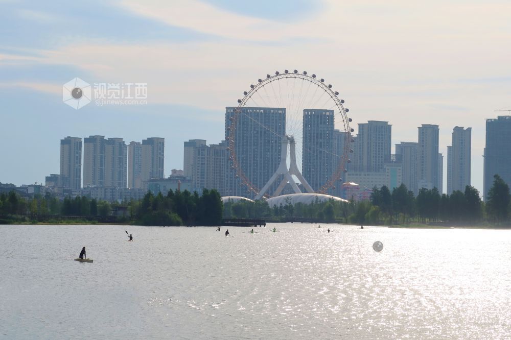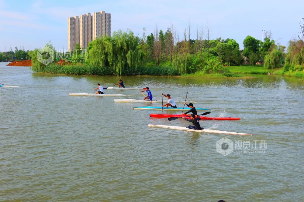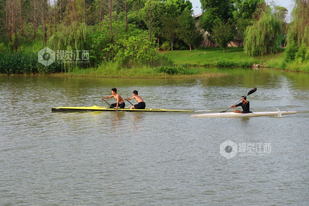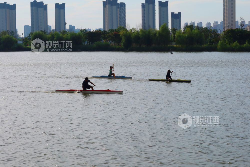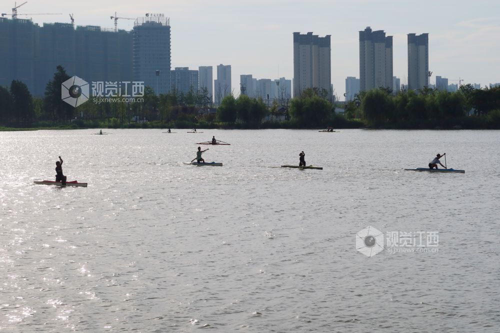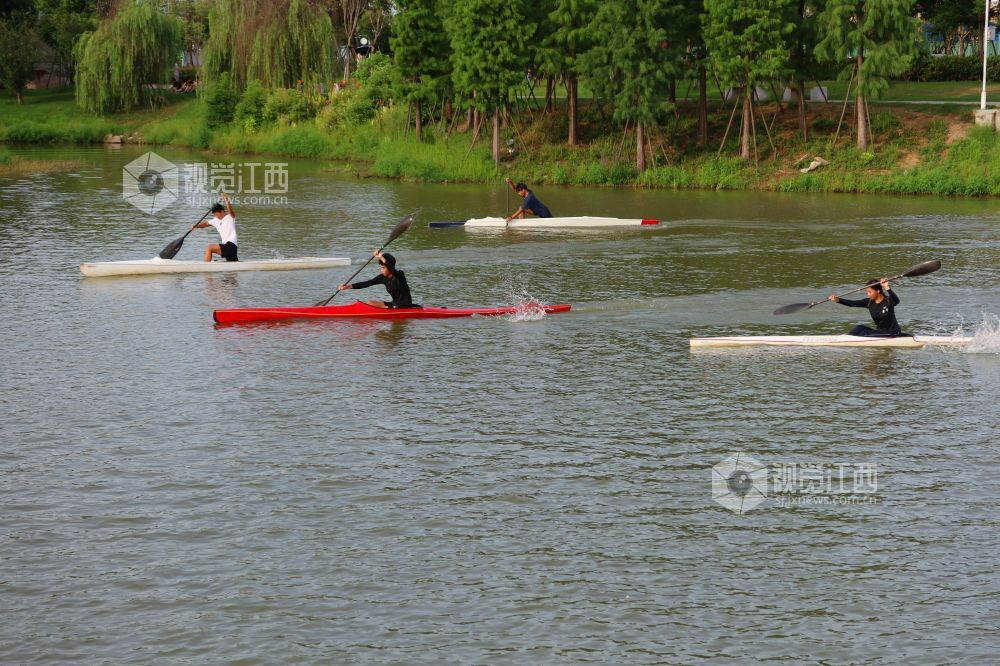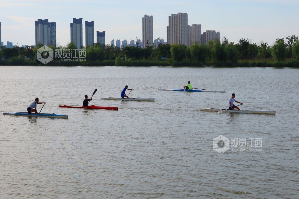 7月12日,位于江西省余干县琵琶湖上的国家高水平体育后备人才水上训练基地,水上运动员正在自我加压、刻苦训练,积极备战全省青少年赛艇、皮划艇锦标赛的比赛,湖面上显现出一片你追我赶、百艇竞渡的美丽画卷。