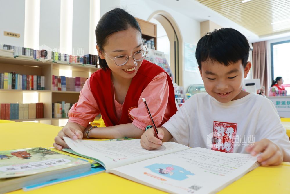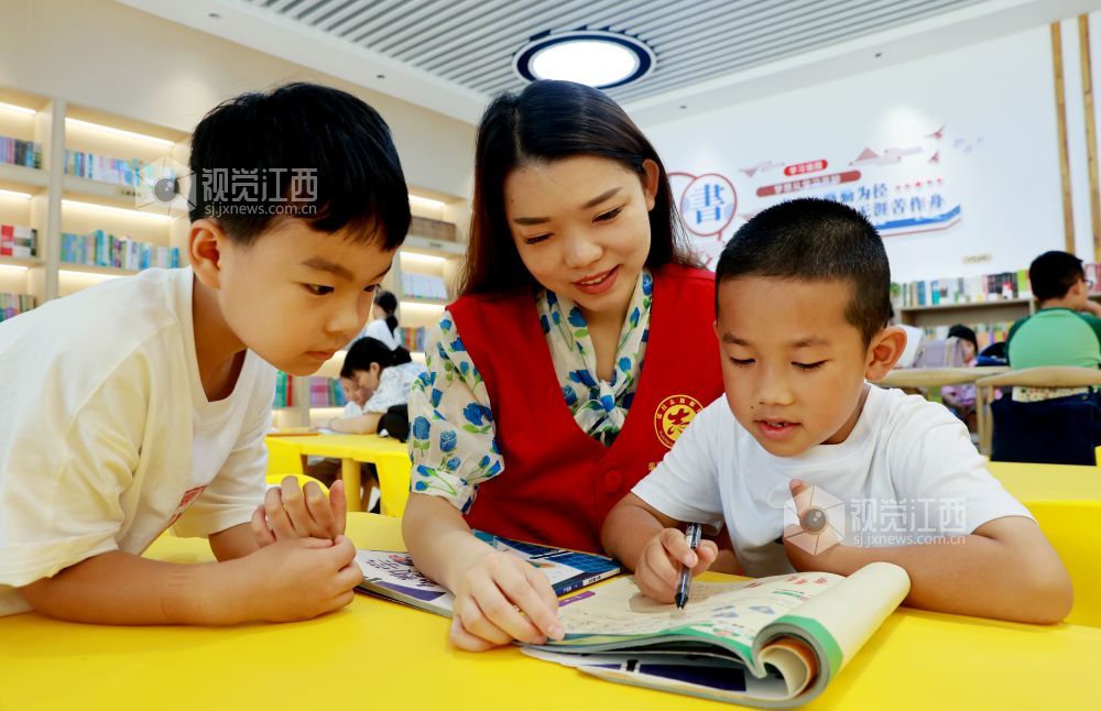 2023年7月13日,江西省瑞昌市新时代文明实践中心城市书房内,学生们在志愿者的陪伴下做作业、阅读书籍。