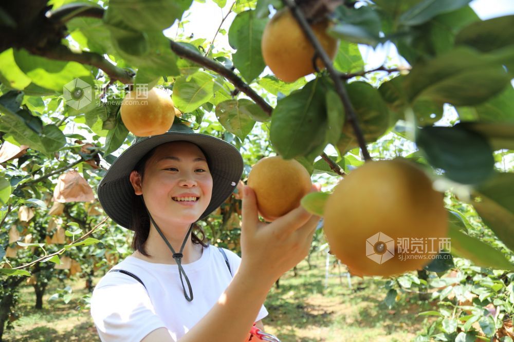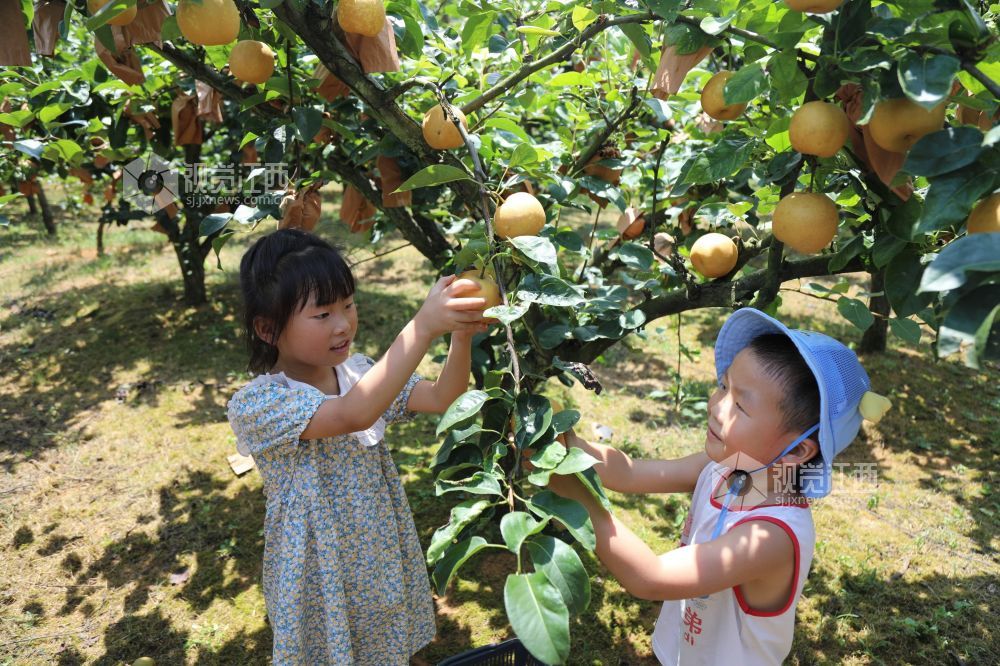 7月13日,江西省莲花县六市乡海潭村满园香果园,一个个褐黄色的翠冠梨挂满了枝头,飘出诱人的果香。游客穿梭其间,开心采摘。