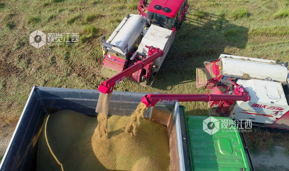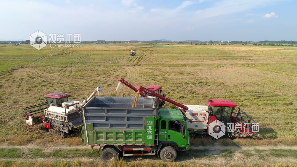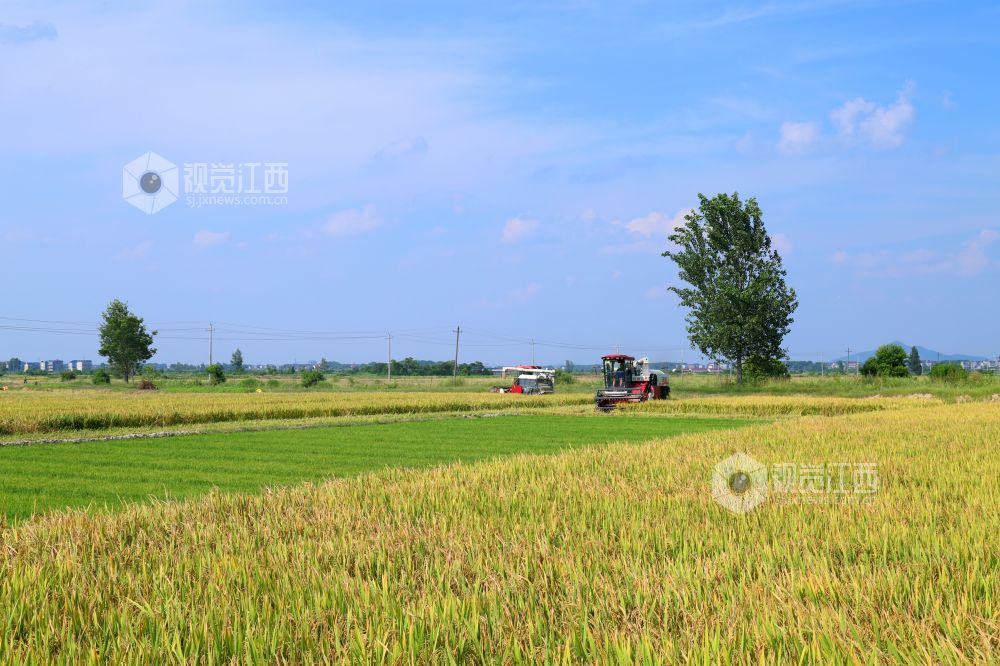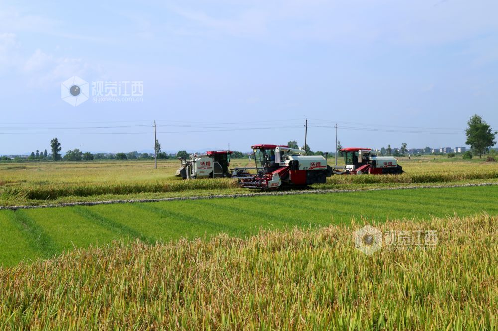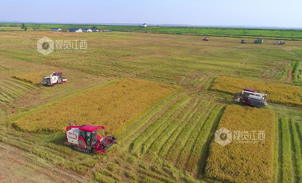 盛夏时节,江西省鄱阳县鸦鹊湖乡三万余亩早稻进入收割期,放眼望去金稻穗浪、芳香四溢。